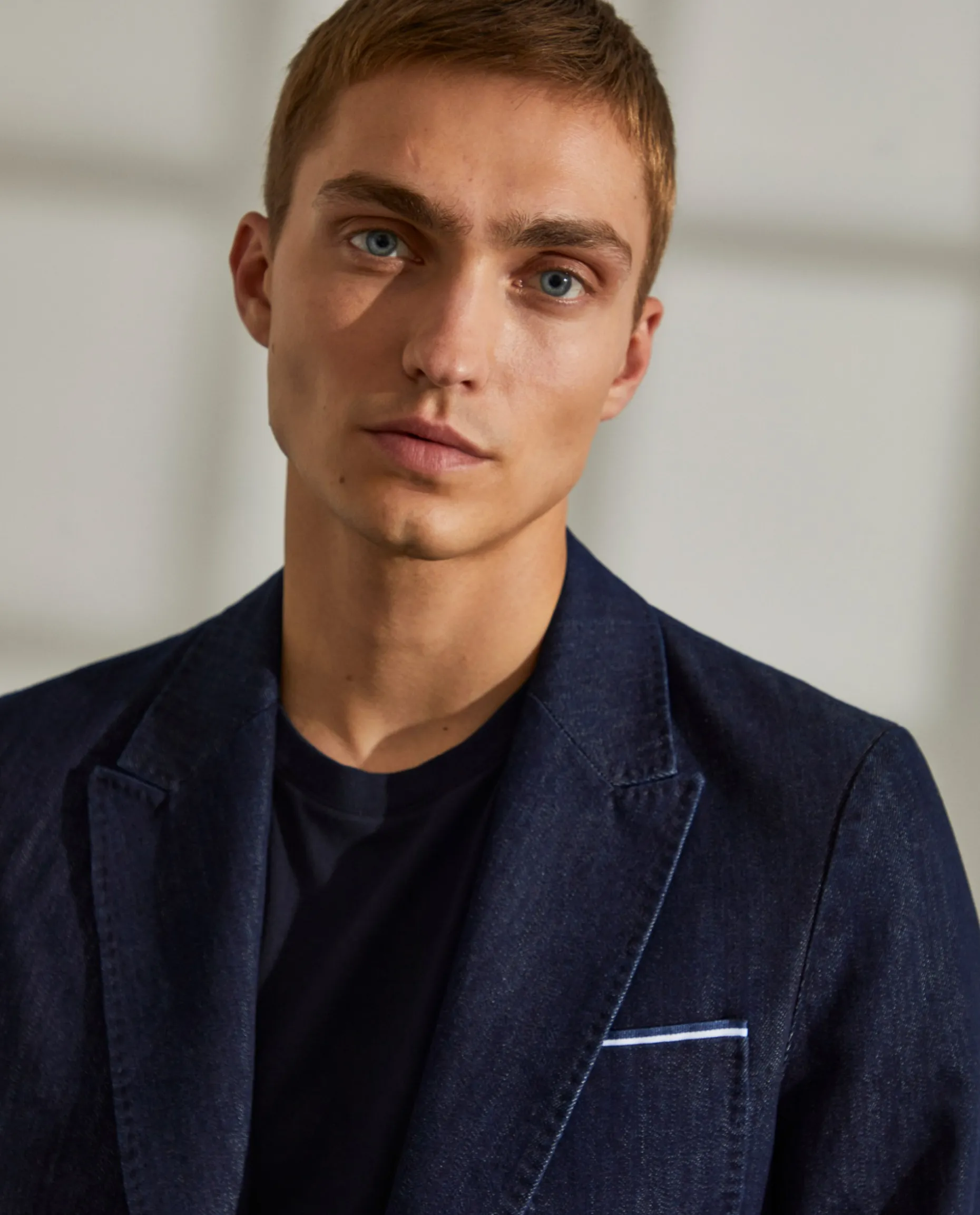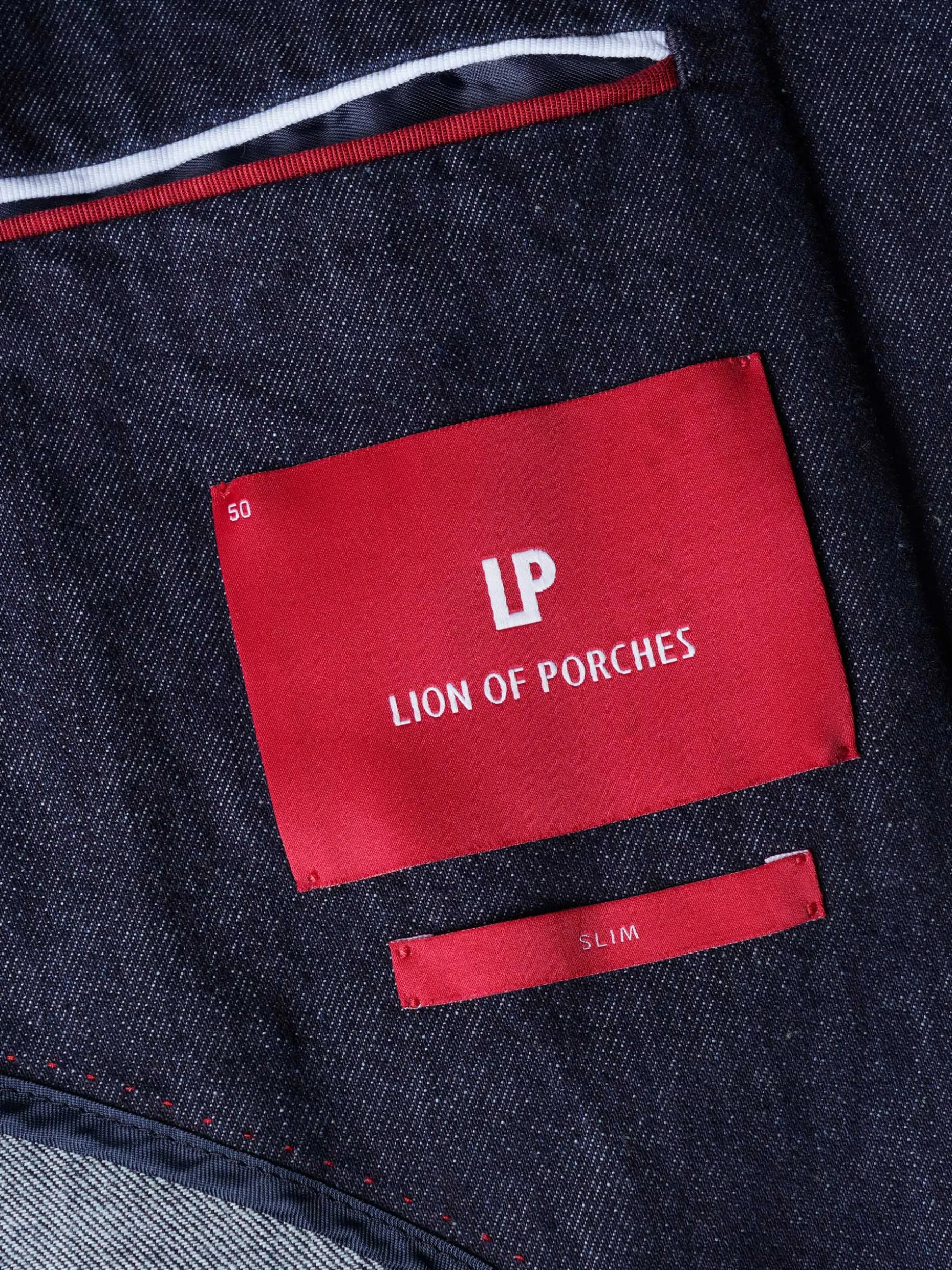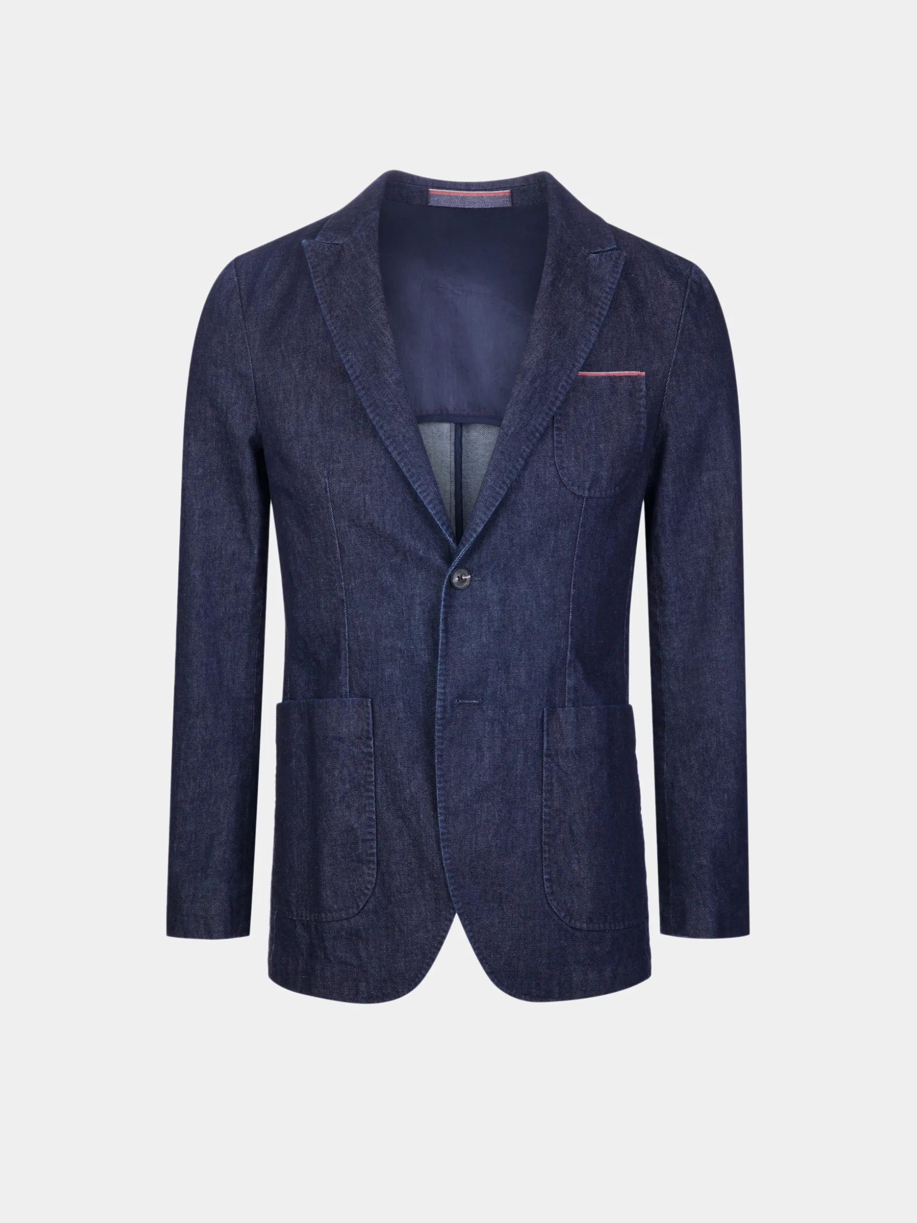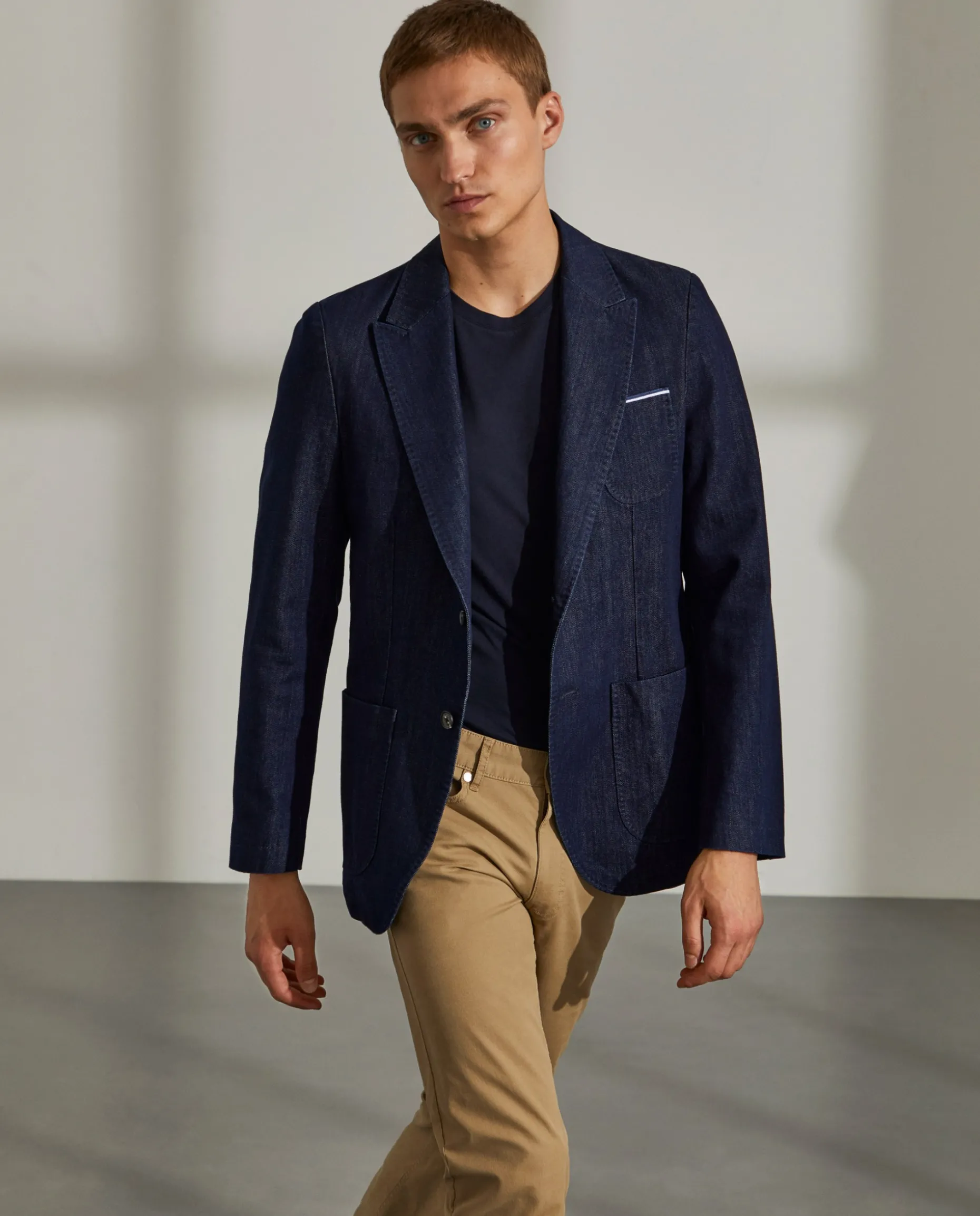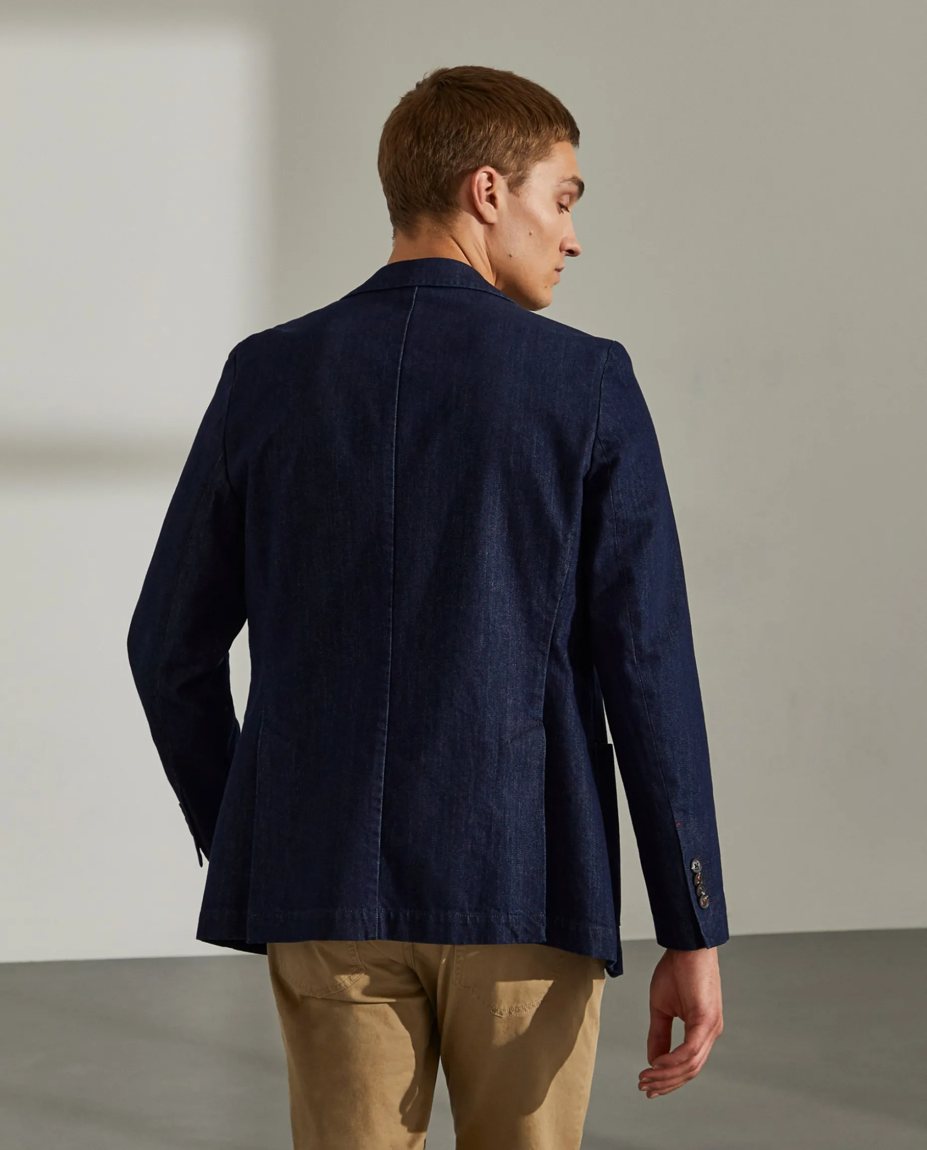 Blazer slim fit. Confecionado em denim 100% algodão. Meio forro. Bolso no peito com risca bicolor. Dois bolsos na frente. Aperta com botões personalizados. Duas aberturas na parte posterior. Três bolsos interiores.