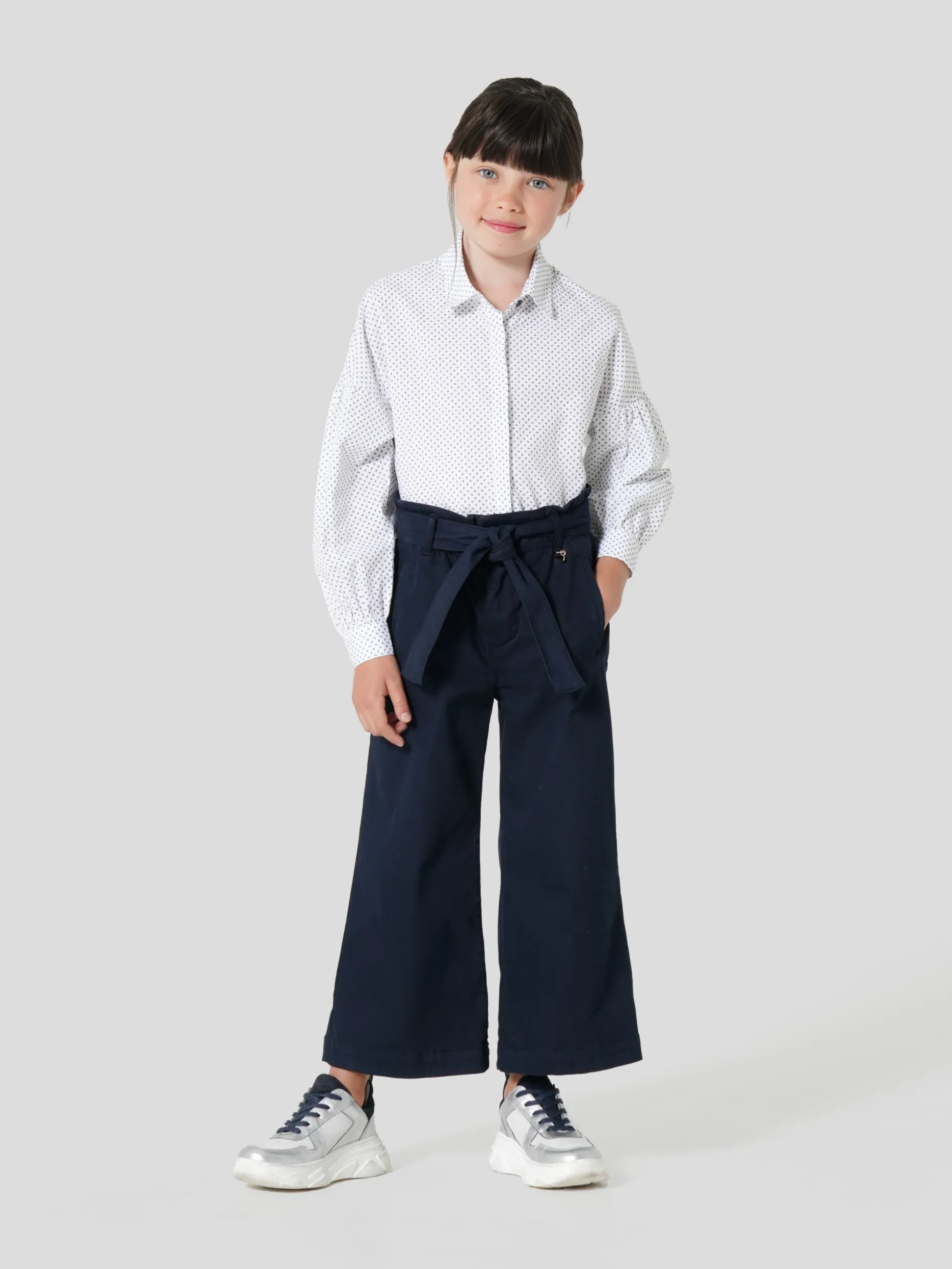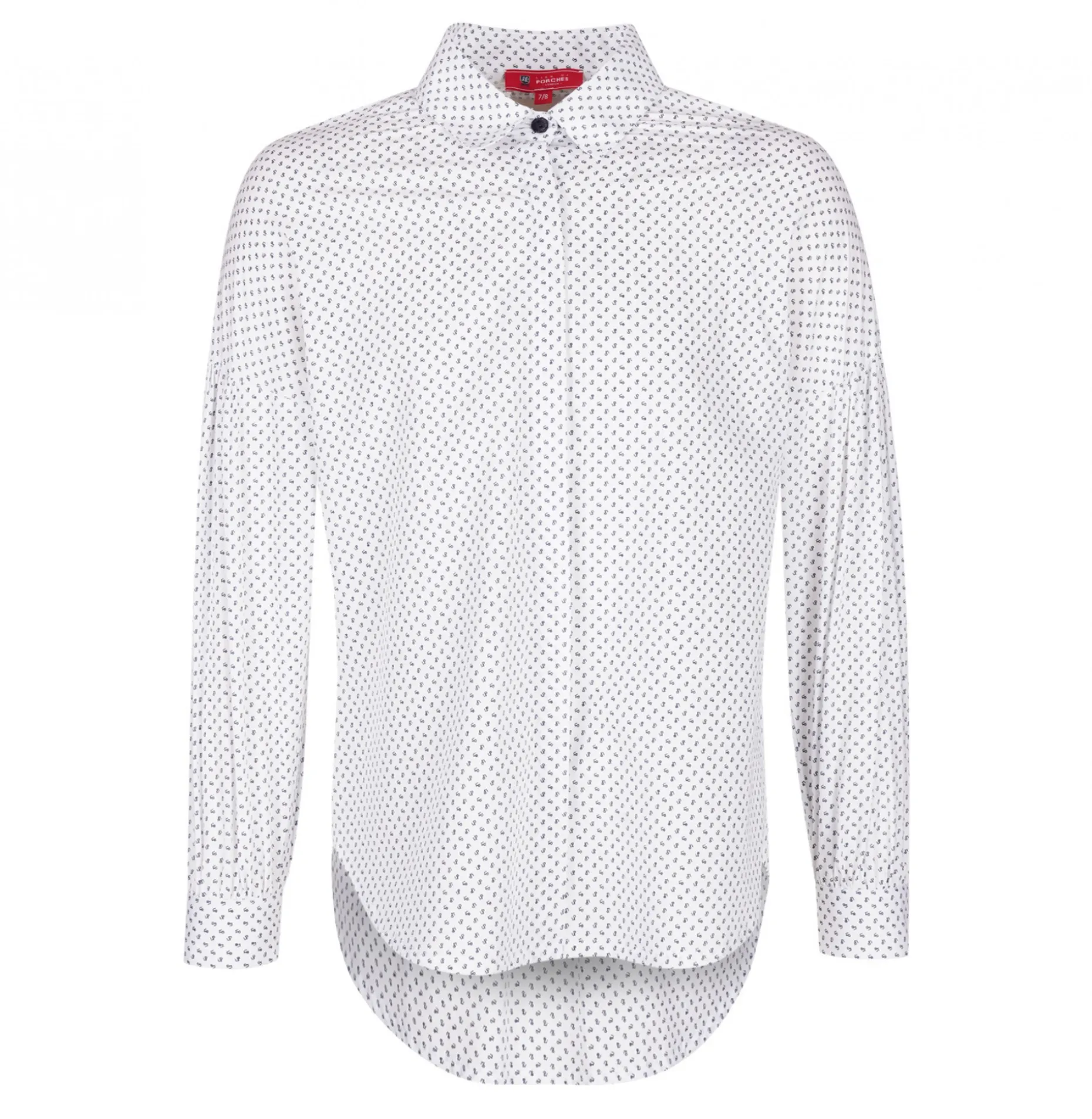 Blusa em popeline de algodão com micromotivo personalizado “LP”. Ombros descaídos e mangas franzidas. Base arredondada, aperta com botões e tem um macho nas costas.