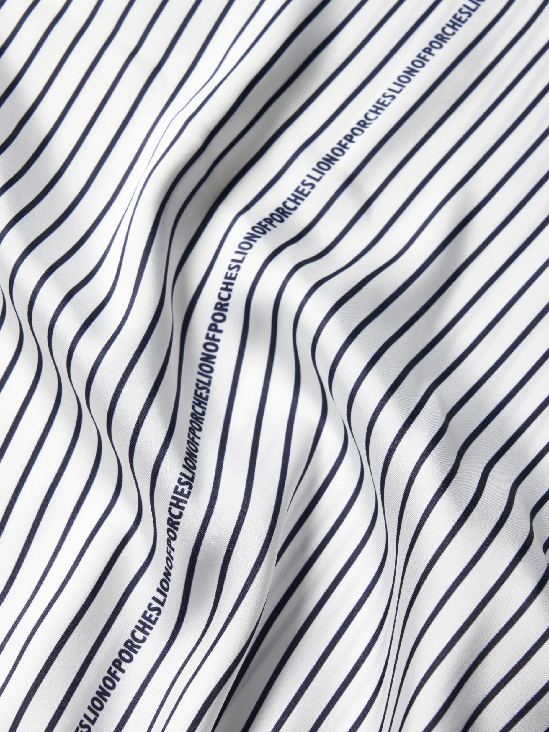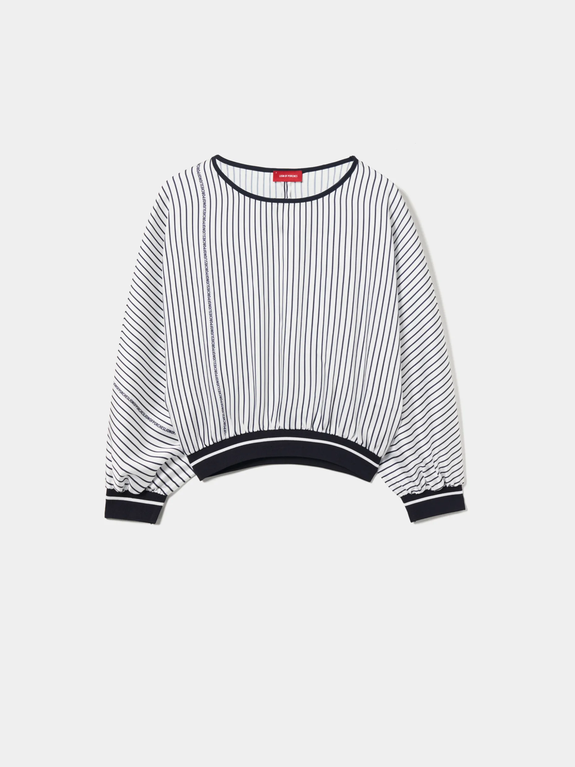 Blusa fluida, com padrão de riscas verticais e pormenor Lion of Porches. Com decote redondo e manga morcego abalonada. A cintura e os punhos são em malha canelada elástica, em contraste de cor.