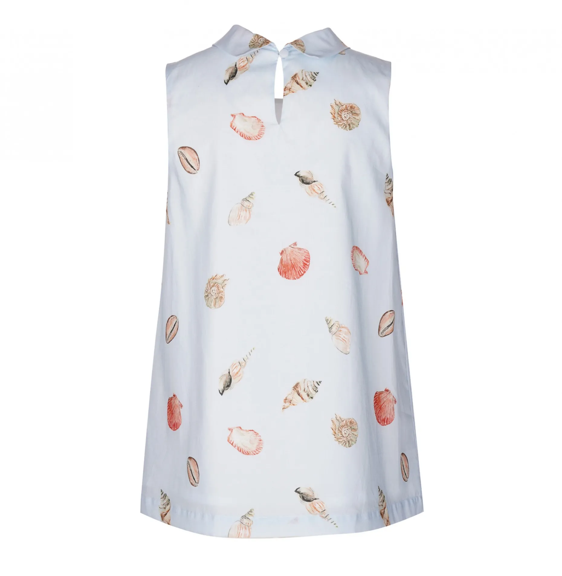 As meninas vão adorar esta blusa em voile com estampado de conchinhas inspirada nos passeios à beira-mar. Forrada, ligeiramente evasé, gola dobrada levantada e fecho em lágrima nas costas. Personalizada com pequena placa metálica «LP» na frente. Complete o look com calções ou calças bege, acessórios de cabelo do mesmo padrão, colar de búzio e bolsinha