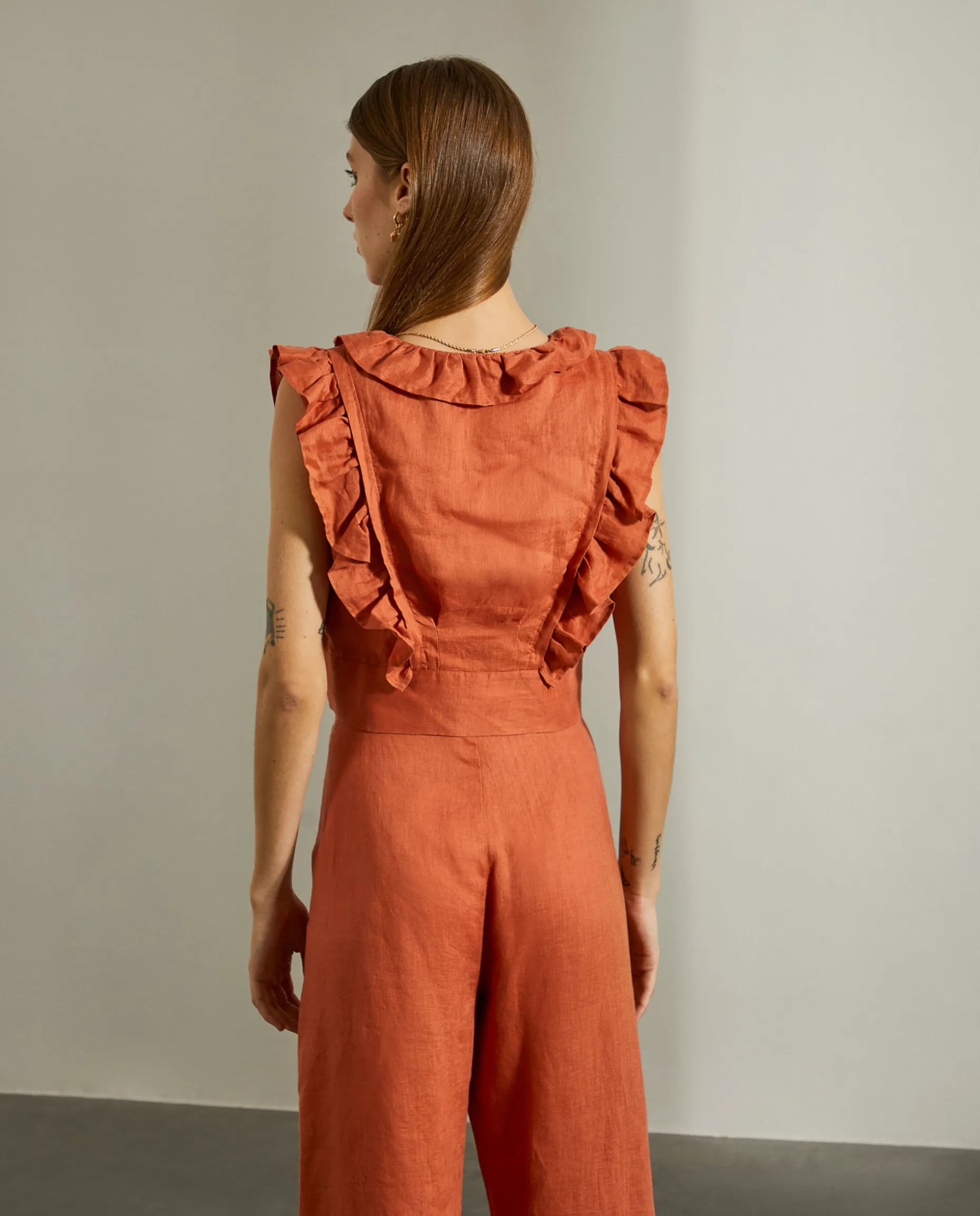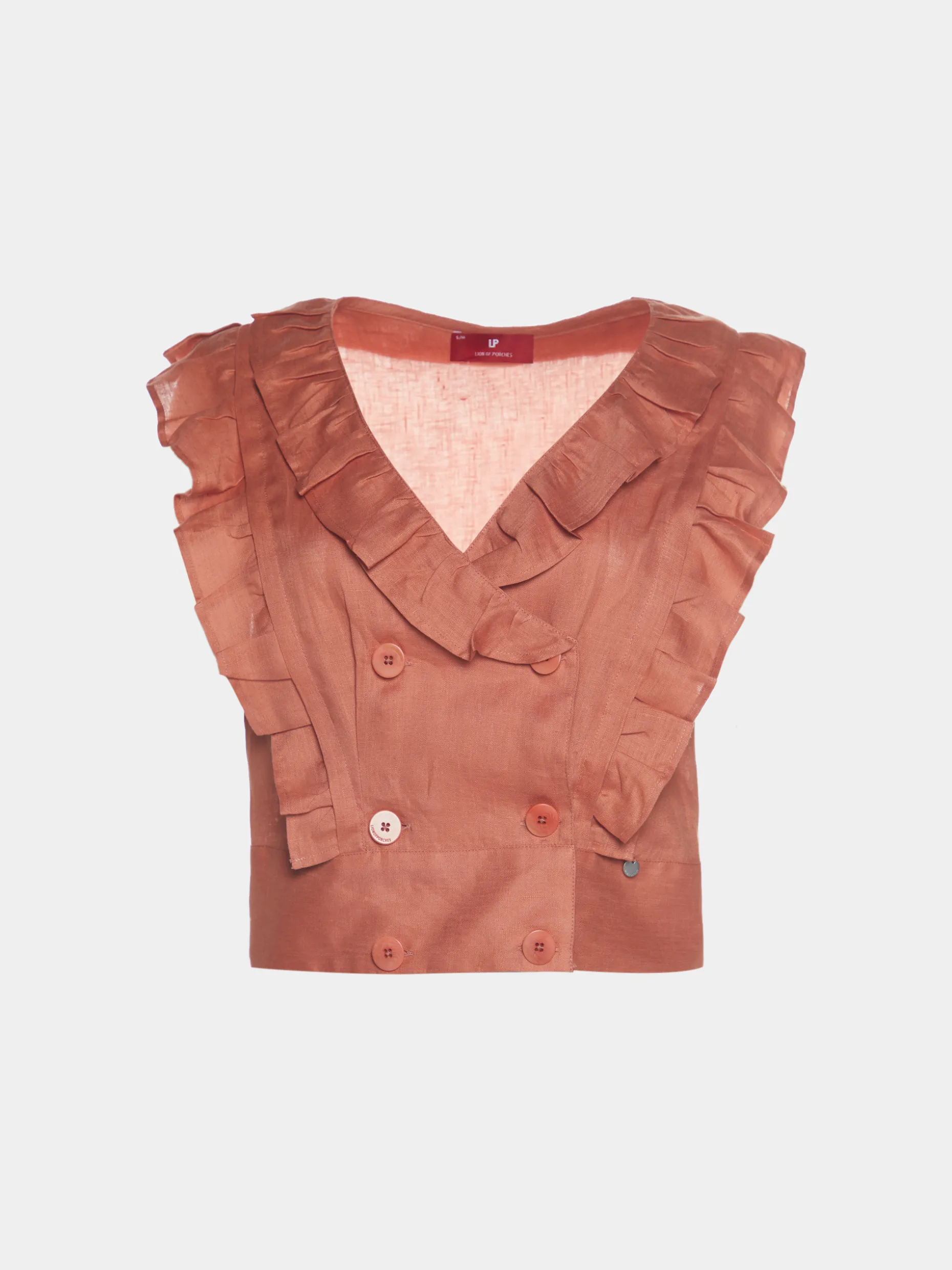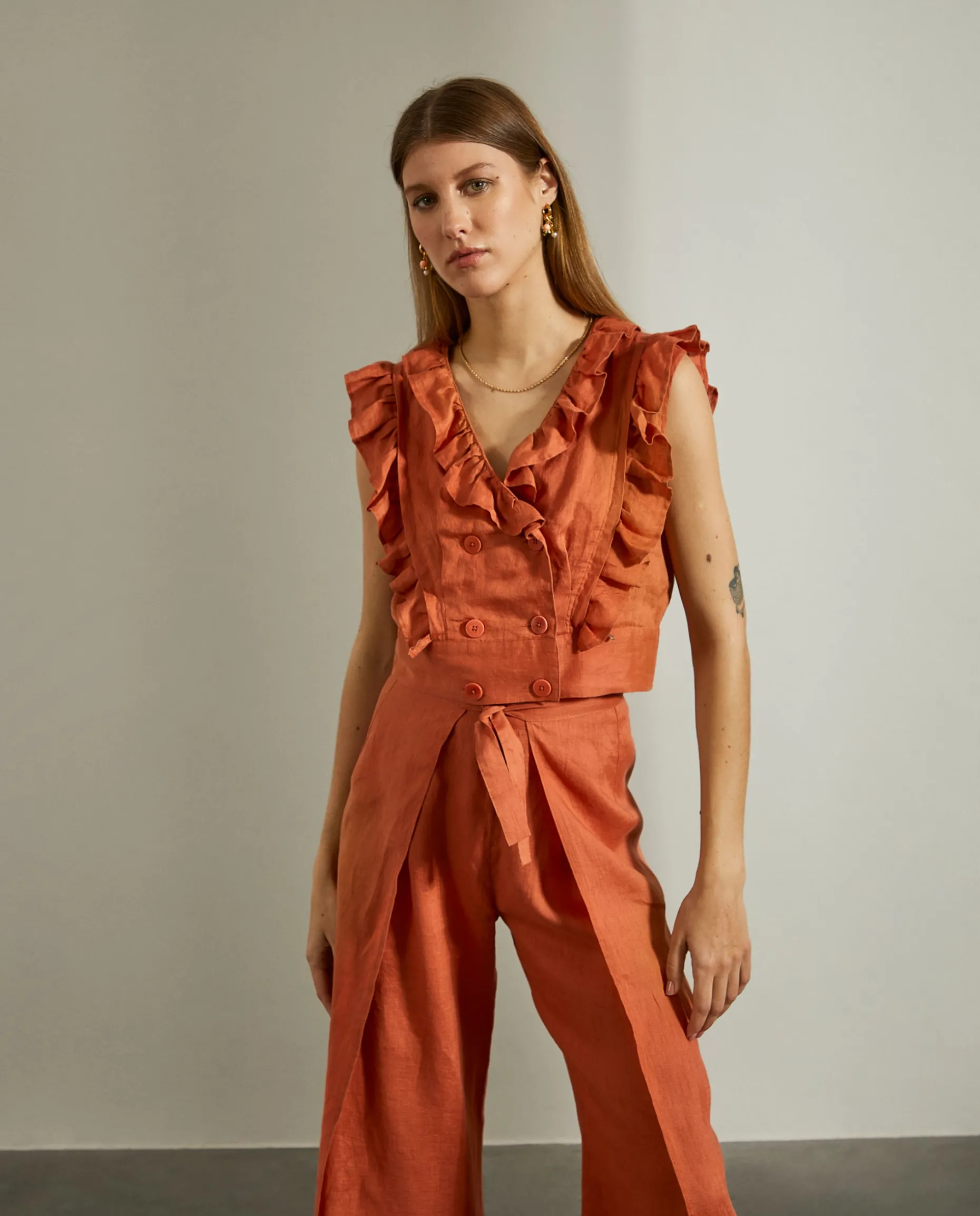 Blusa curta, sem mangas e com folhos, de decote em V de trespasse. Possibilidade de calças a combinar. Confecionada em 100% linho.