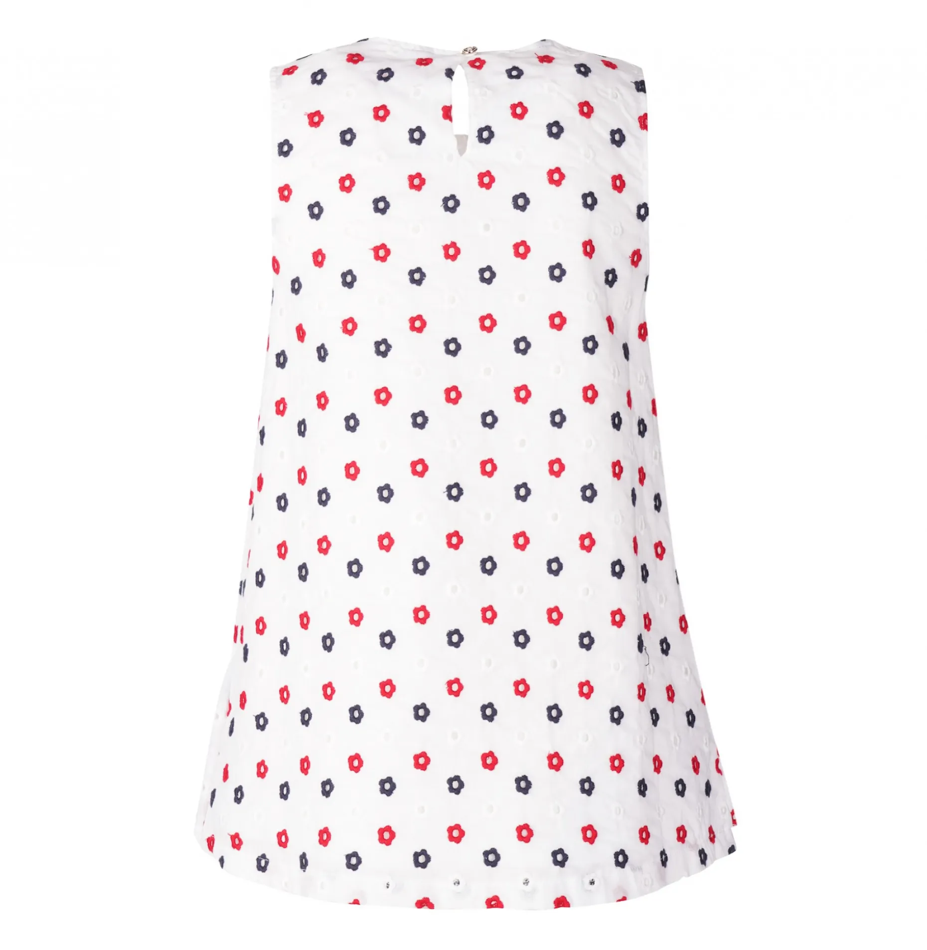 Blusa branca, sem manga, em tecido de flores bordadas a branco, marinho e vermelho, com folho na base. Forrada. Fecho em lágrima nas costas. Personalizada com pequeno coração metálico «LP» no folho, à frente. Complete o look com acessório de cabelo do mesmo padrão.