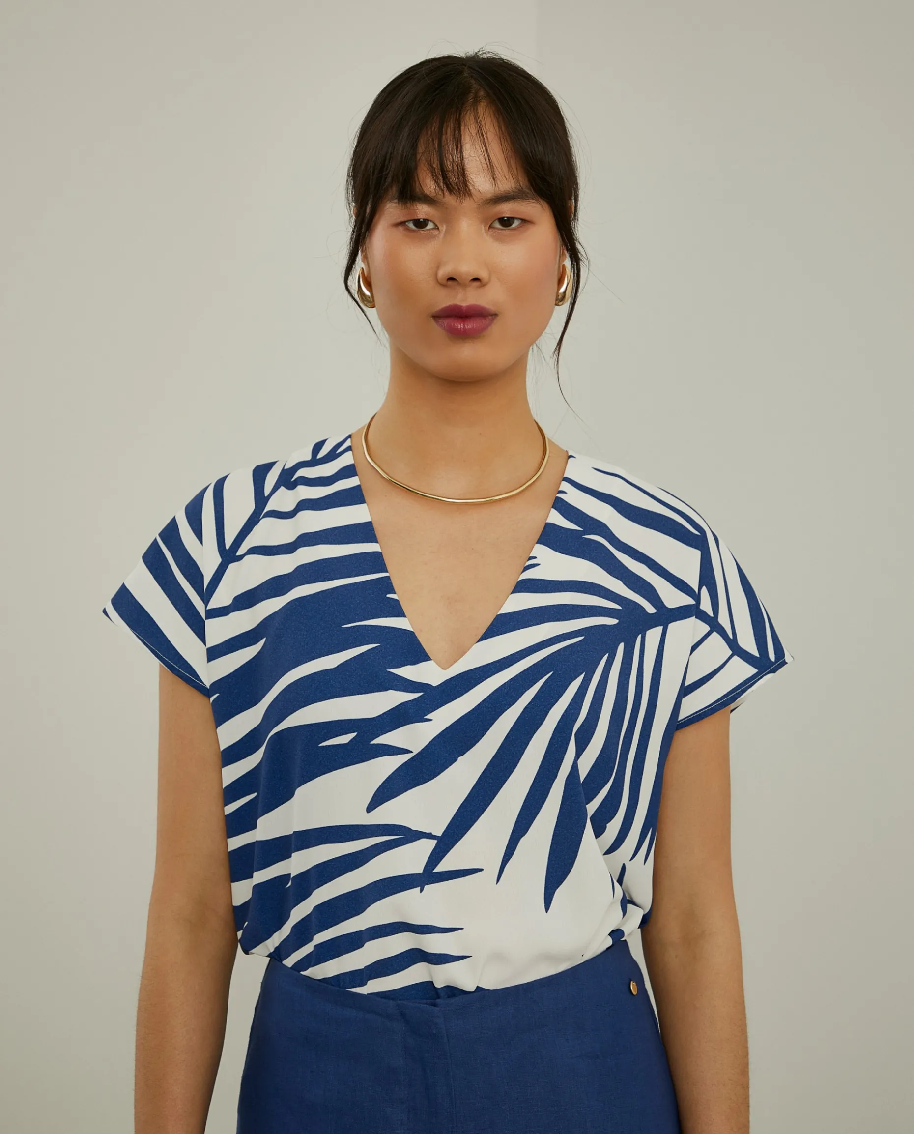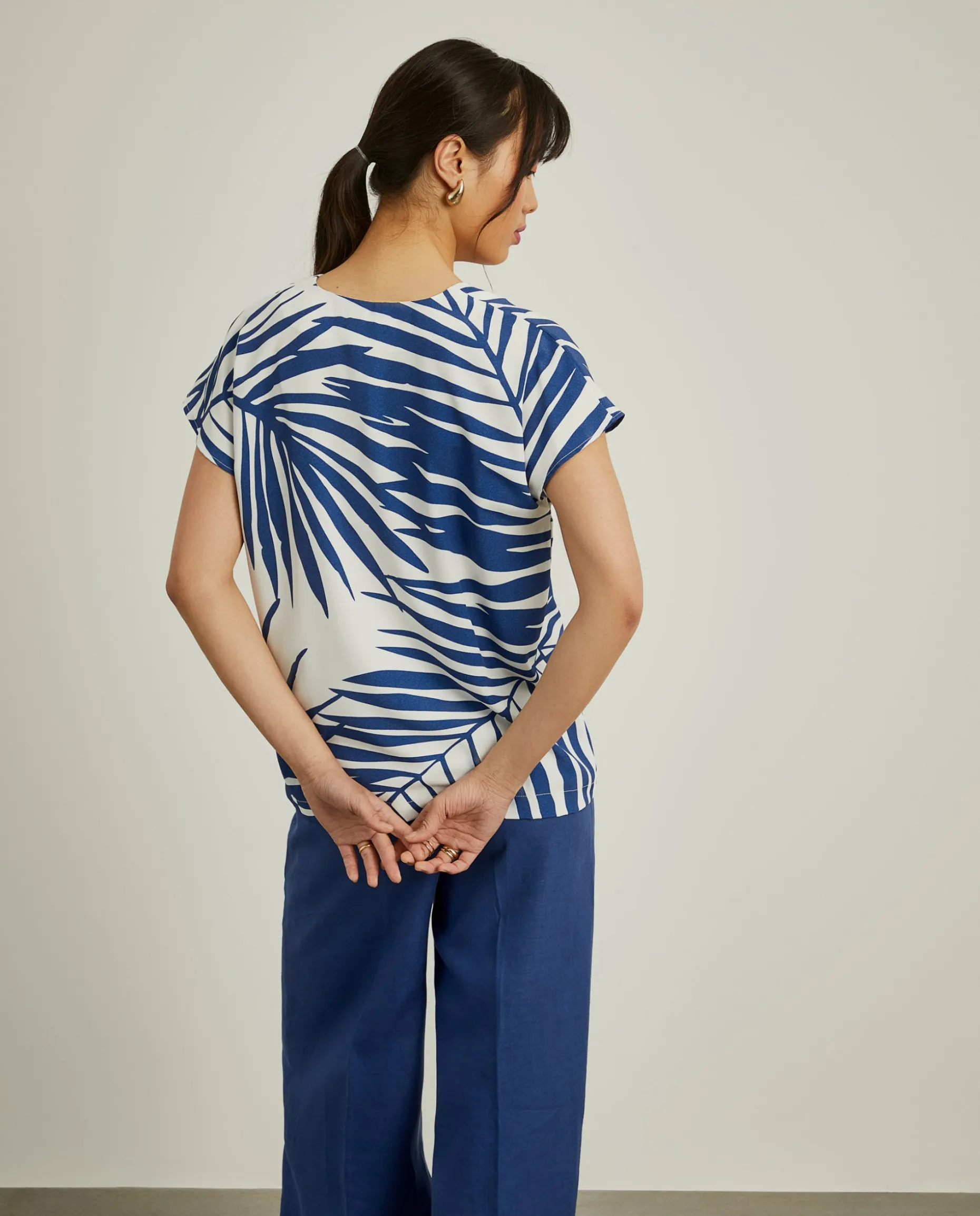 Blusa fluida, de manga curta, com padrão de folhas de palmeira. O decote é em V.
