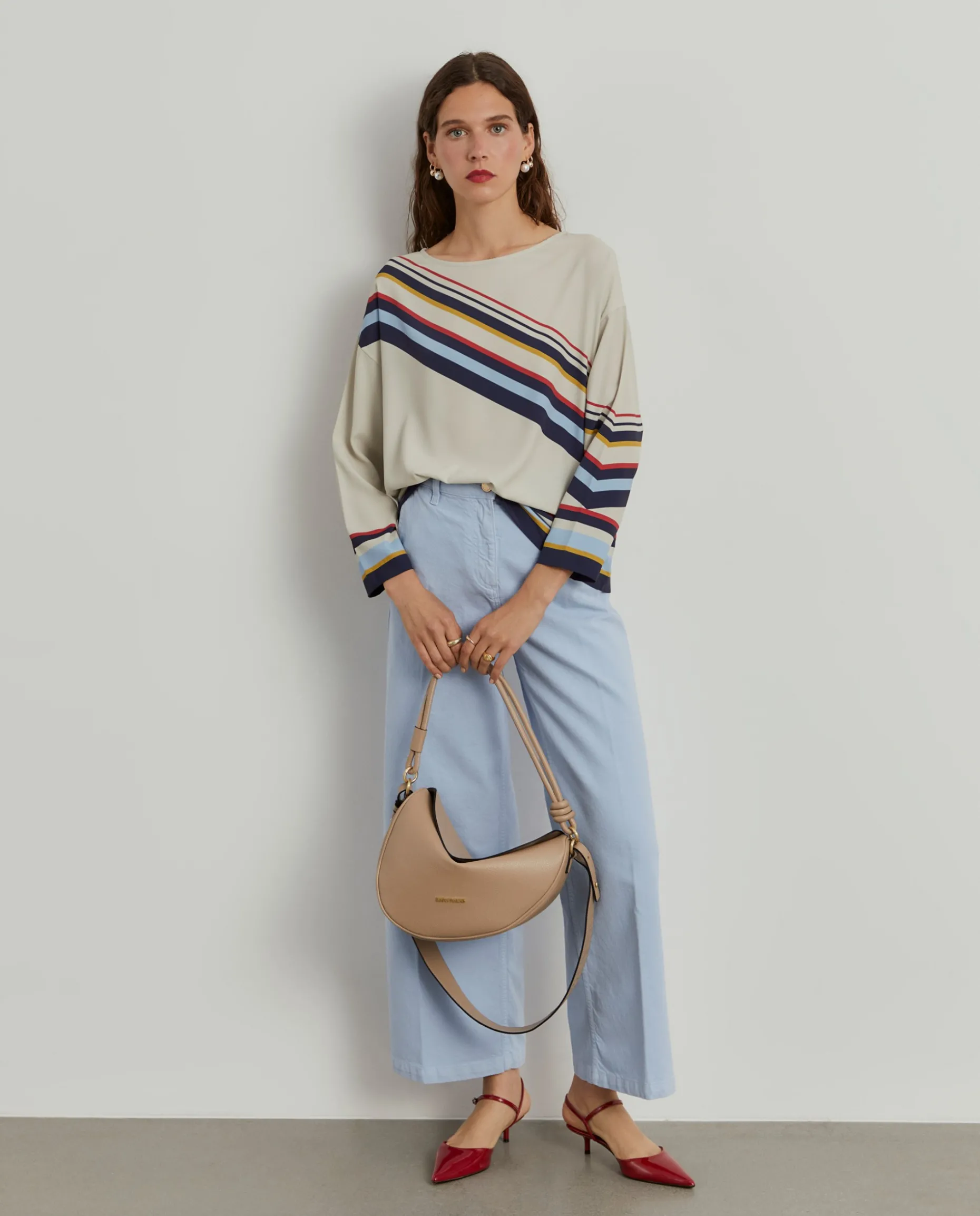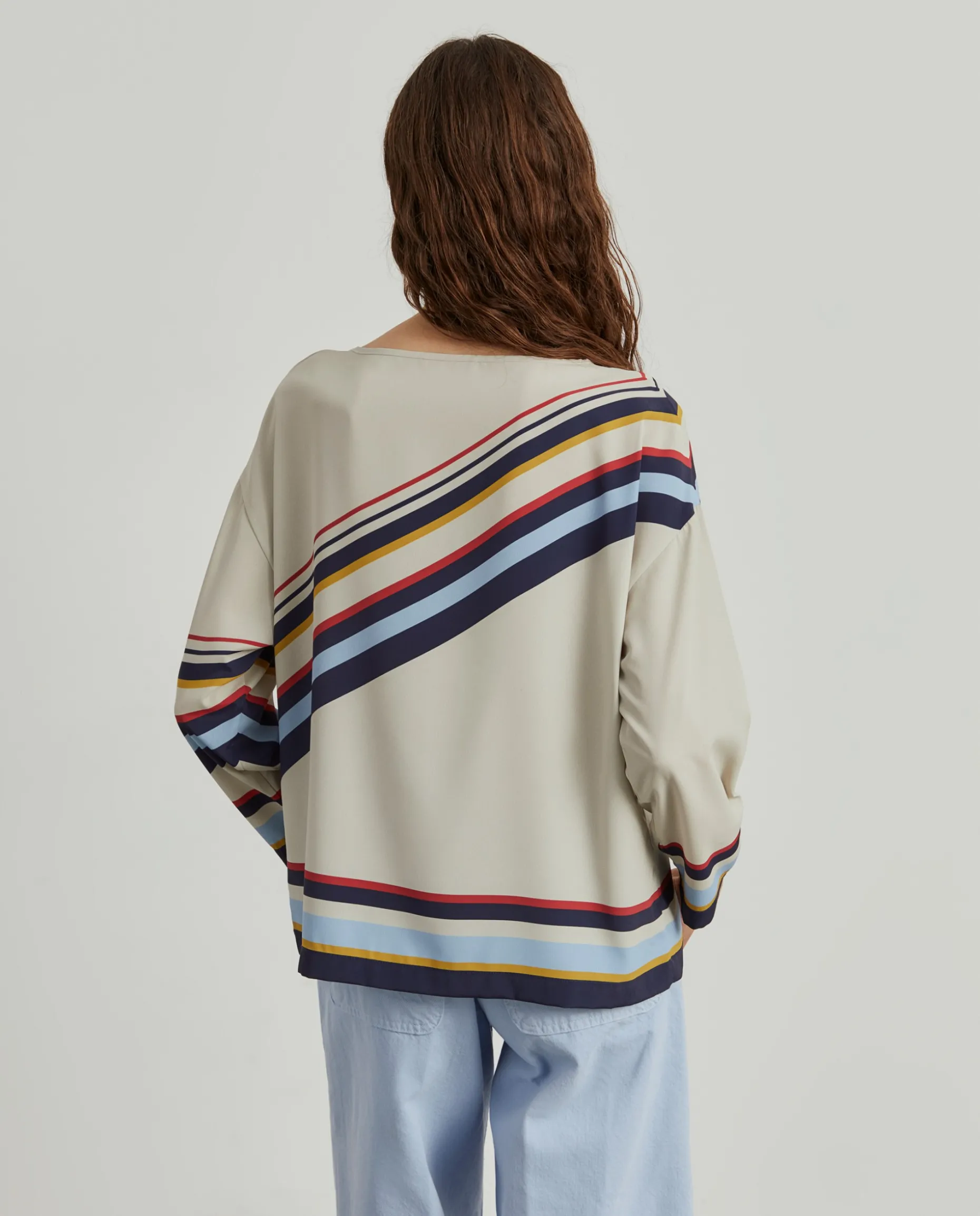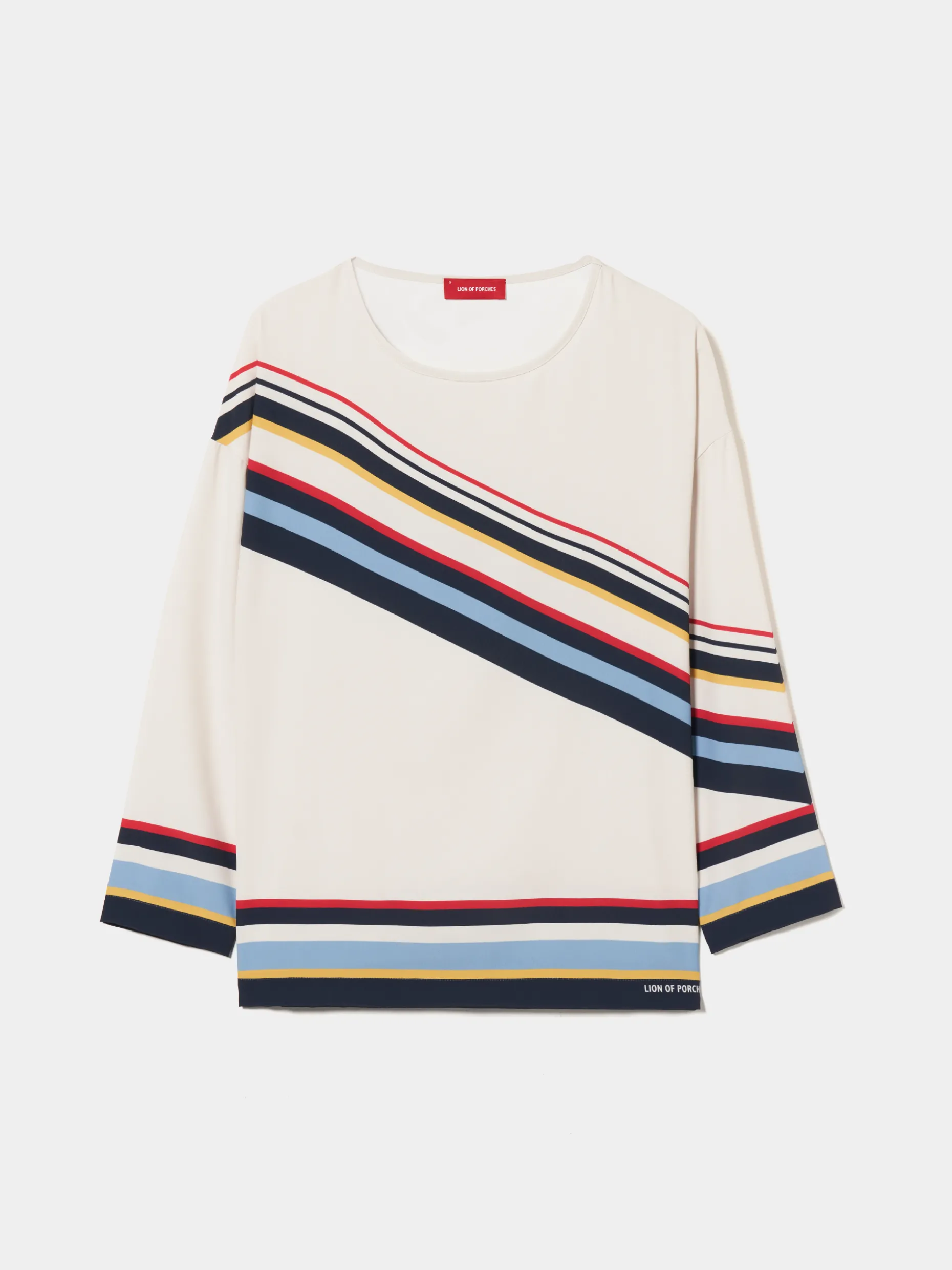 Blusa fluida, de manga comprida, com riscas coloridas diagonais e horizontais. Decote redondo.