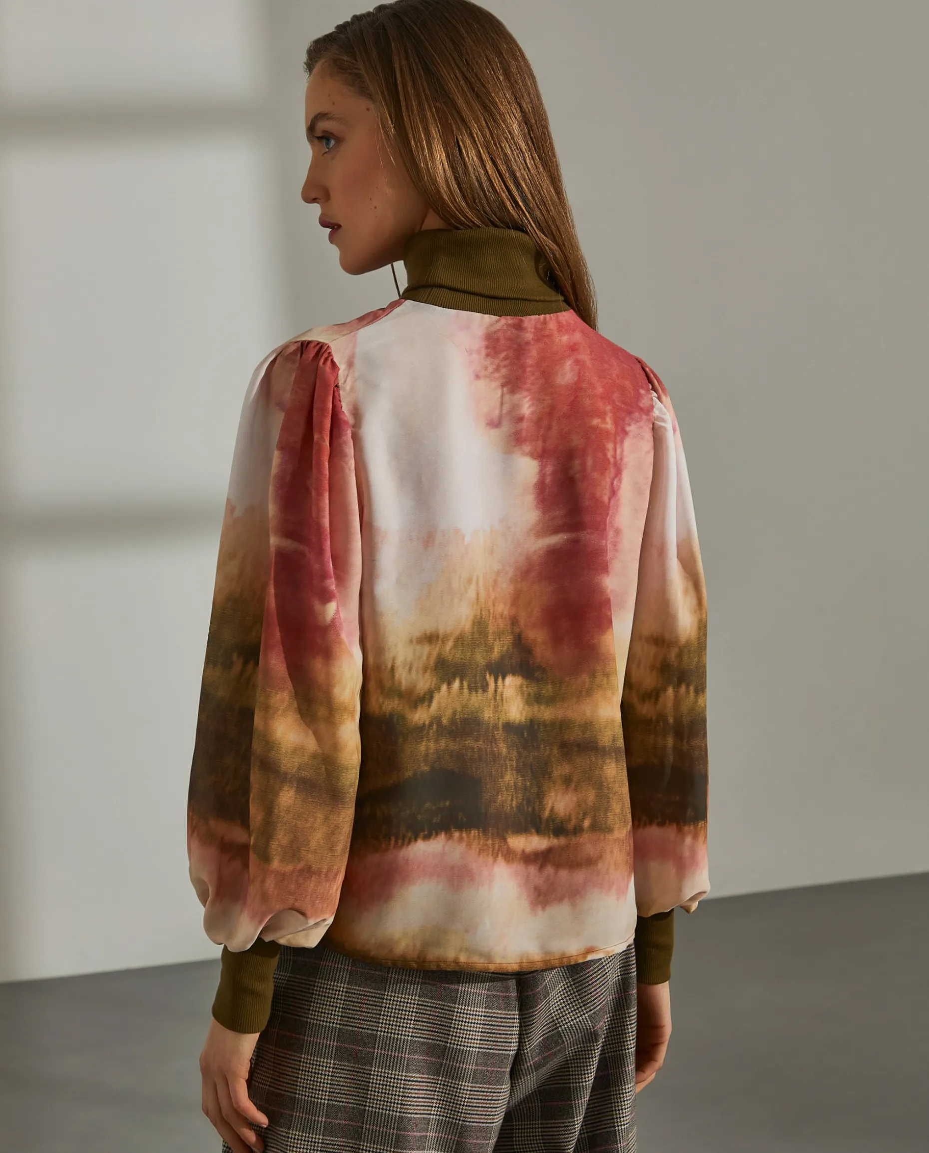 Dê cor ao seu outfit com esta romântica blusa de manga comprida com padrão abstrato. A gola alta e os punhos são em malha canelada e contraste de cor.