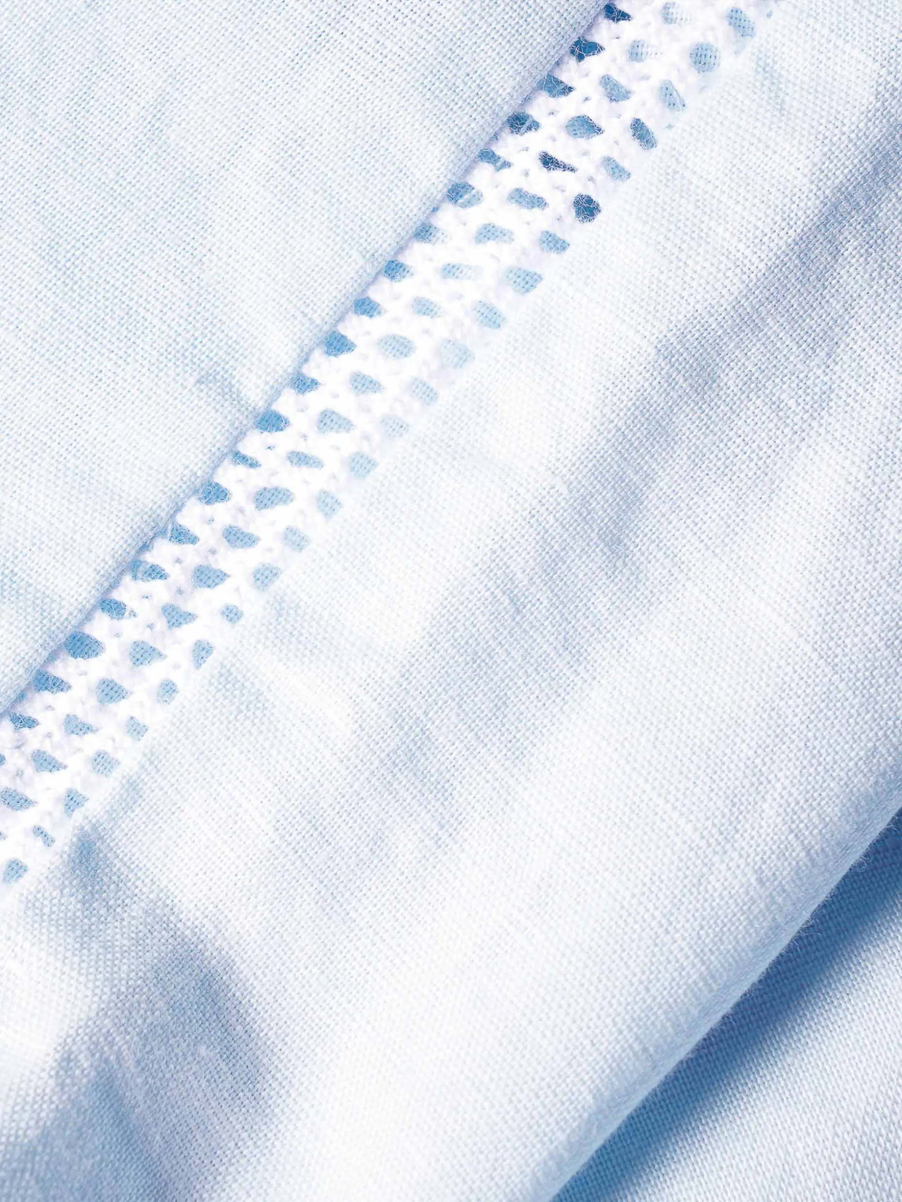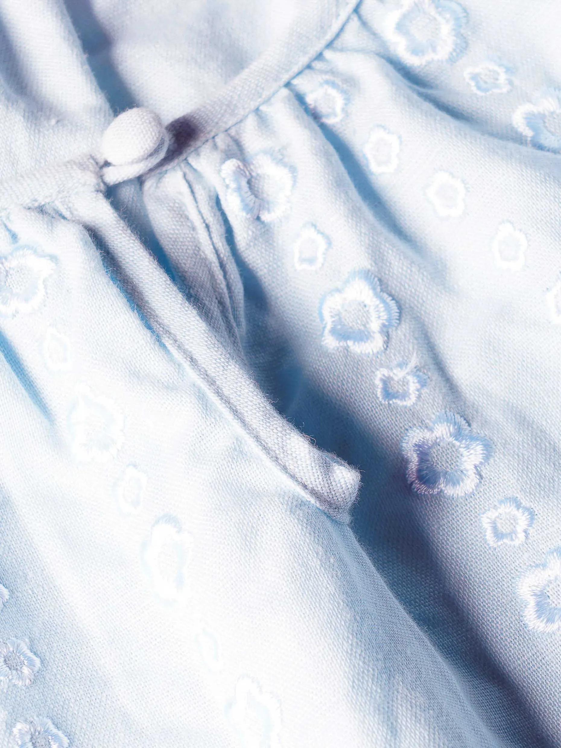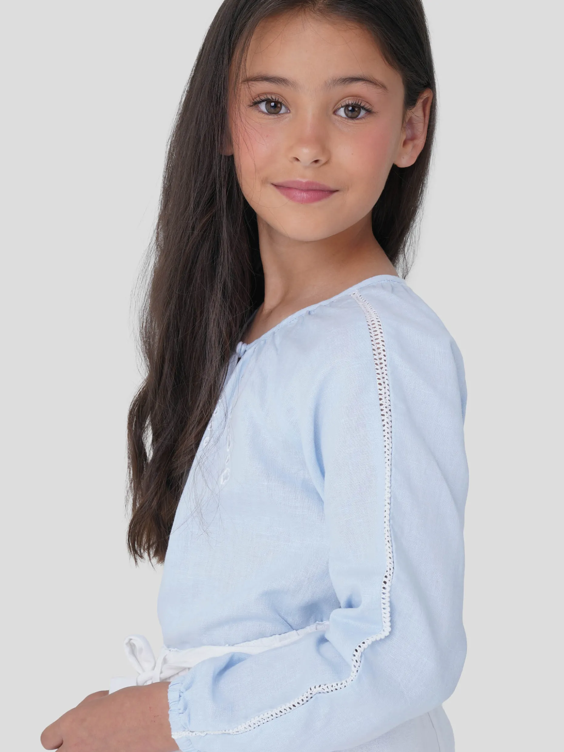Os bordados na frente, a renda aplicada ao longo da manga e a bainha aberta na base conferem delicadeza a esta blusa. Mangas compridas, bainha arredondada, ligeiramente evasé e fecho à frente com botão forrado. Confecionada numa leve e fresca mistura com linho, personalizada com pequeno coração metálico