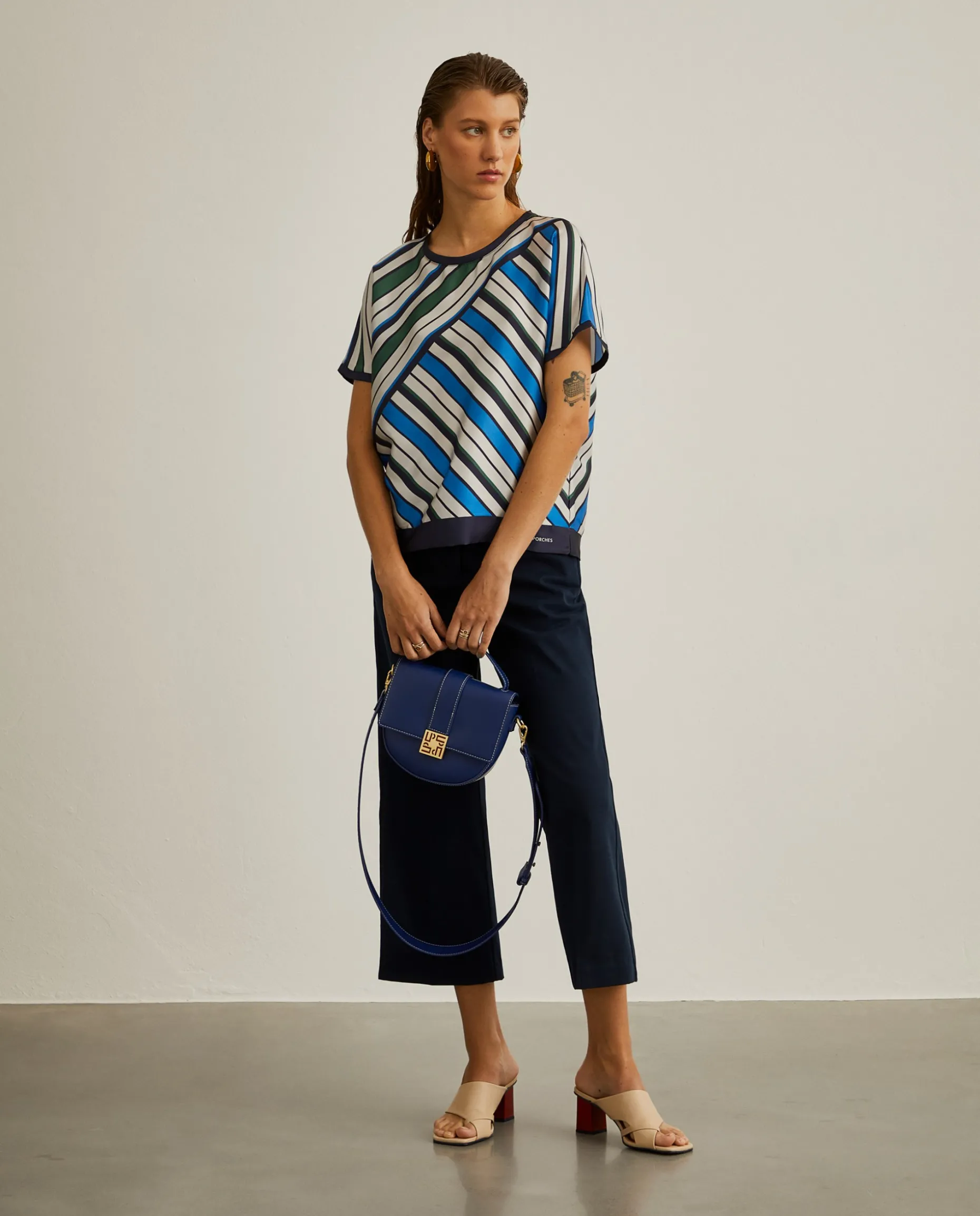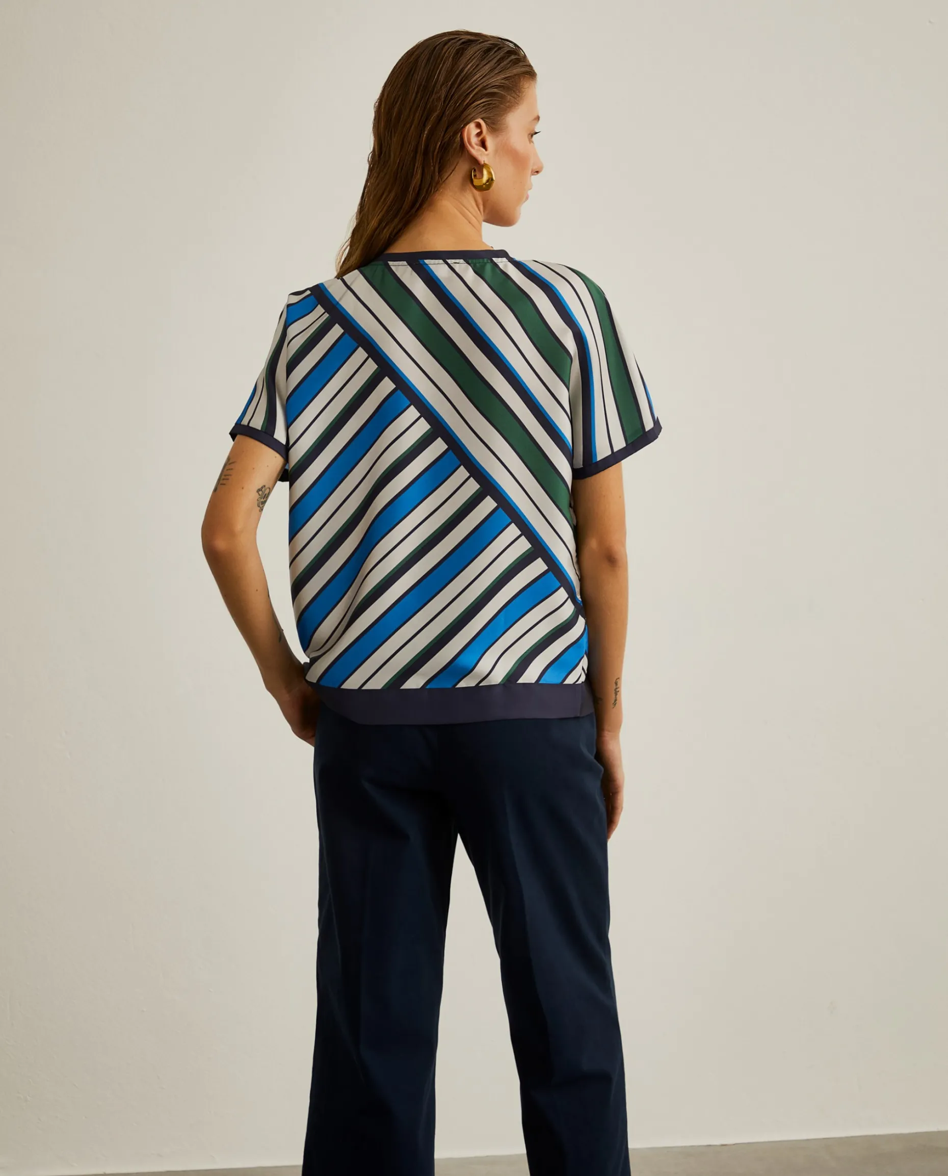 Blusa fluida de manga curta com motivo de riscas cruzado colorido. Base, manga e gola a contraste. Uma boa escolha para manter o outfit elegante num dia mais descontraído.