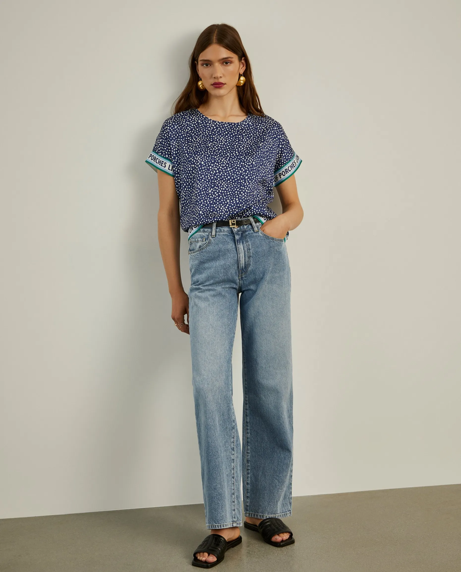Blusa de manga curta com padrão de pintas por toda a peça. Finaliza com barras em contraste nos punhos e base com logotipo Lion of Porches em contraste.