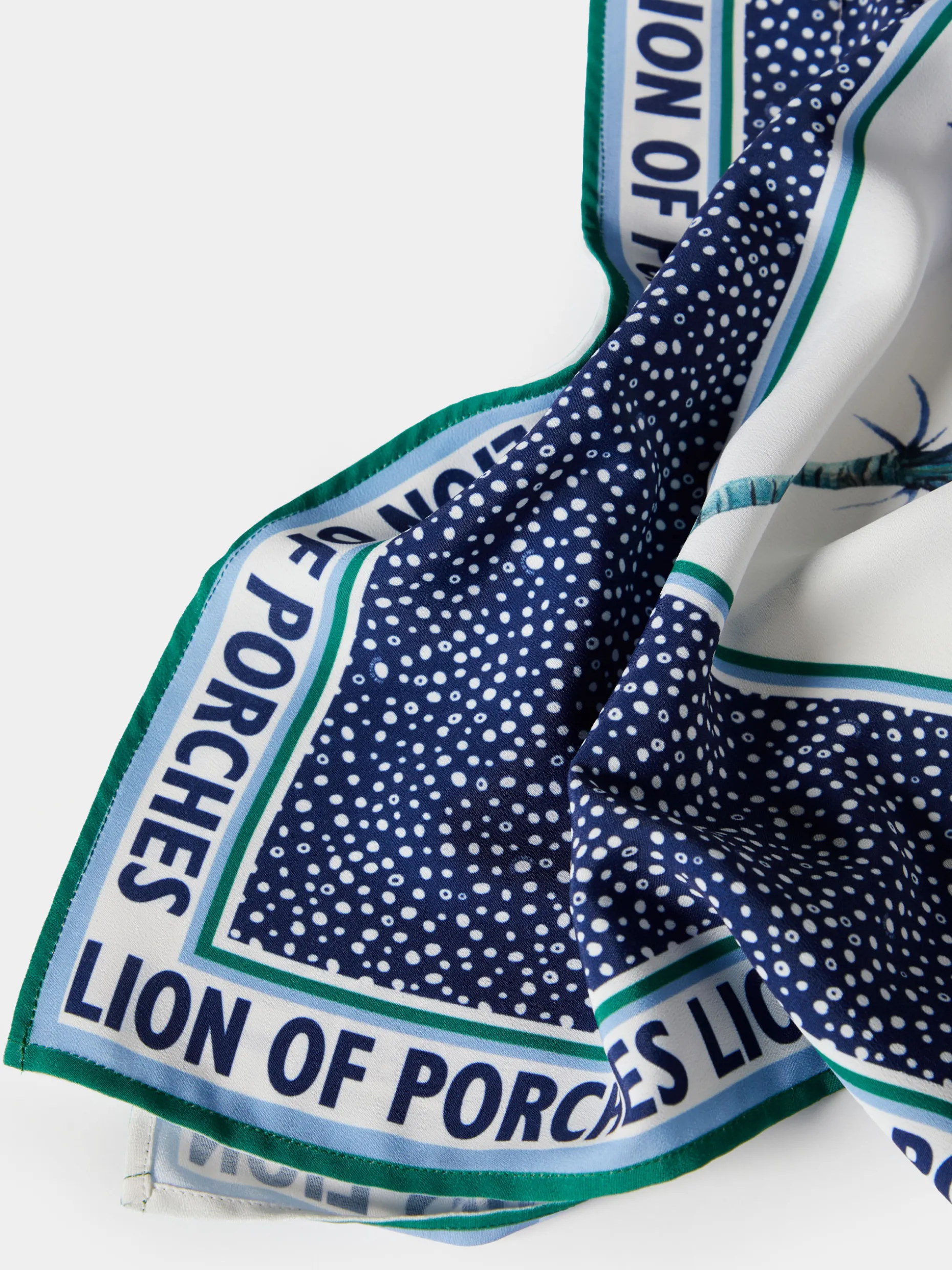 Blusa poncho, leve e fluida, com padrão de palmeiras e polka dots por toda a peça. Finaliza com logotipo Lion of Porches nas extremidades. O decote é em V.