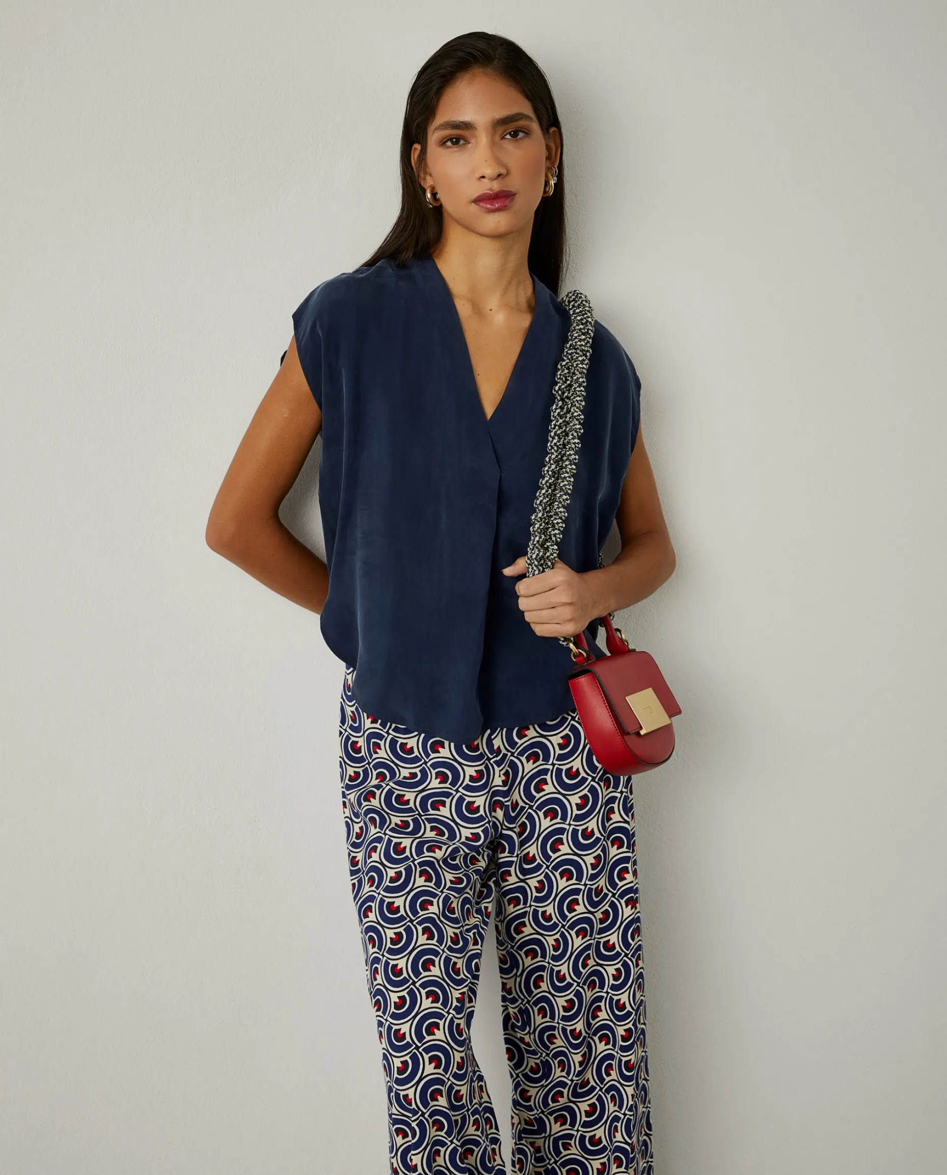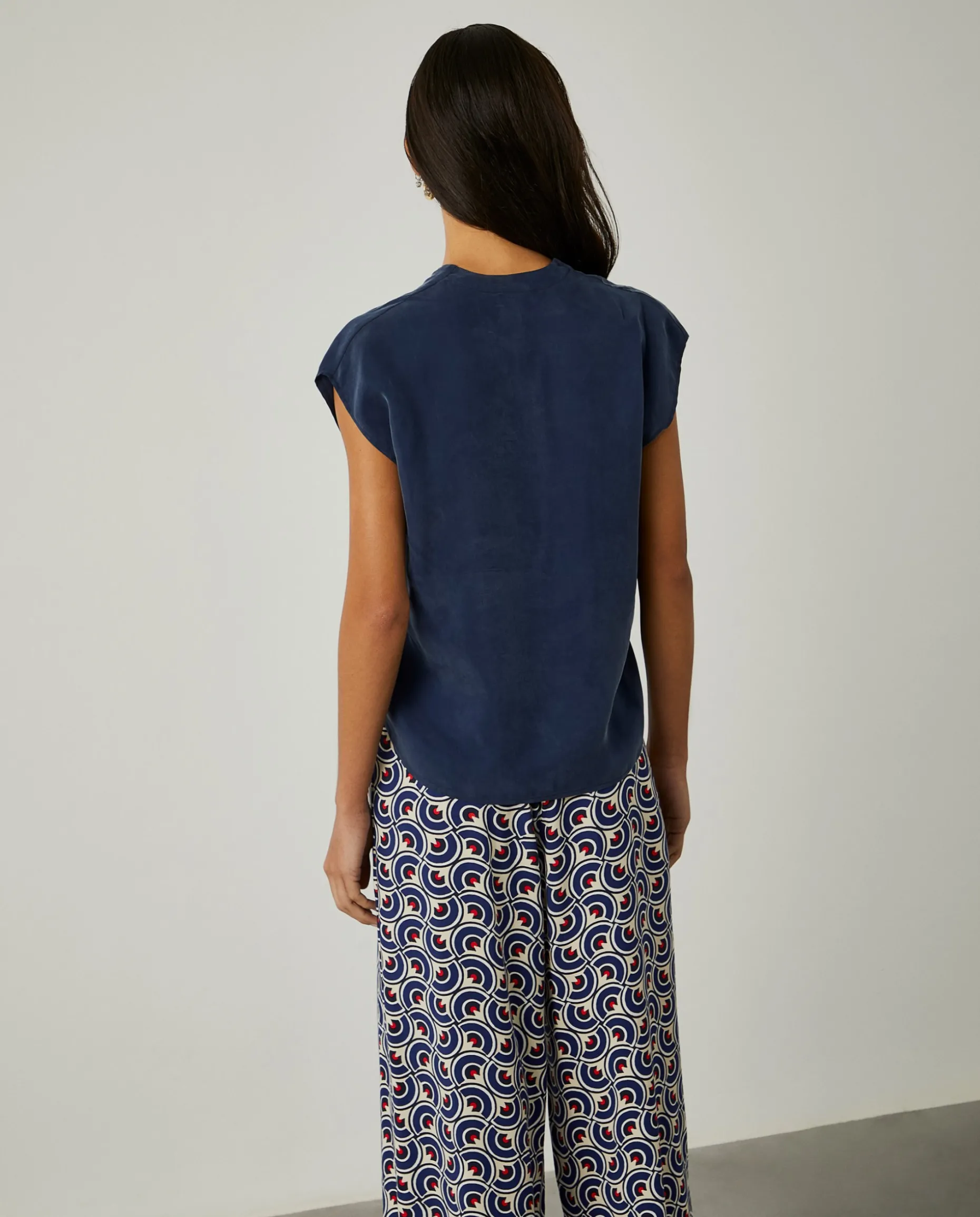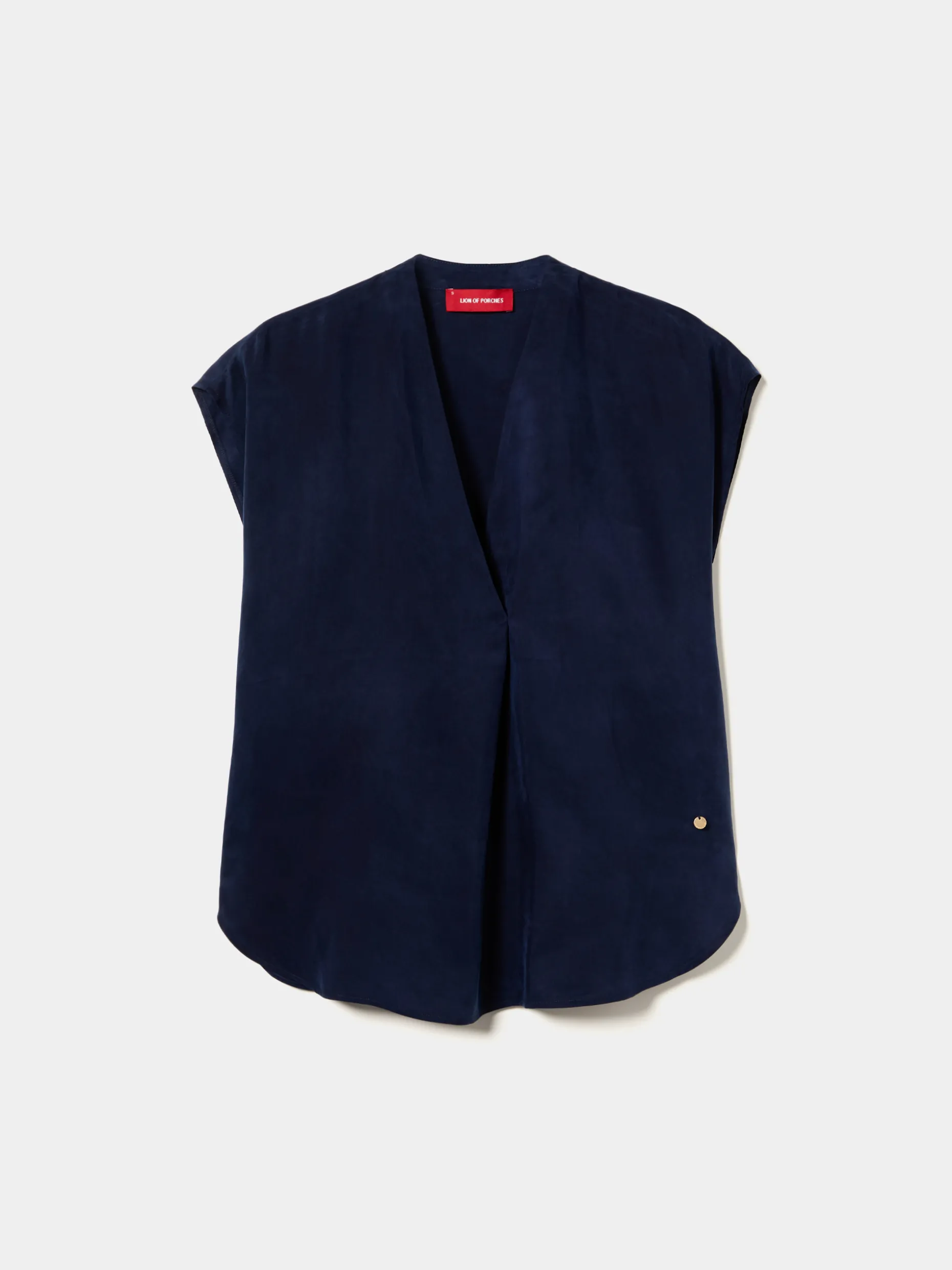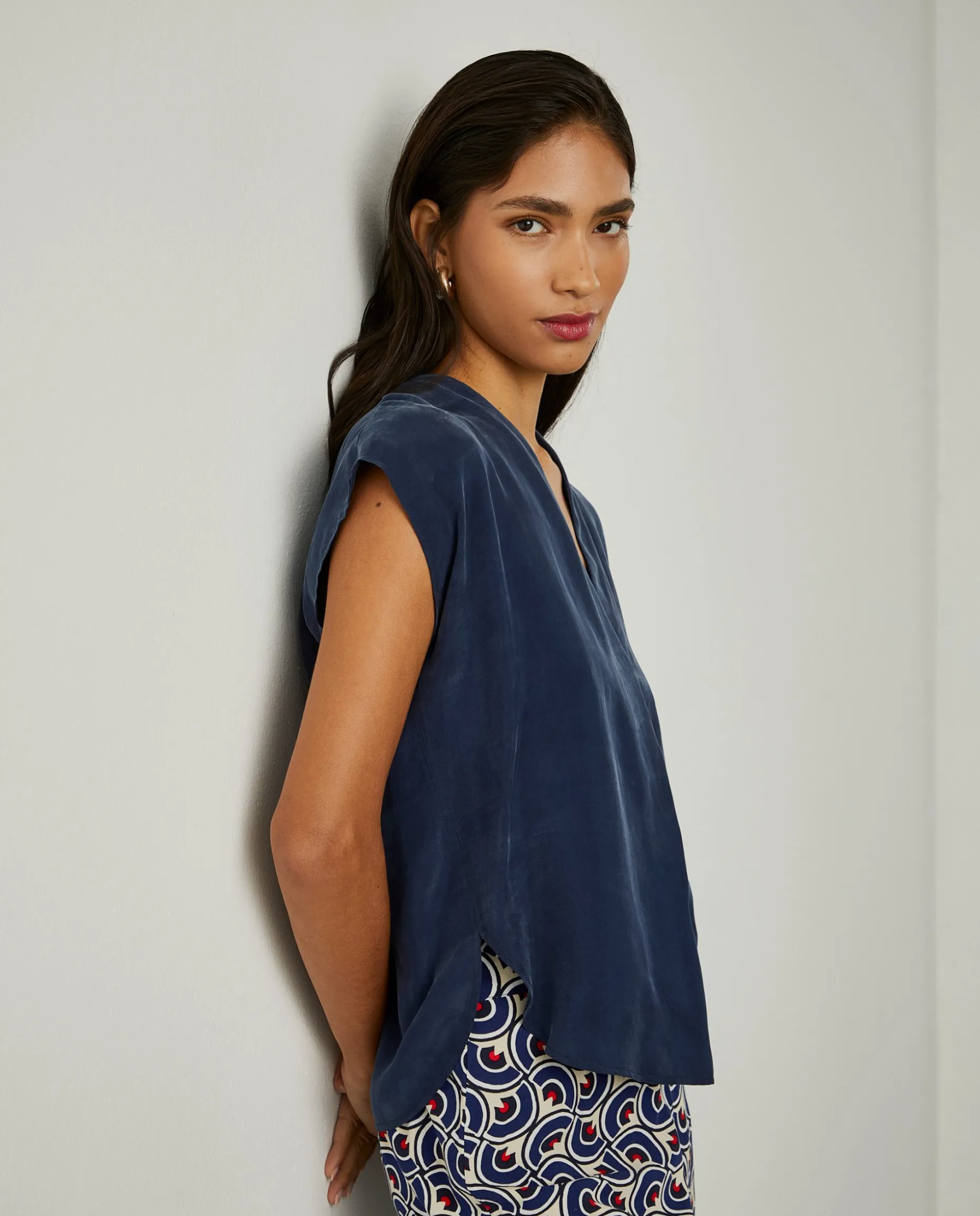 Blusa versátil e elegante, de decote cruzado em V, e bainha redonda. Aberturas laterais. Confecionada, na totalidade, em cupro, um material leve, macio, eco-friendly e sustentável.