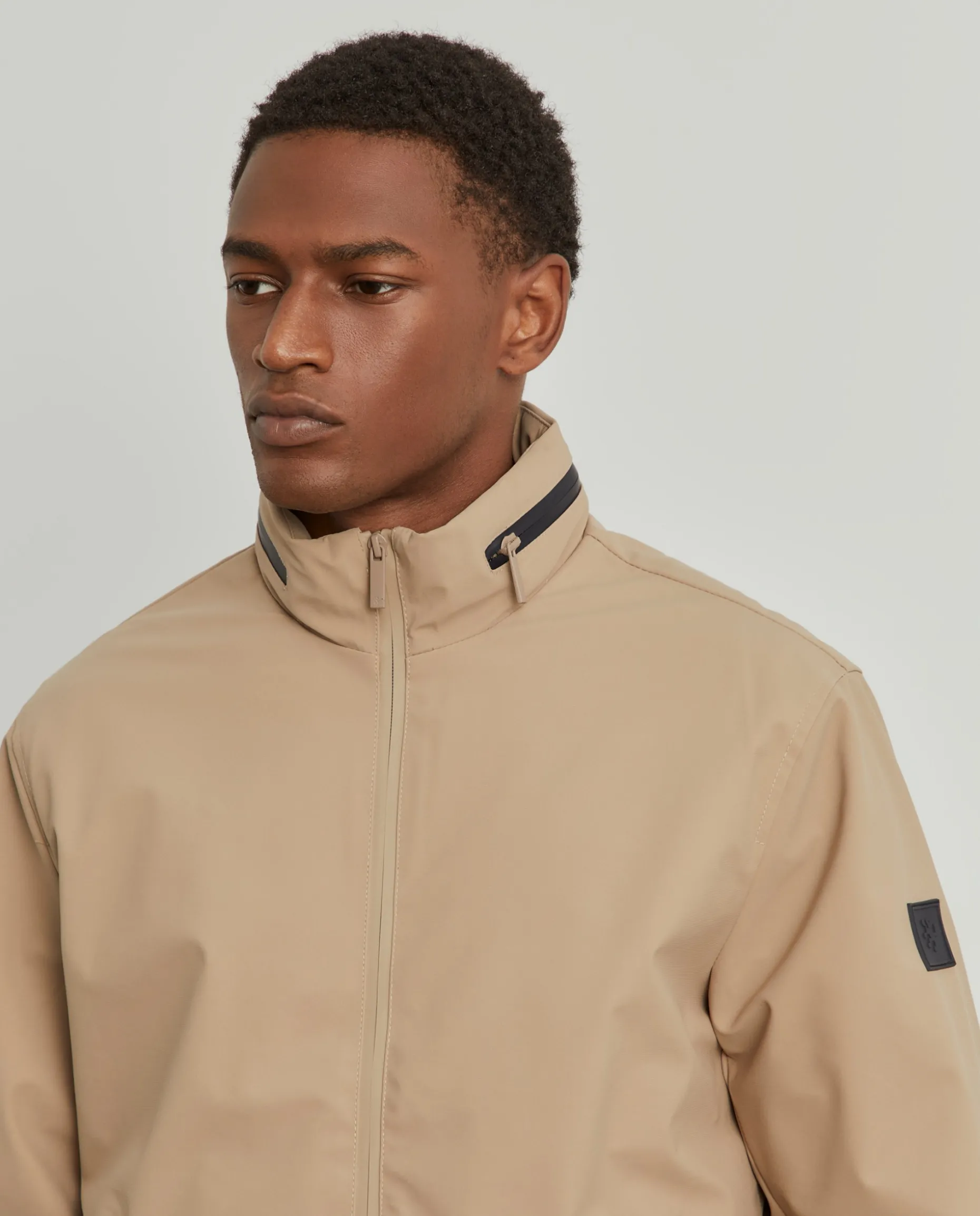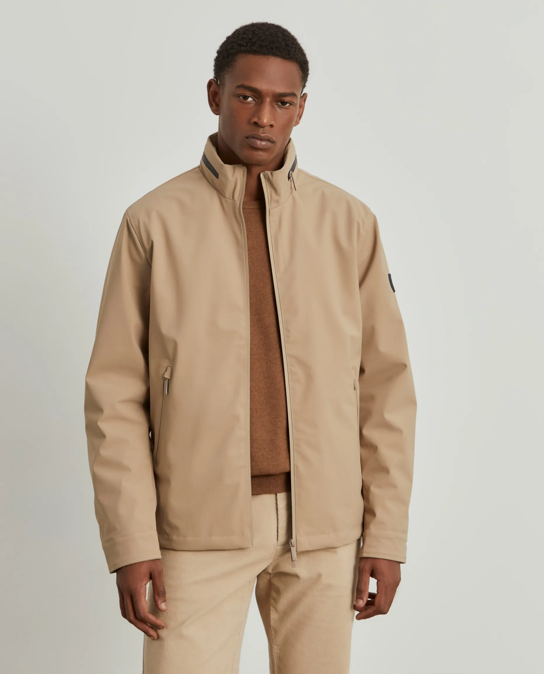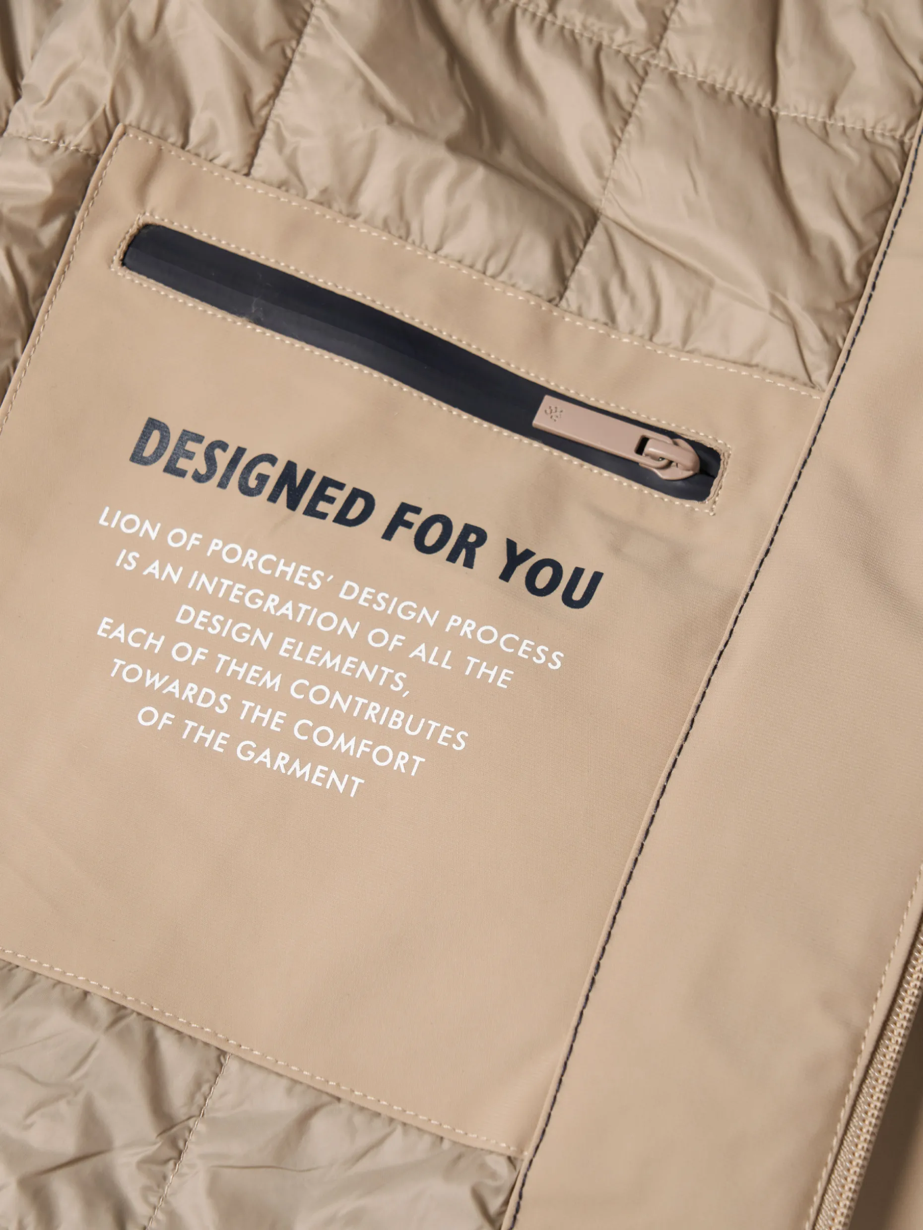 Blusão acolchoado com capuz embutido na gola através de fecho impermeável em contraste de cor. Aperto através de fecho impermeável de duplo cursor e tem ainda dois bolsos na frente, também com fecho impermeável. No interior, tem mais dois bolsos, um de fecho e outro de chapa.