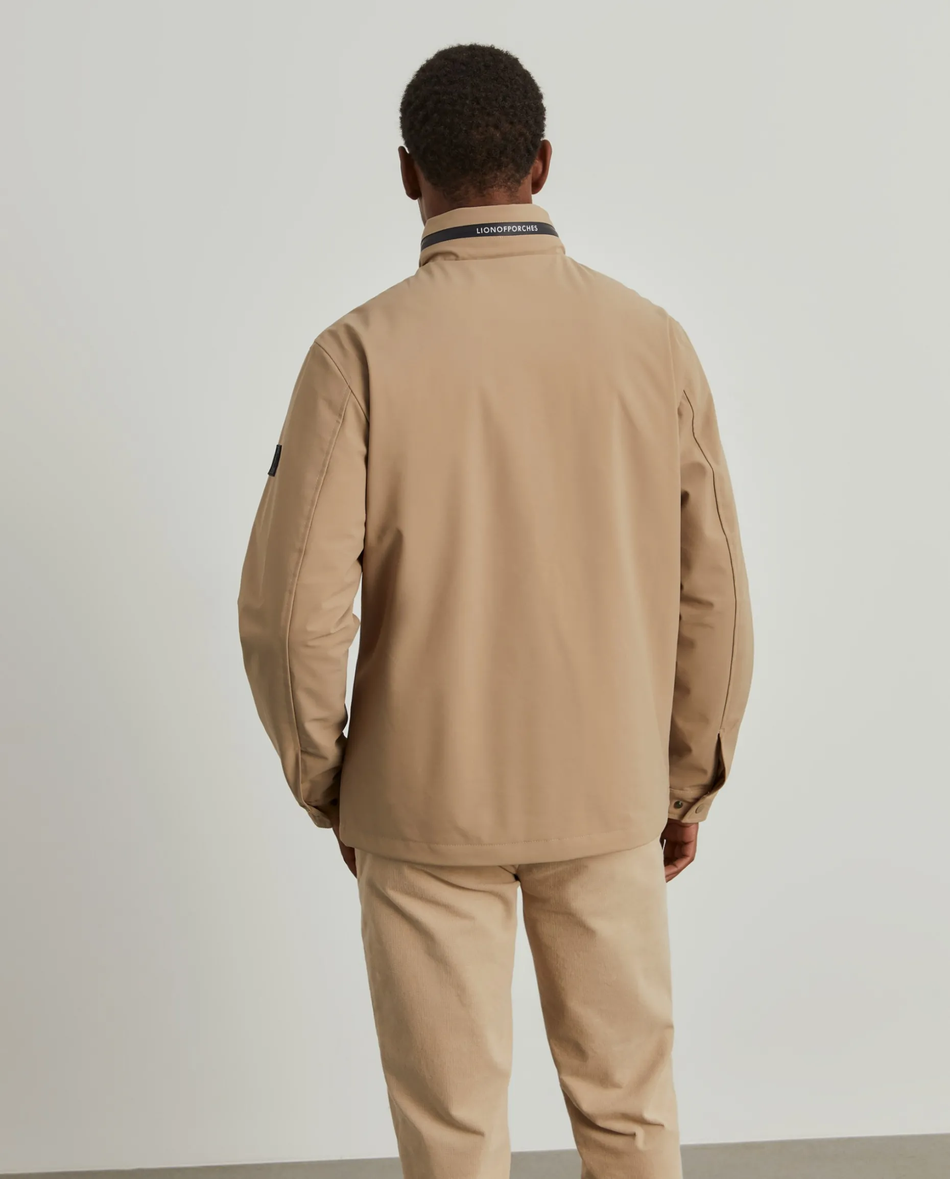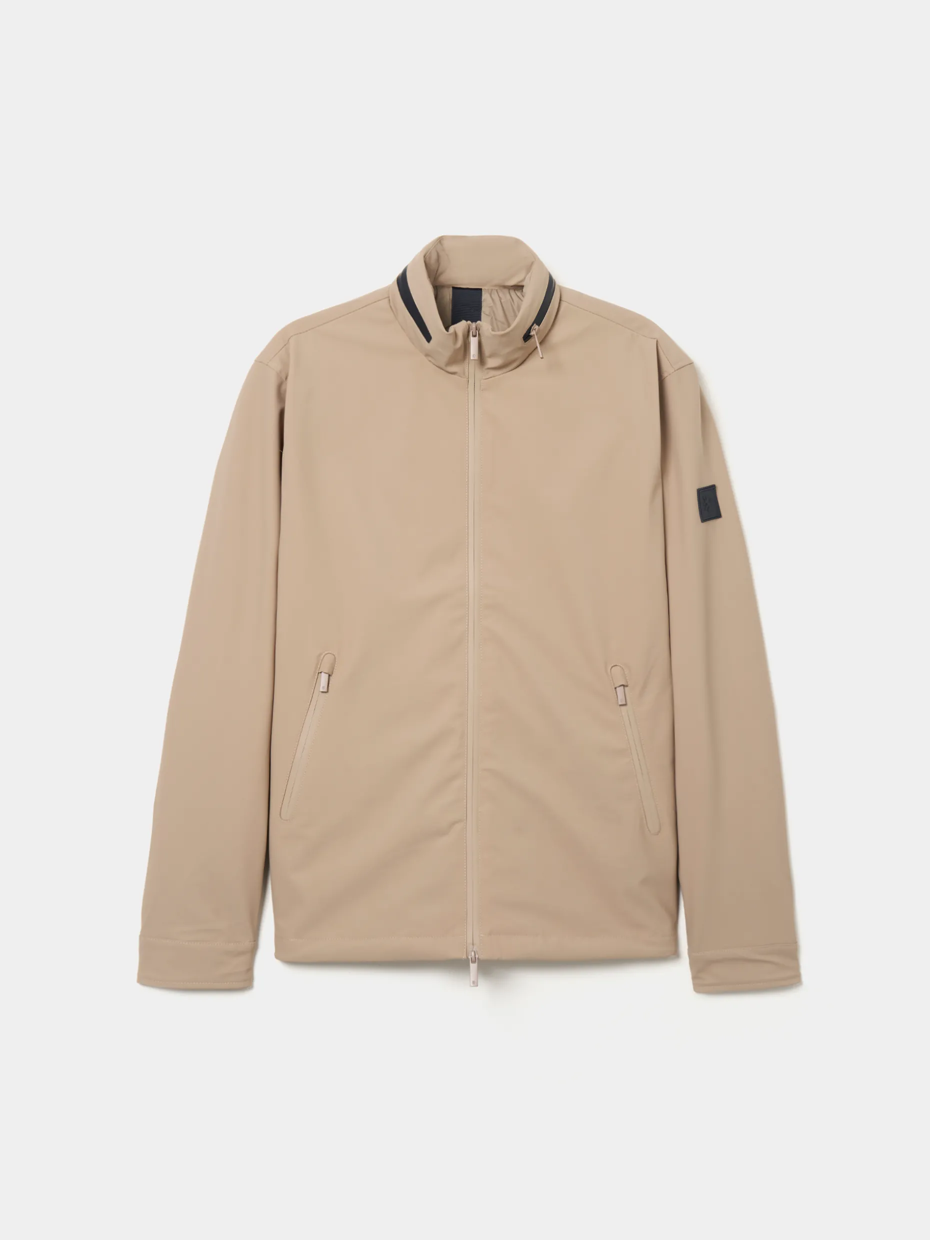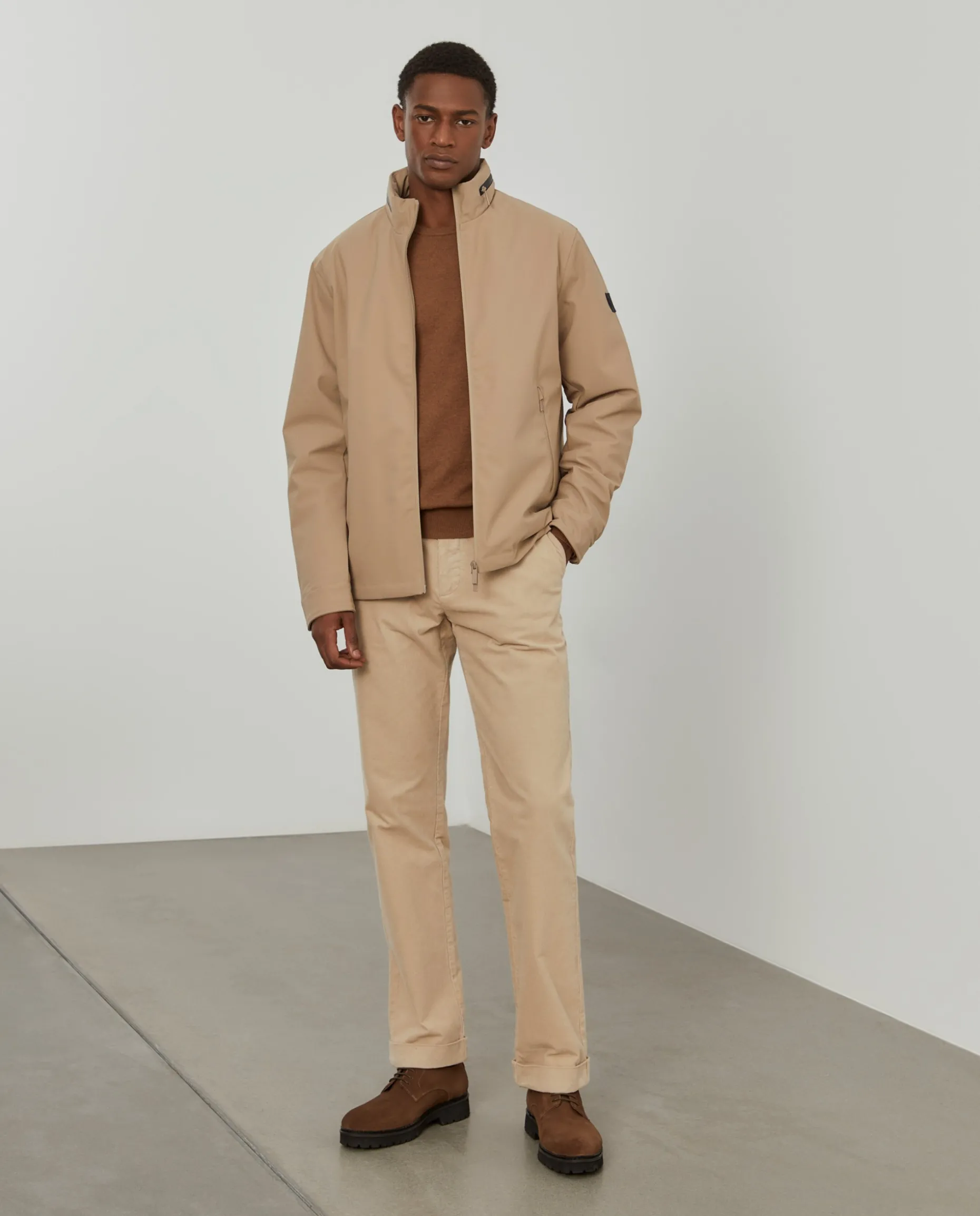Blusão acolchoado com capuz embutido na gola através de fecho impermeável em contraste de cor. Aperto através de fecho impermeável de duplo cursor e tem ainda dois bolsos na frente, também com fecho impermeável. No interior, tem mais dois bolsos, um de fecho e outro de chapa.