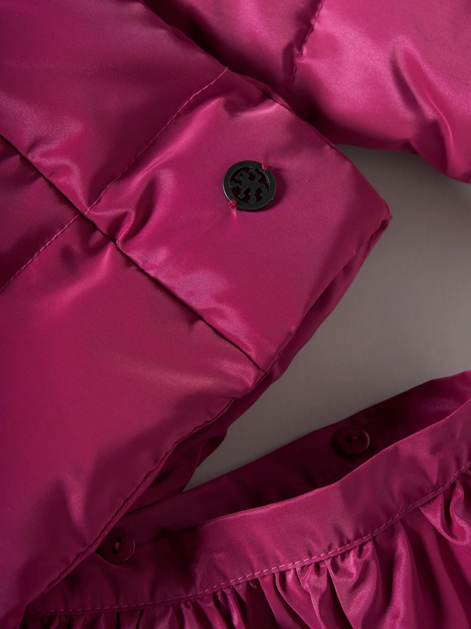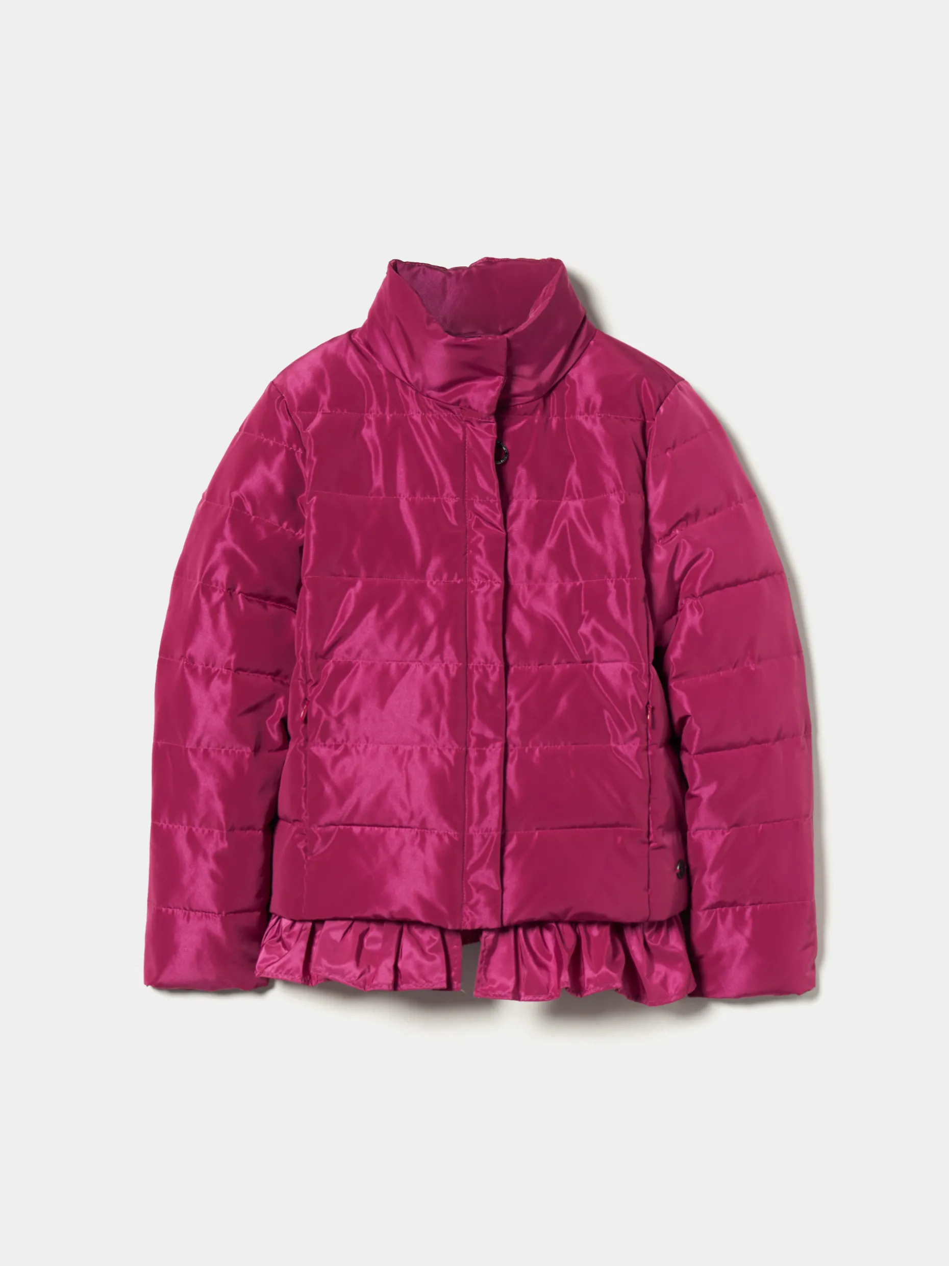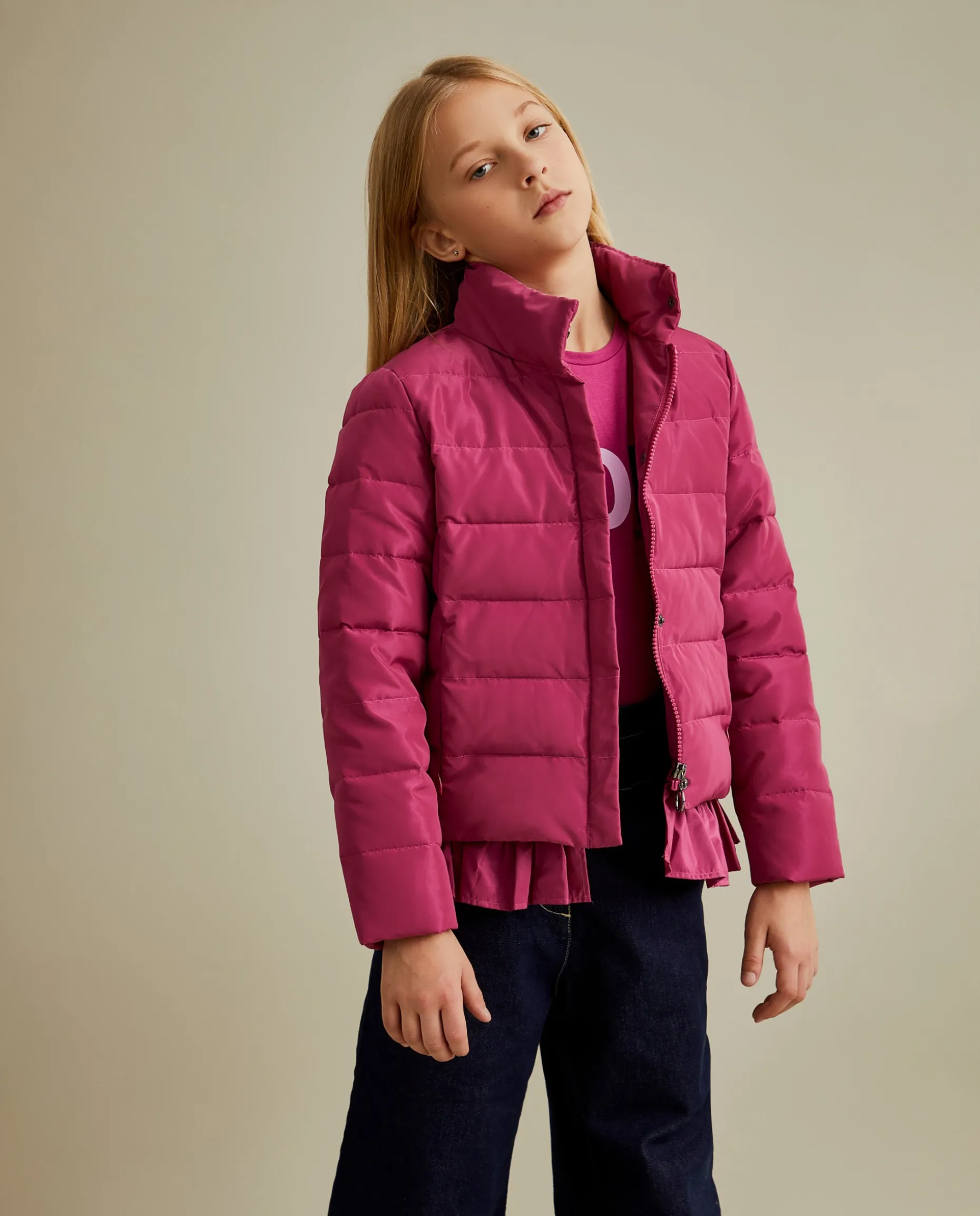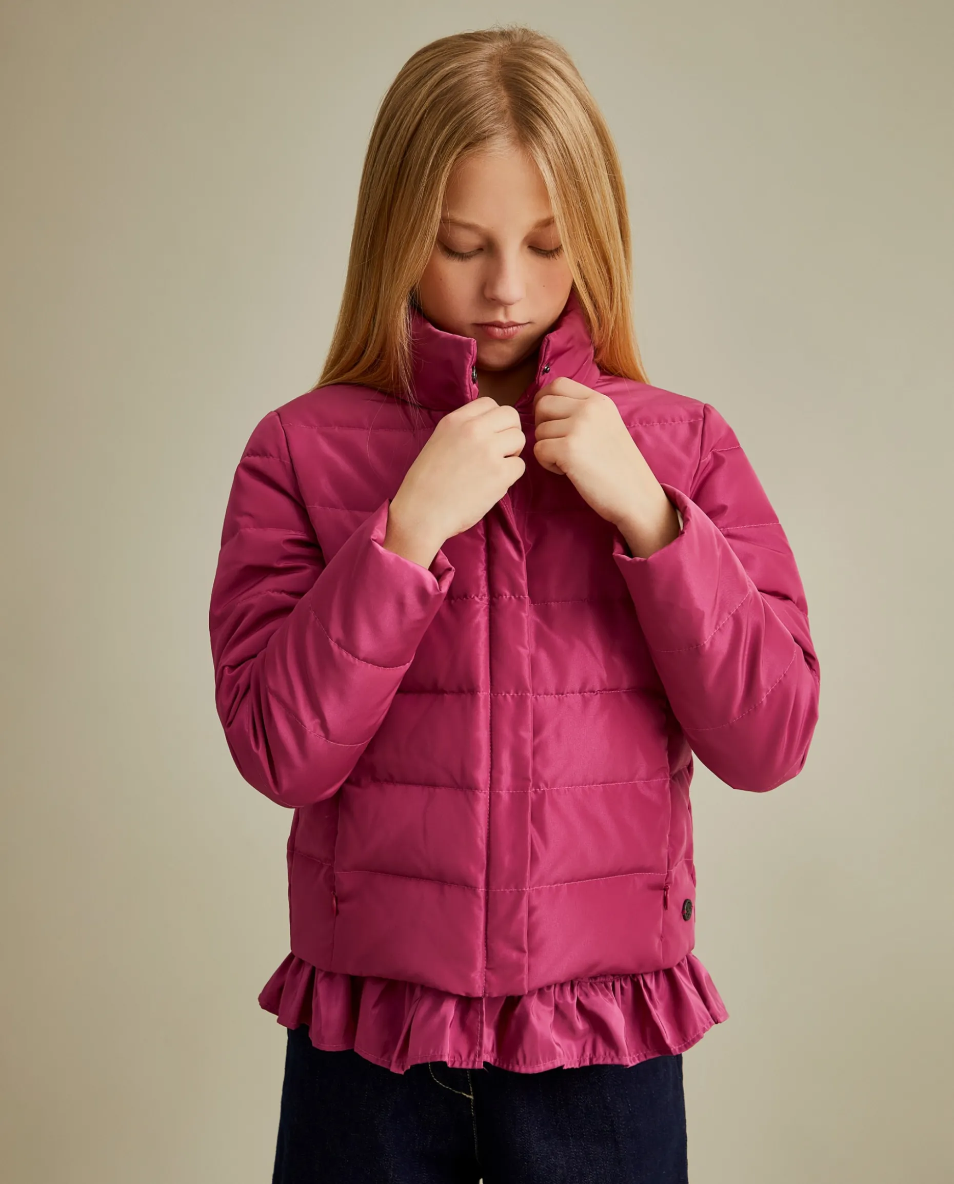 Blusão acolchoado com folho no fundo para manter as miúdas quentes e confortáveis, mas com muito estilo. A gola é subida com capuz embutido. Aperta na frente com fecho de correr e molas de pressão ocultas na carcela. Confecionado com uma mistura de poliéster reciclado.