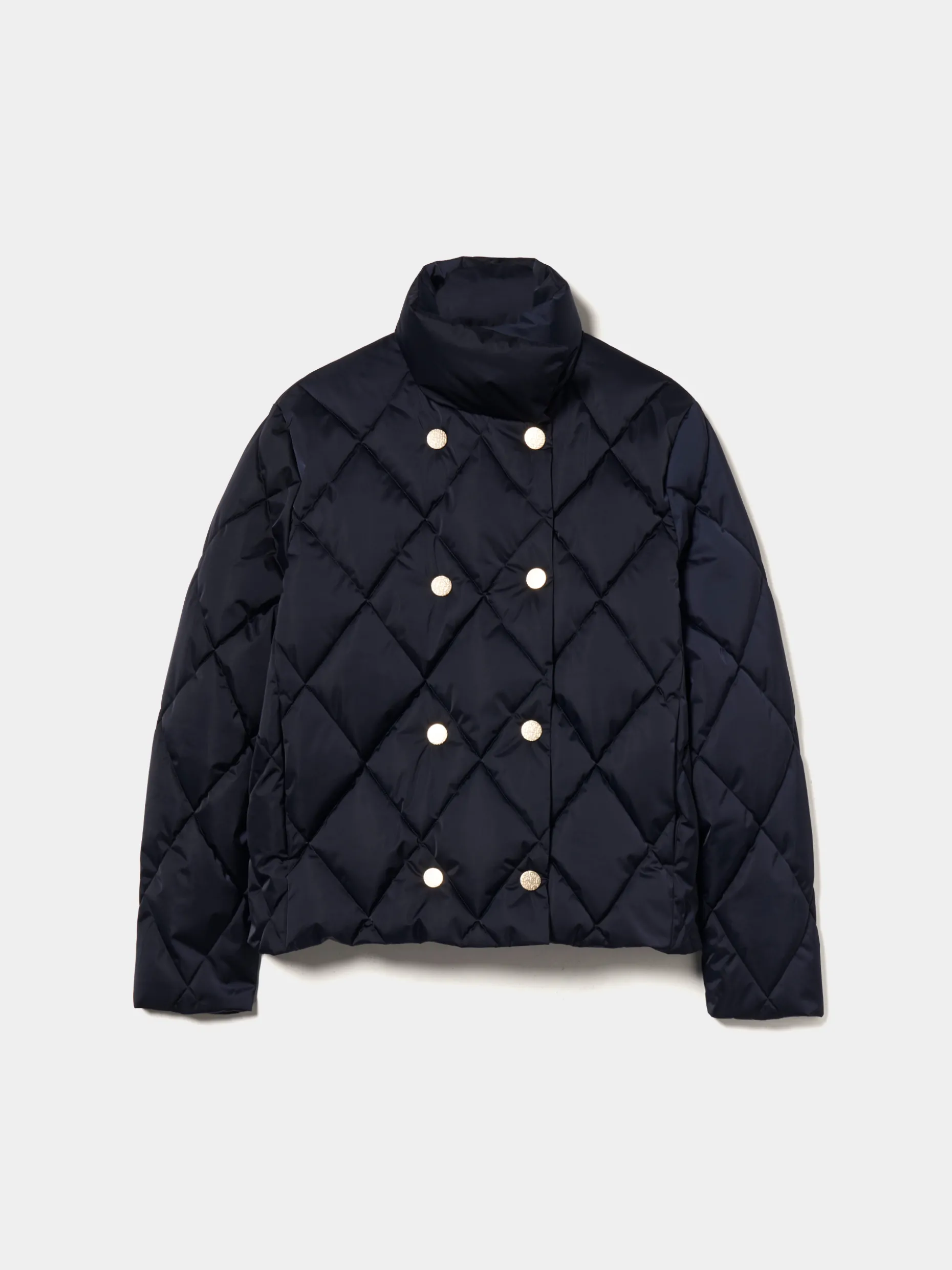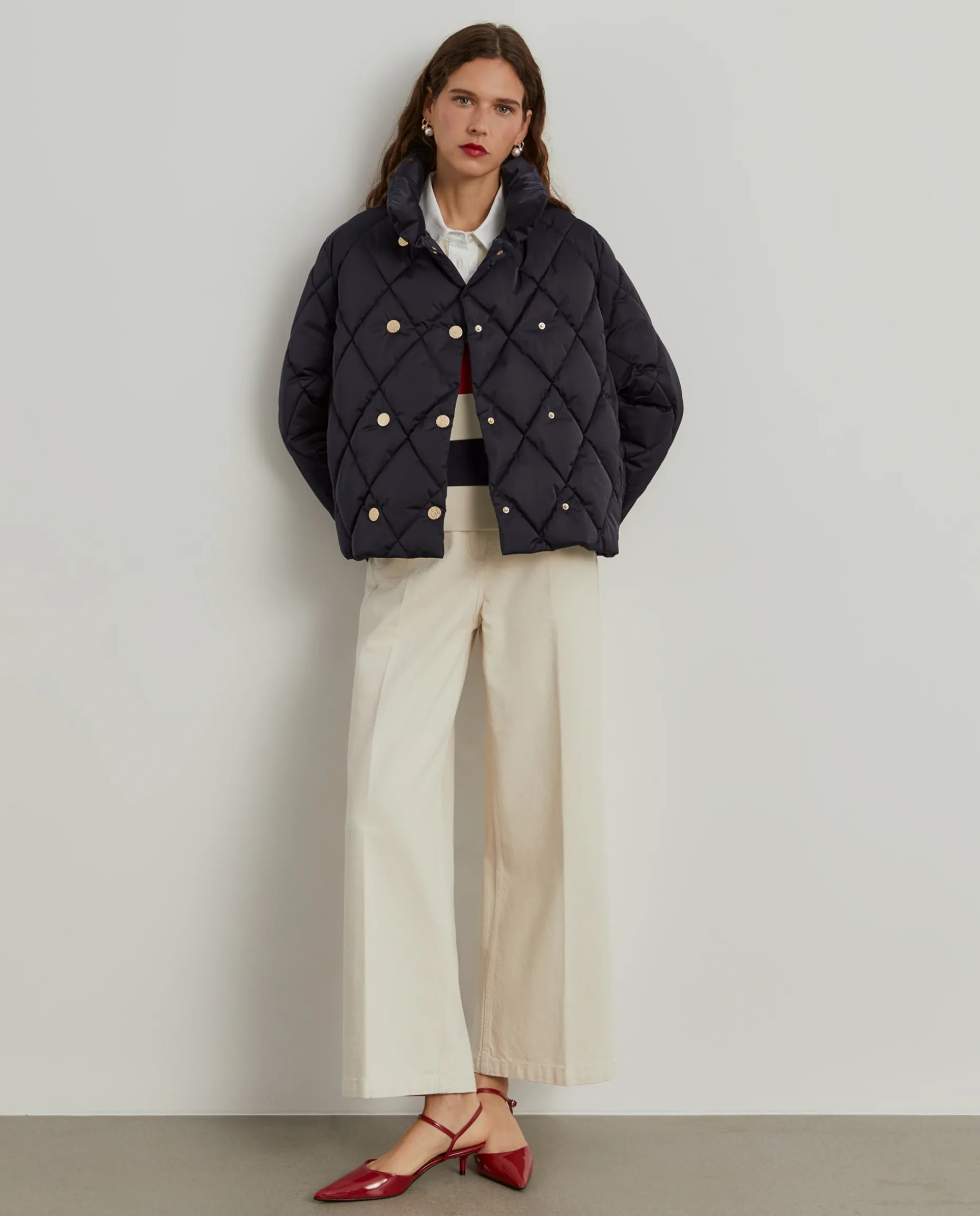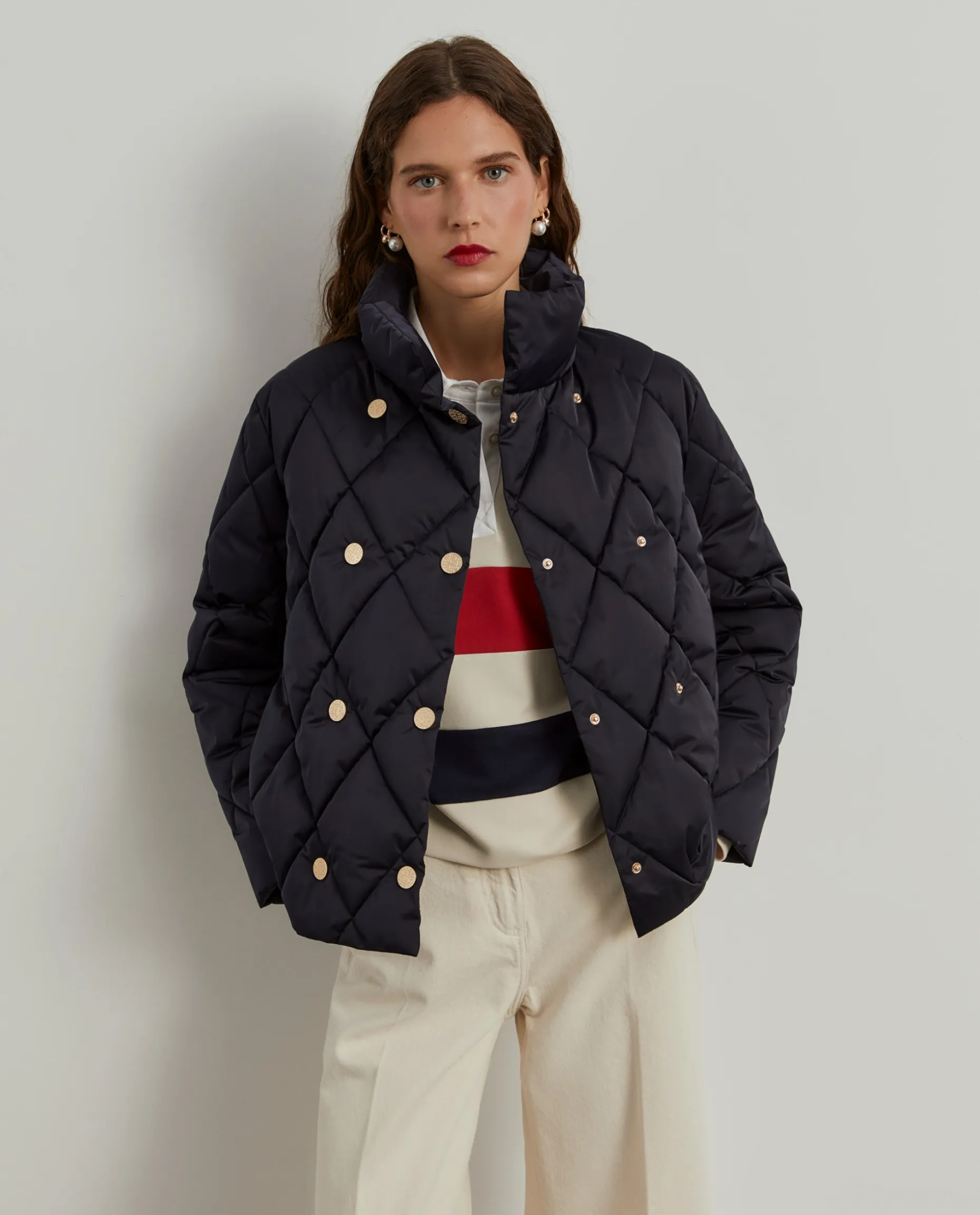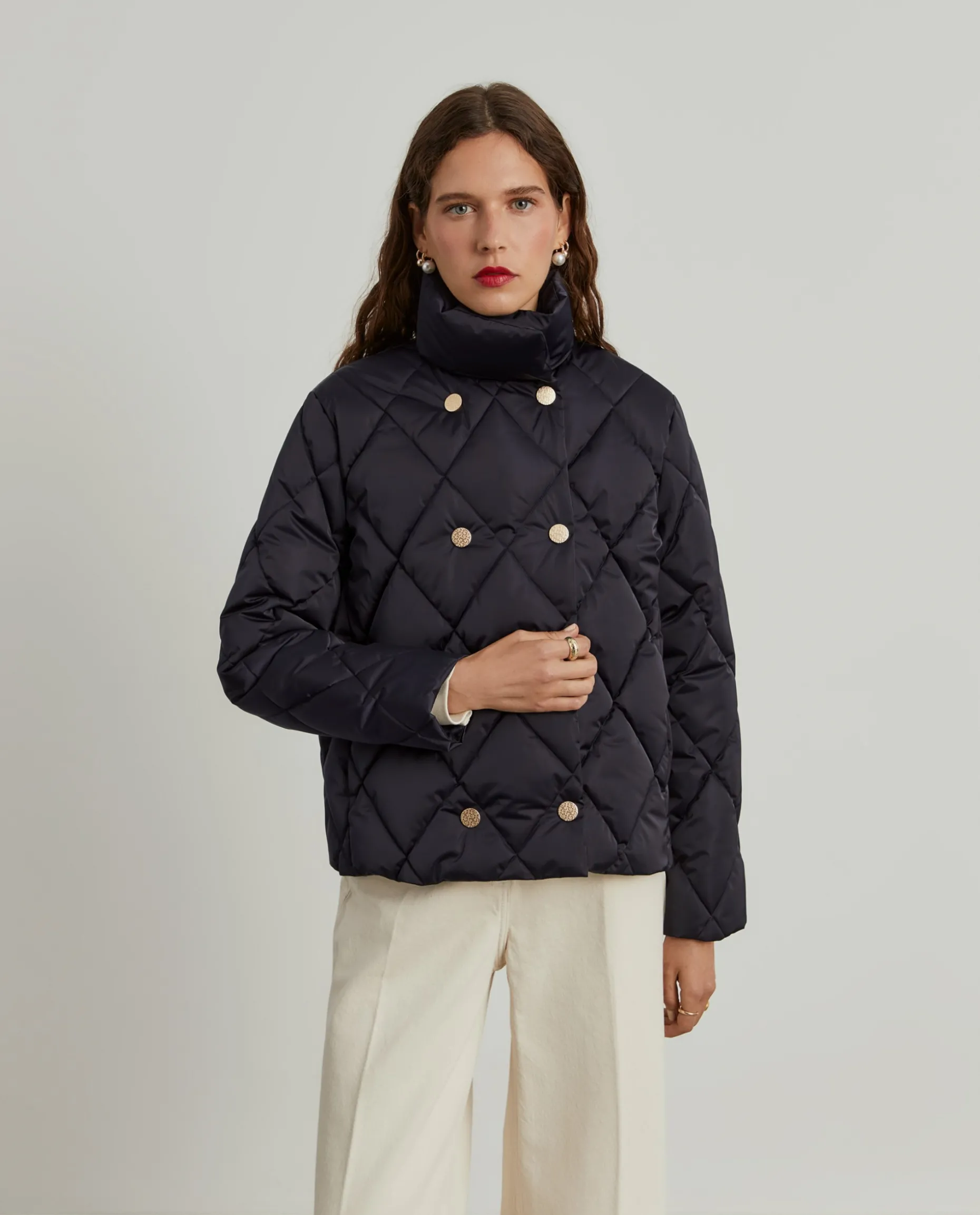 Blusão acolchoado com trespasse, perfeito para se proteger com elegância nos dias mais frios de inverno. Abotoamento duplo com molas de pressão personalizadas com monograma da marca. Forro interior também com monograma LP. Finaliza com bolsos na costura lateral. Disponível em várias cores.