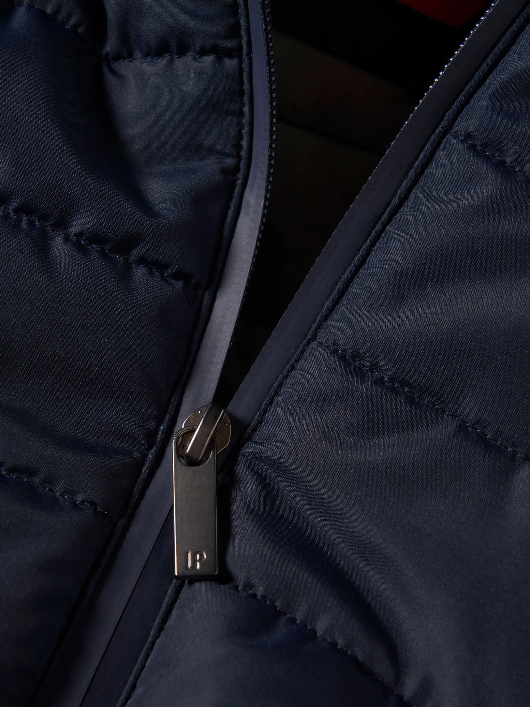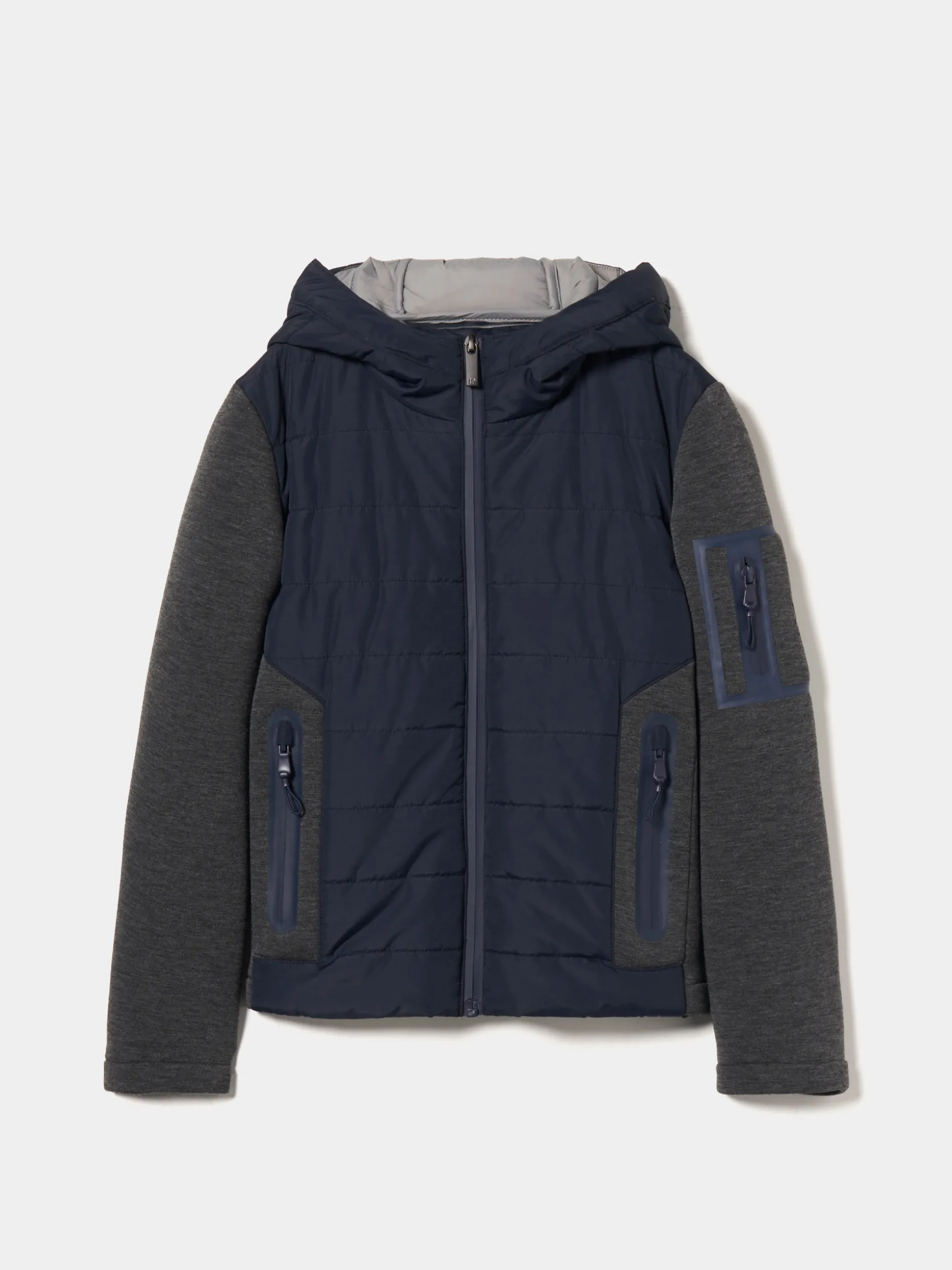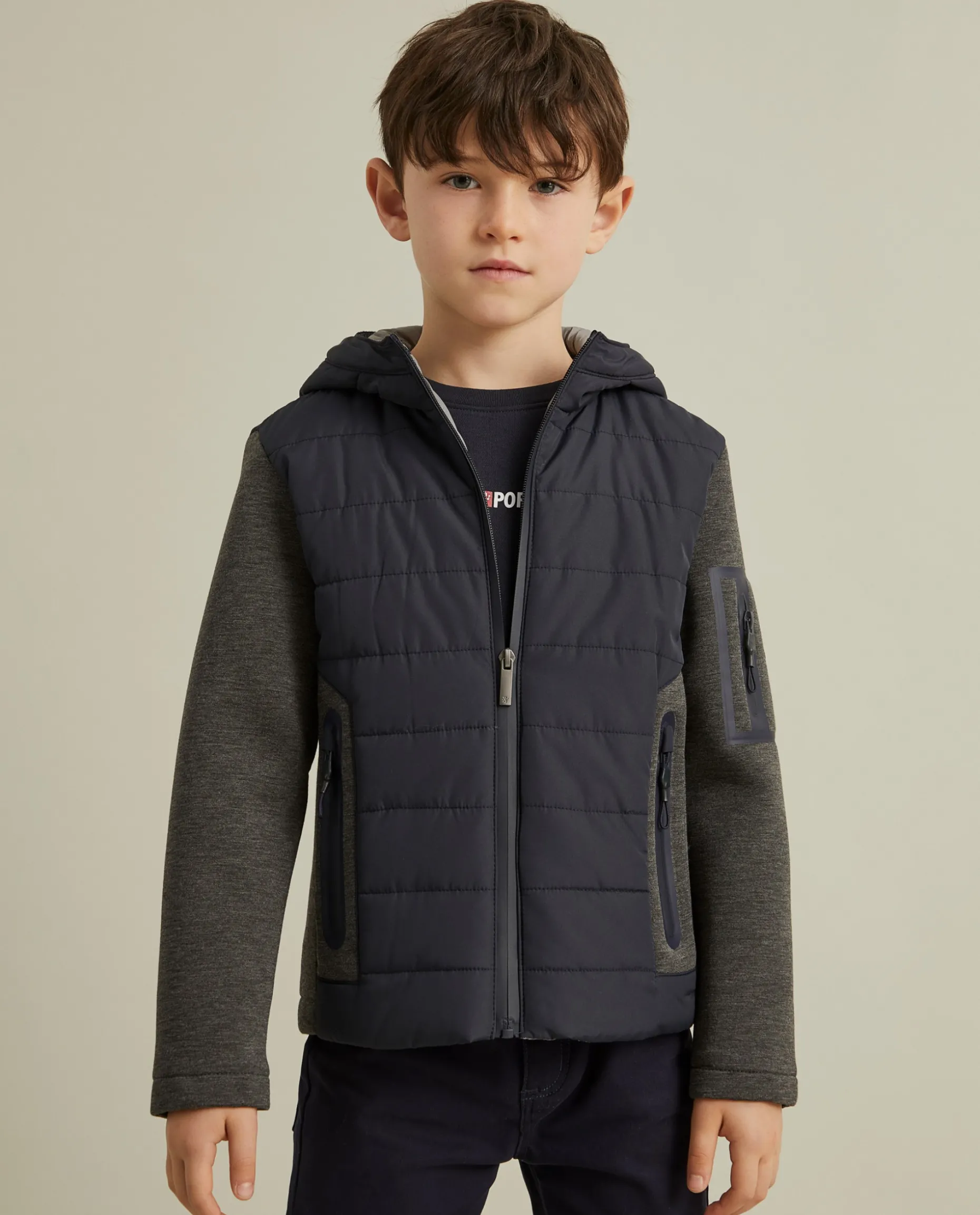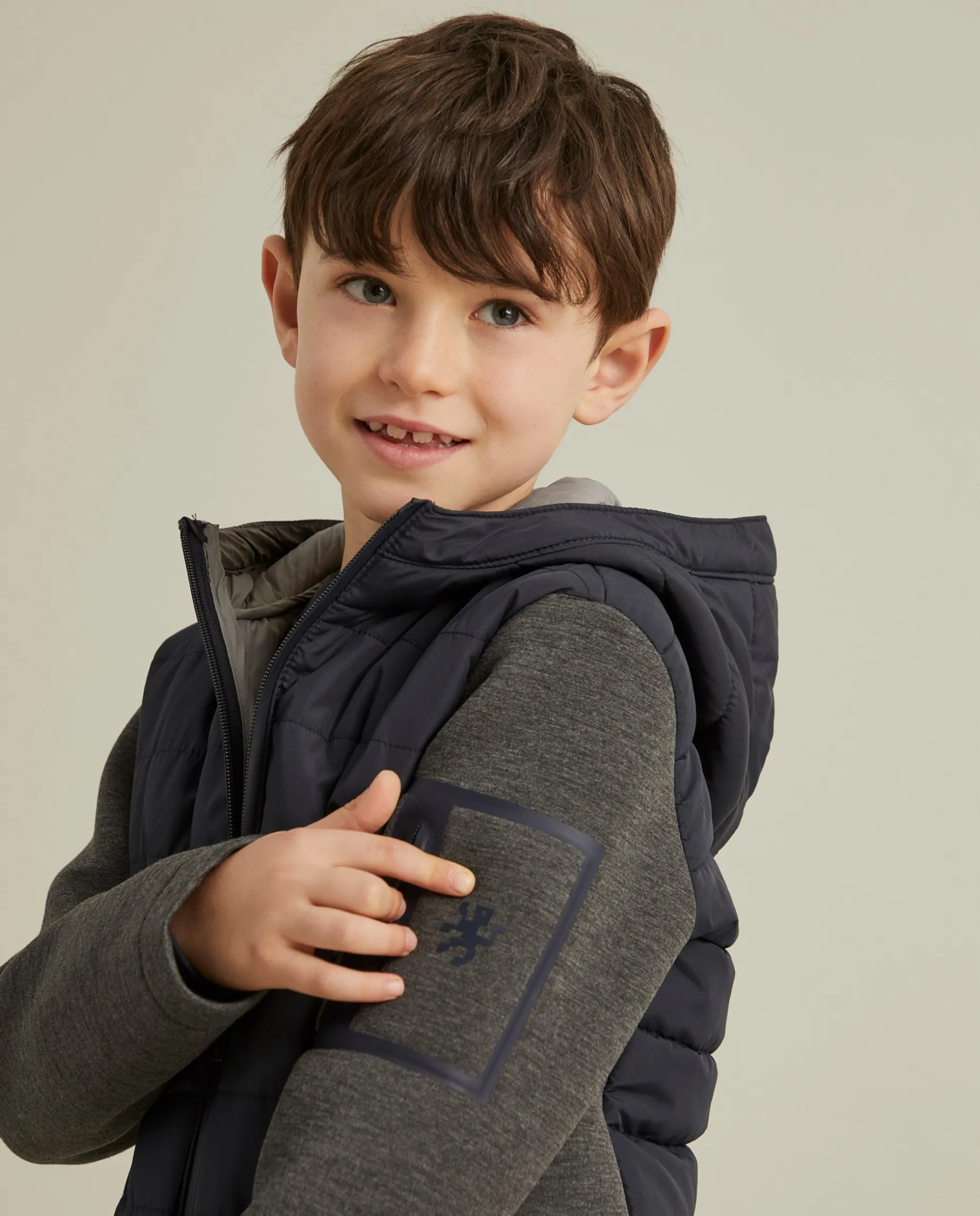 Blusão manga comprida com capuz com acolchoado na frente. Mangas em contraste em malha. Bolso na manga com estampado leão em contraste. Forro em contraste com bolsos no interior.