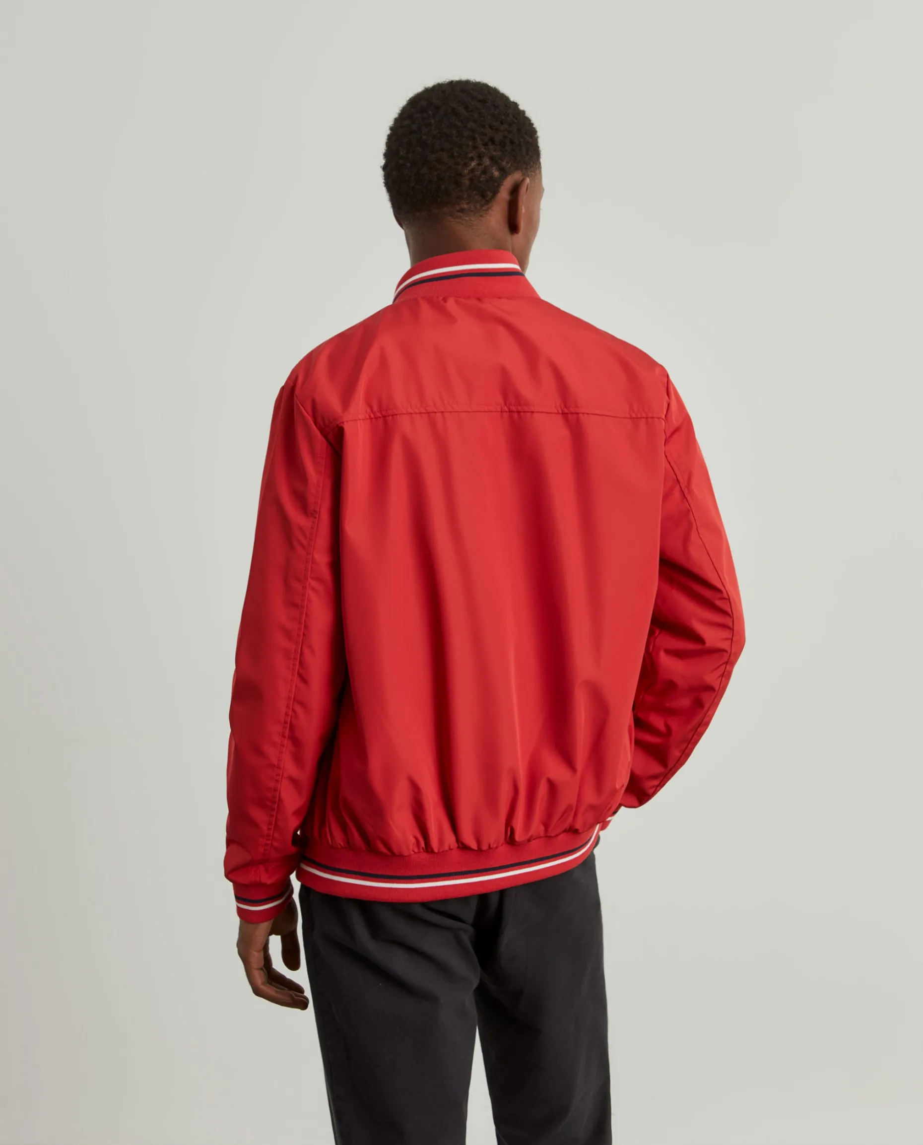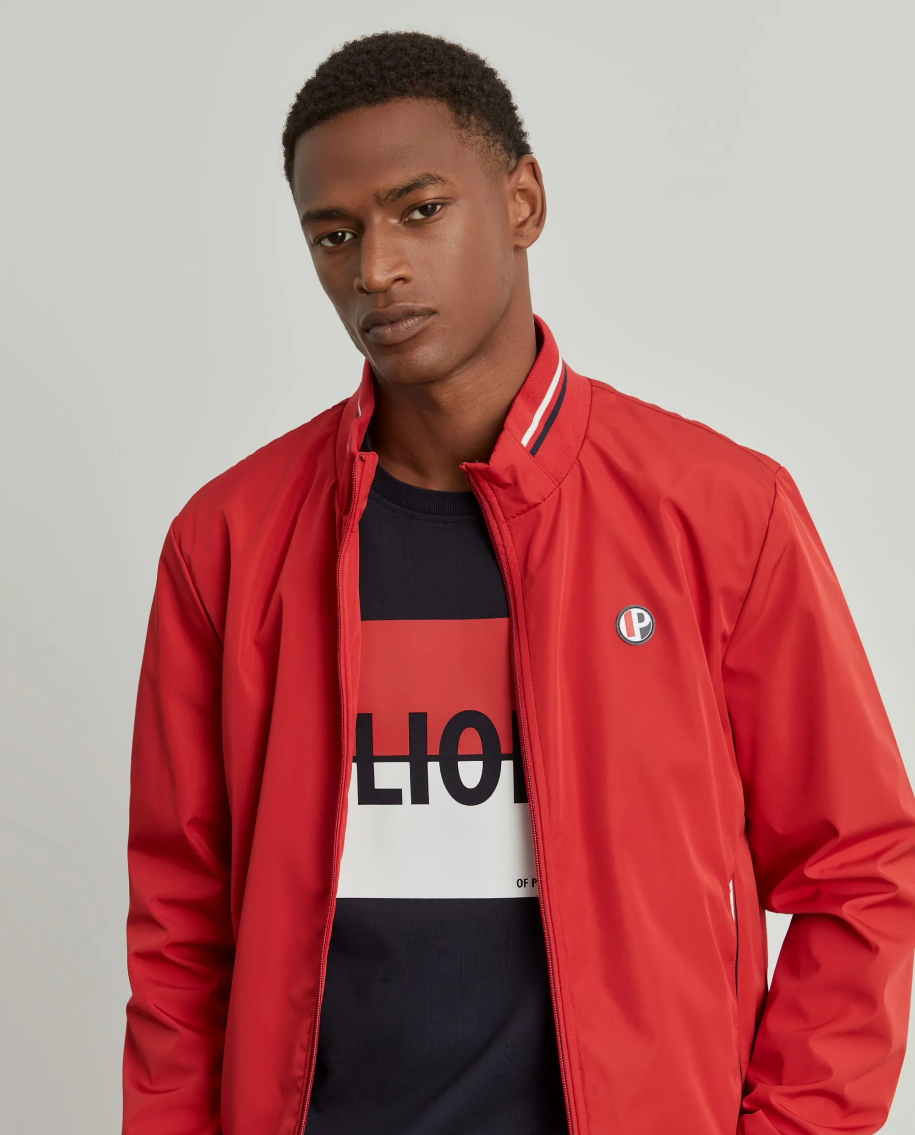 Blusão com gola subida. Em tecido técnico. Aperta com fecho central. Dois bolsos com molas de pressão. Emblema “Lion of Porches” no peito. Cinto e punhos em malhas canelada com riscas em cor contraste. Bolso de fecho no interior.
