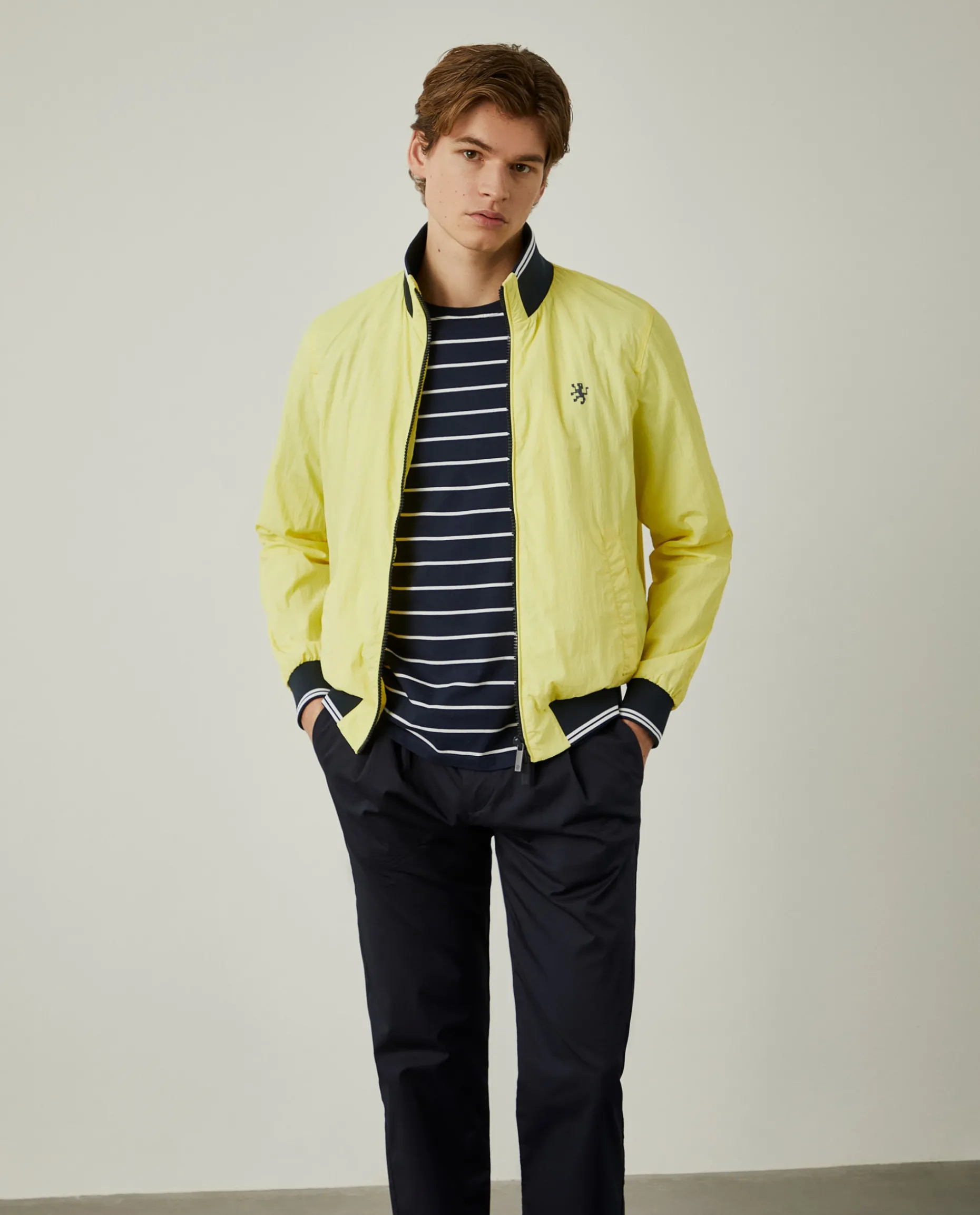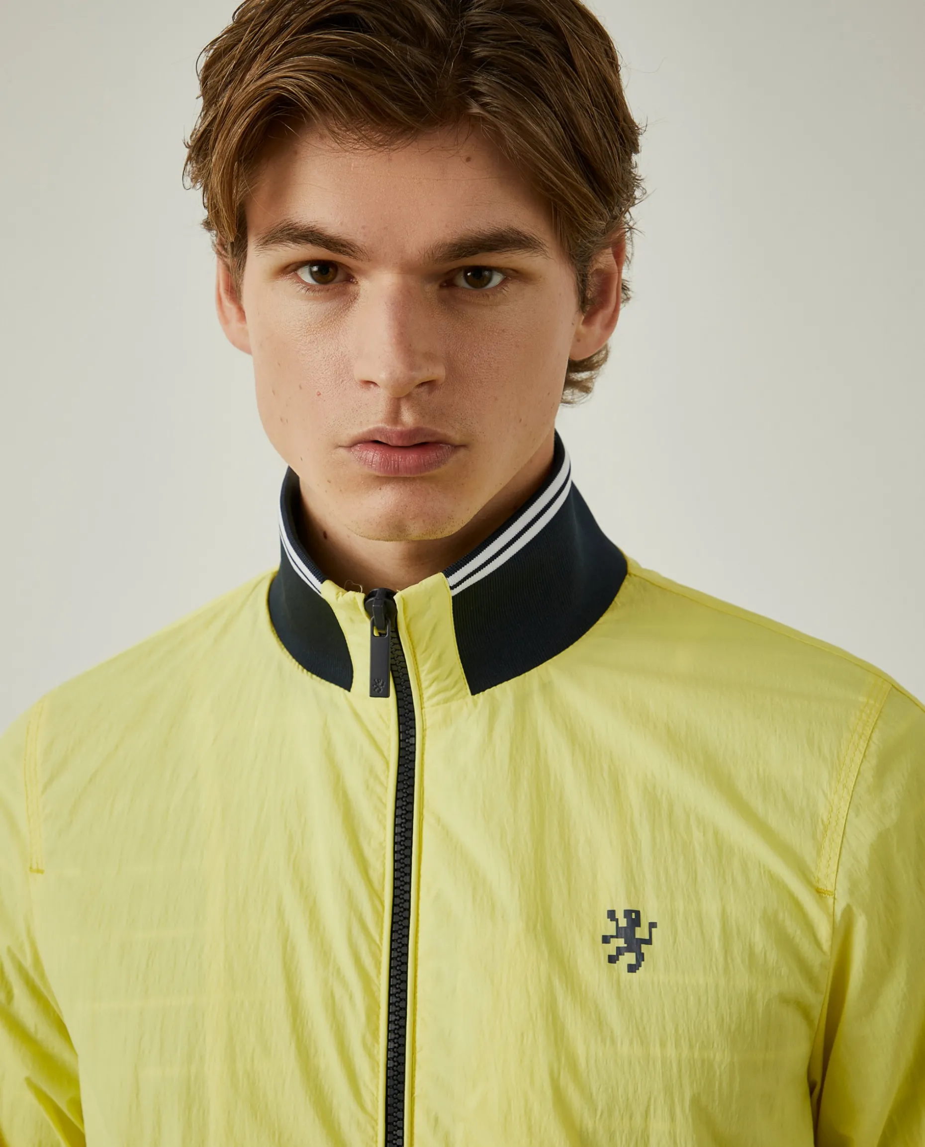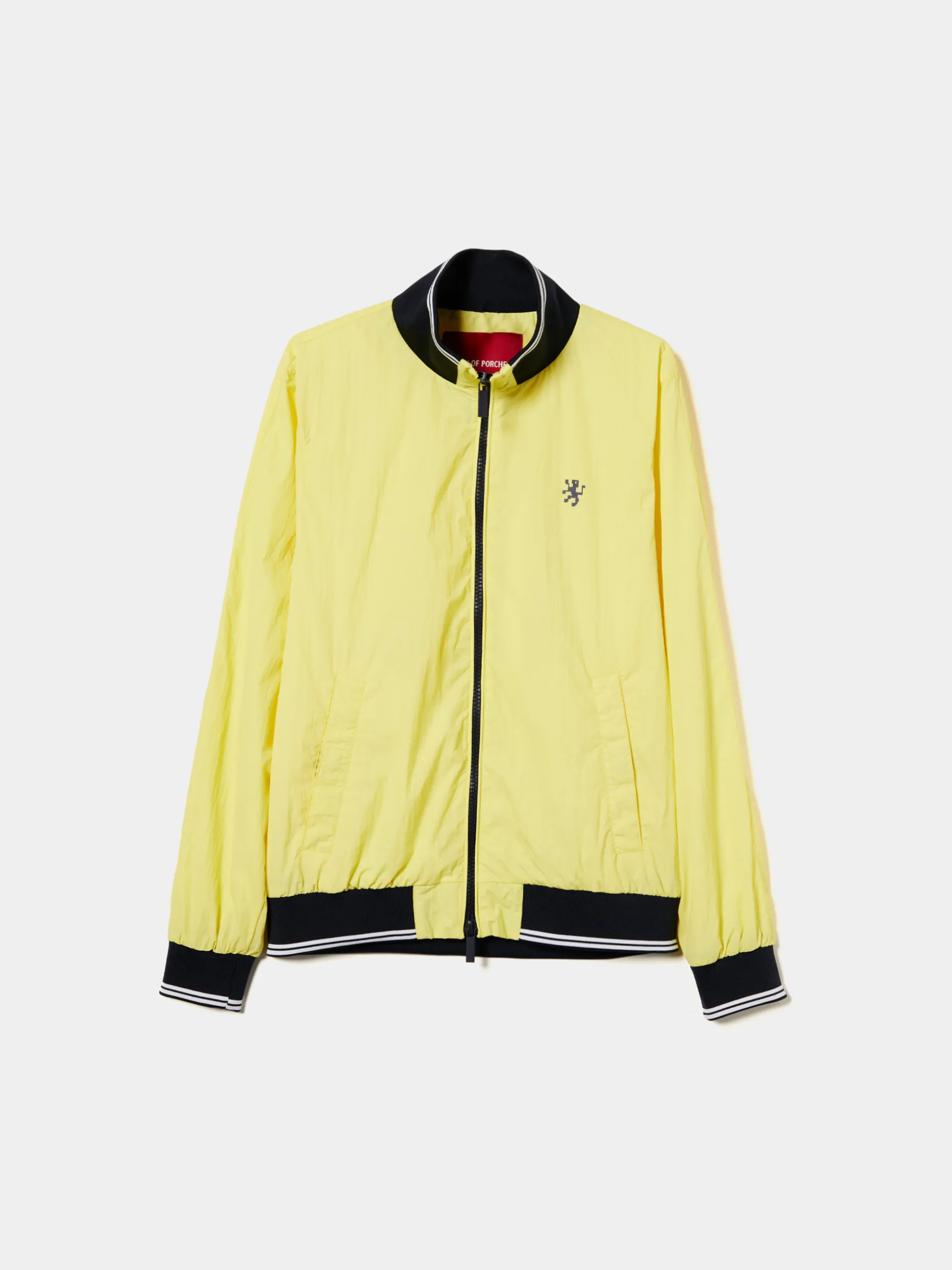 Blusão corta-vento em tecido técnico com gola, base e punhos de malha canelada em contraste de cor. De gola subida, aperta com fecho de duplo cursor e conta com dois bolsos frontais. Finaliza com emblema Lion of Porches no peito.