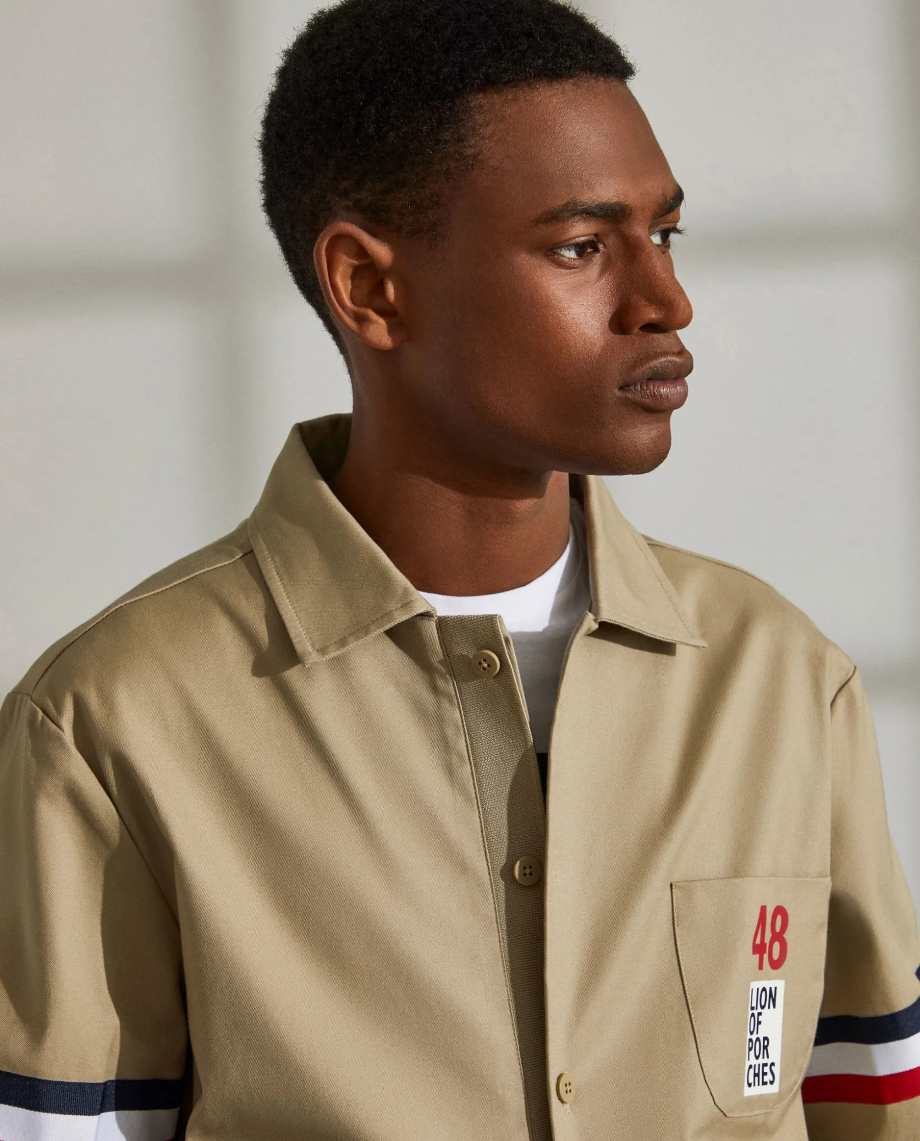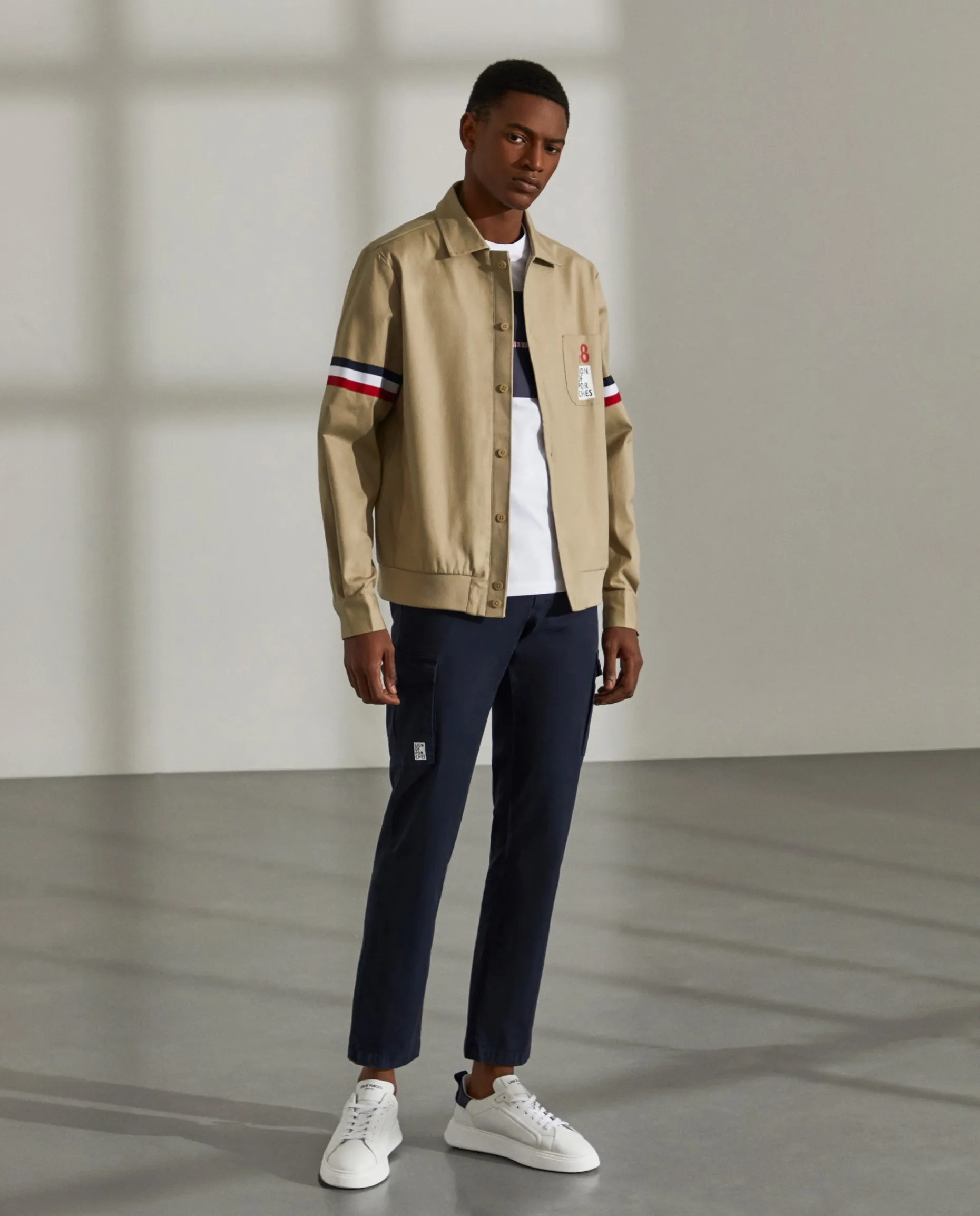 Blusão Regular Fit. Confecionado em algodão e lycra. Sem forro. Aperta com botões na frente. Bolso de chapa no peito com estampado “Lion Of Porches”. Dois bolsos laterais. Fita tricolor aplicada nas mangas. Cós em malha canelada.
