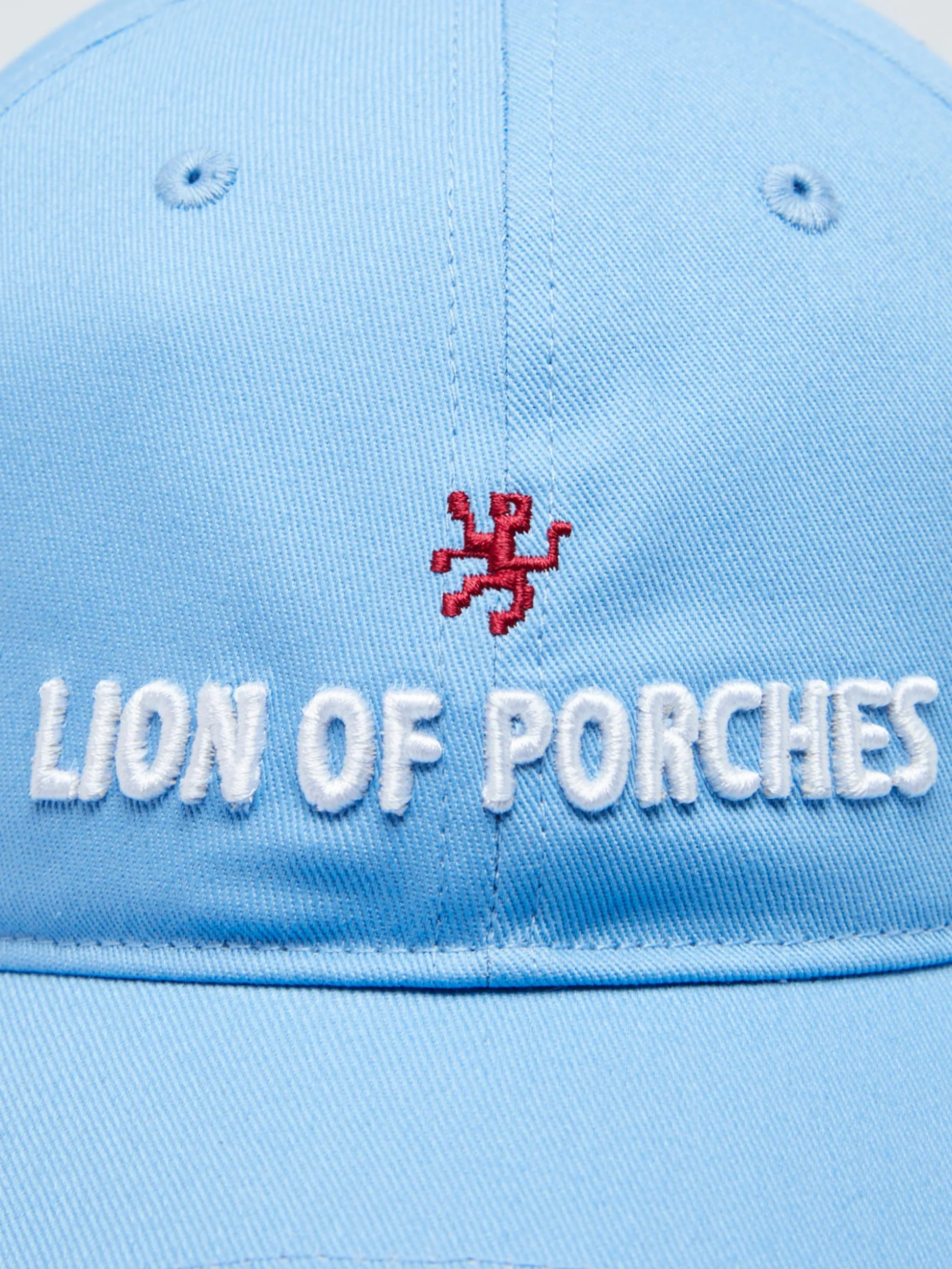Boné de algodão com pala curva e logotipo Lion of Porches bordado em relevo na frente. Regulador metálico na parte traseira e metal de encaixe final.