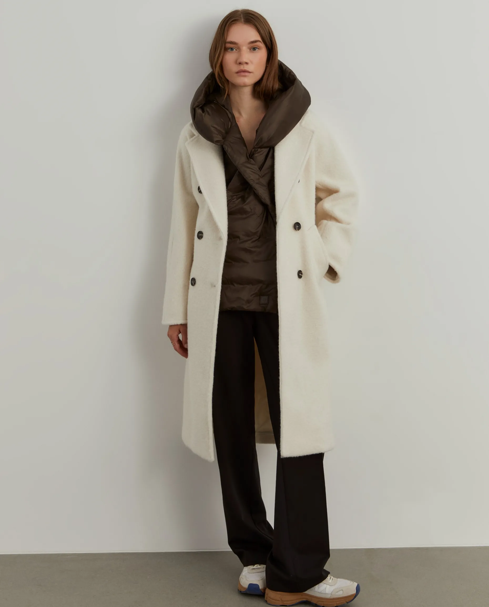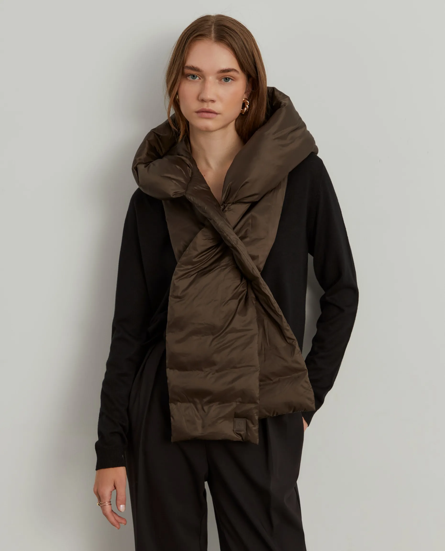 Cachecol acolchoado para se manter quente e confortável. Tem uma abertura a meio para cruzar o cachecol na frente e capuz. para colocar nos dias de chuva. Um adereço original e versátil, que irá adicionar um toque elegante e diferenciador ao seu outfit.