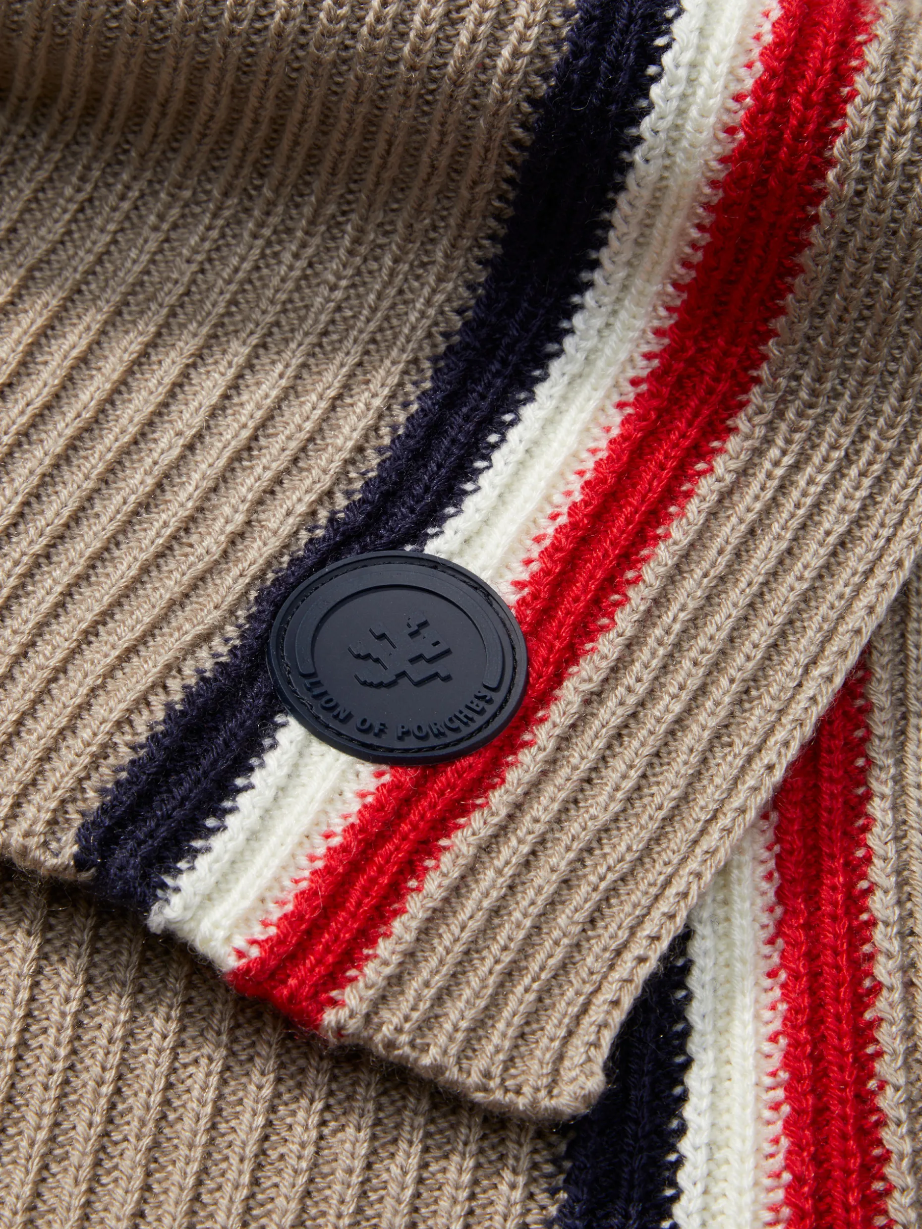 Garanta que os miúdos estão protegidos do frio com este cachecol de malha canelada com riscas tricolor. Finaliza, numa das pontas, com etiqueta de borracha redonda com branding Lion of Porches.