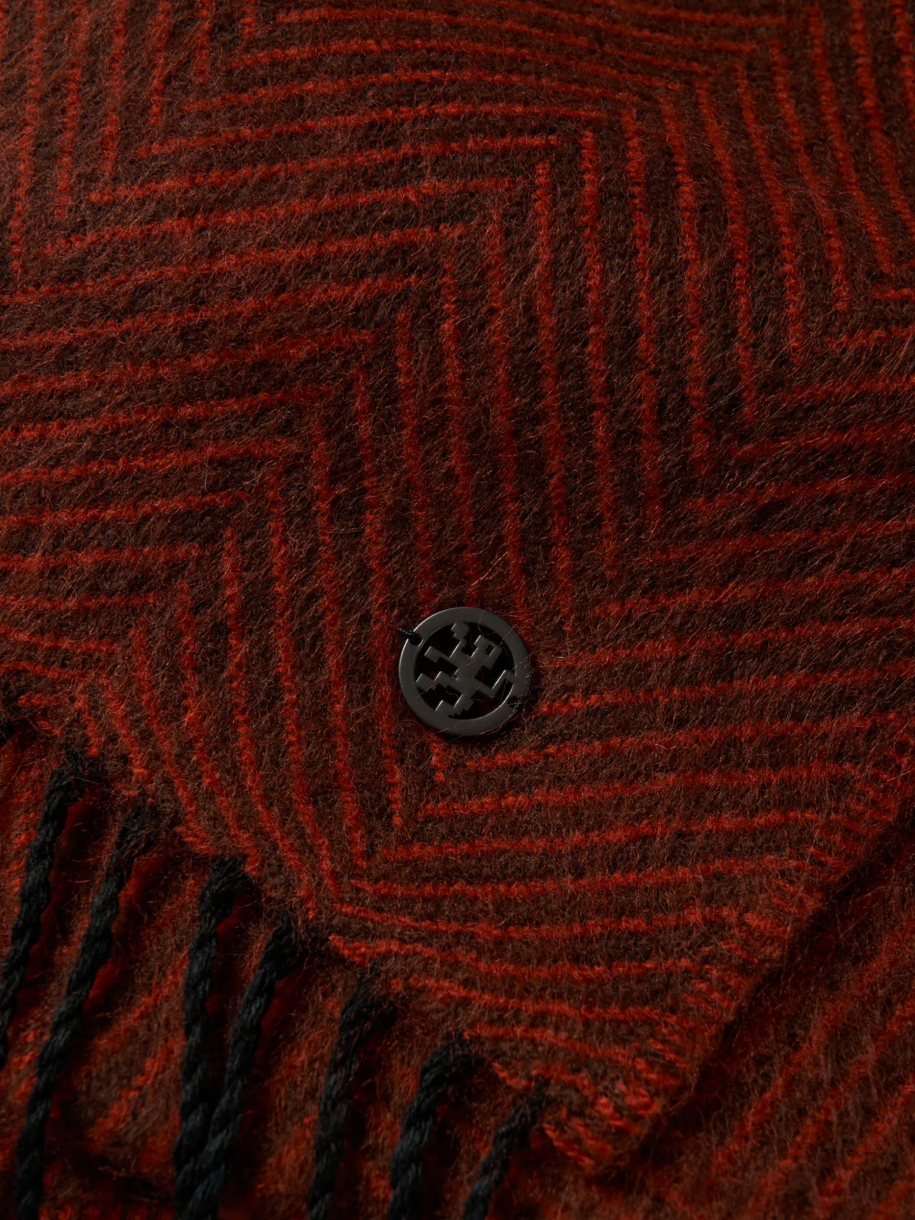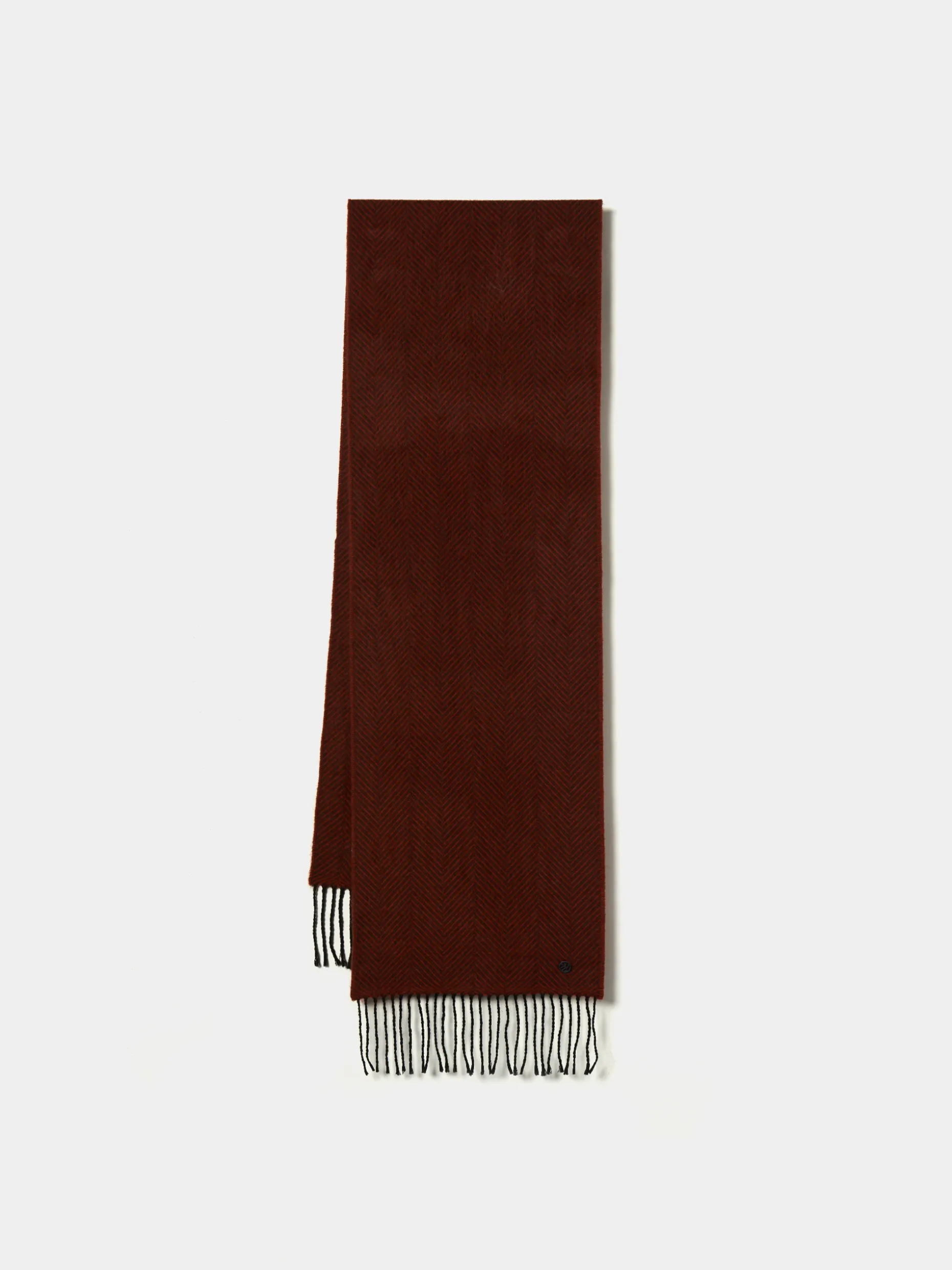 Um must-have no guarda-roupa de inverno é este cachecol com padrão estruturado em zig-zag. Finaliza com aplicação metálica de leão numa das extremidades e franjas nas pontas. Disponível em várias cores.