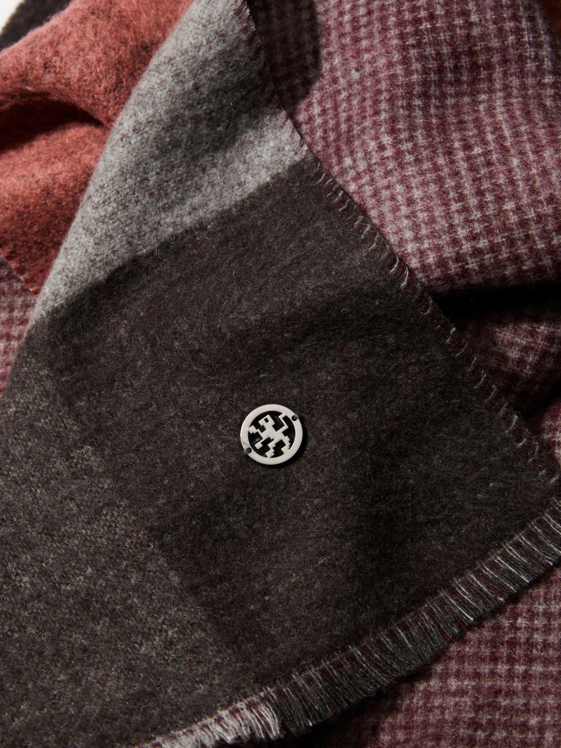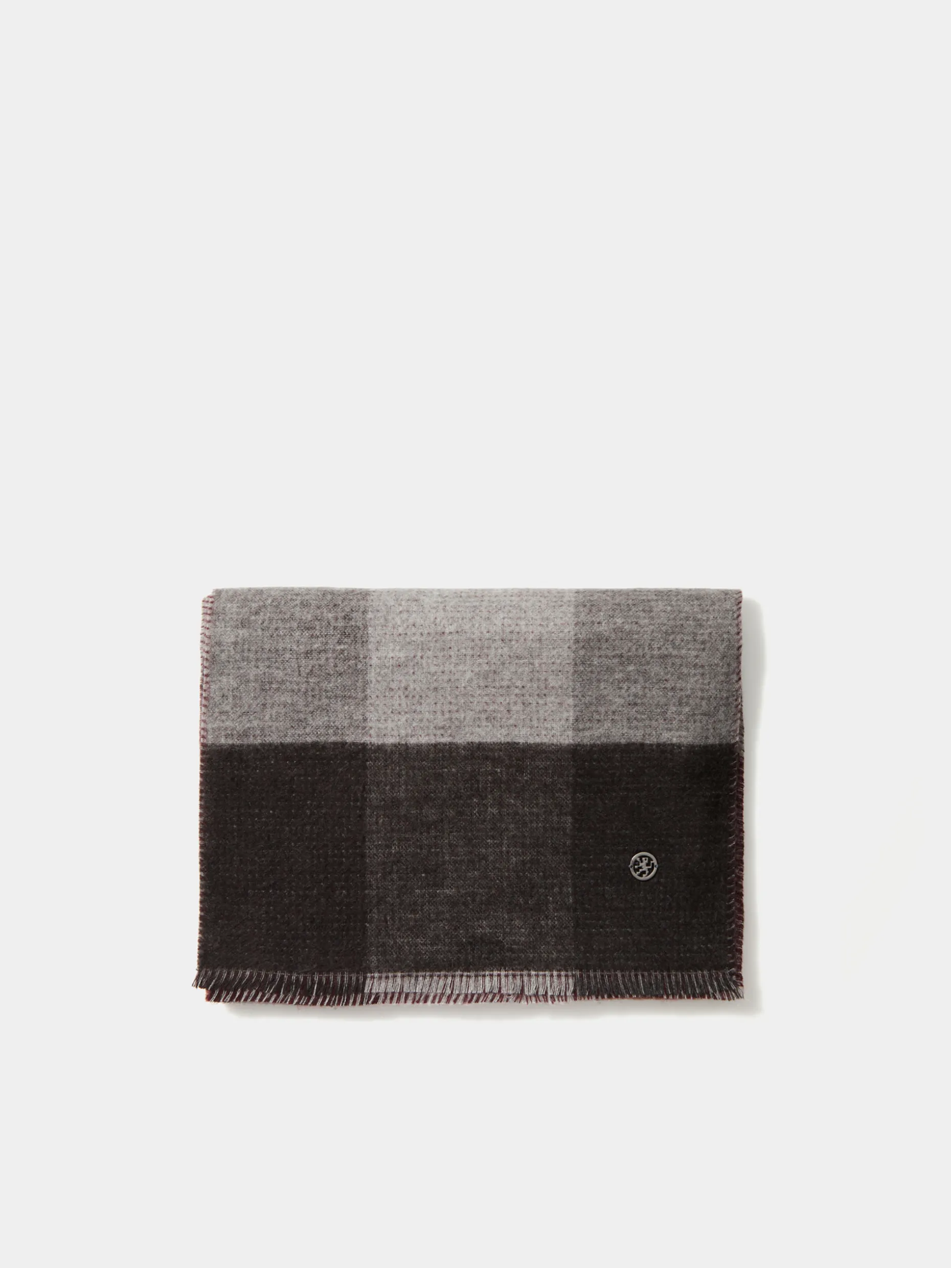 Cachecol com padrão de quadrados nos tons relacionados e aplicação gun metálica costurada numa das extremidades. Medidas: 30cmX180cm