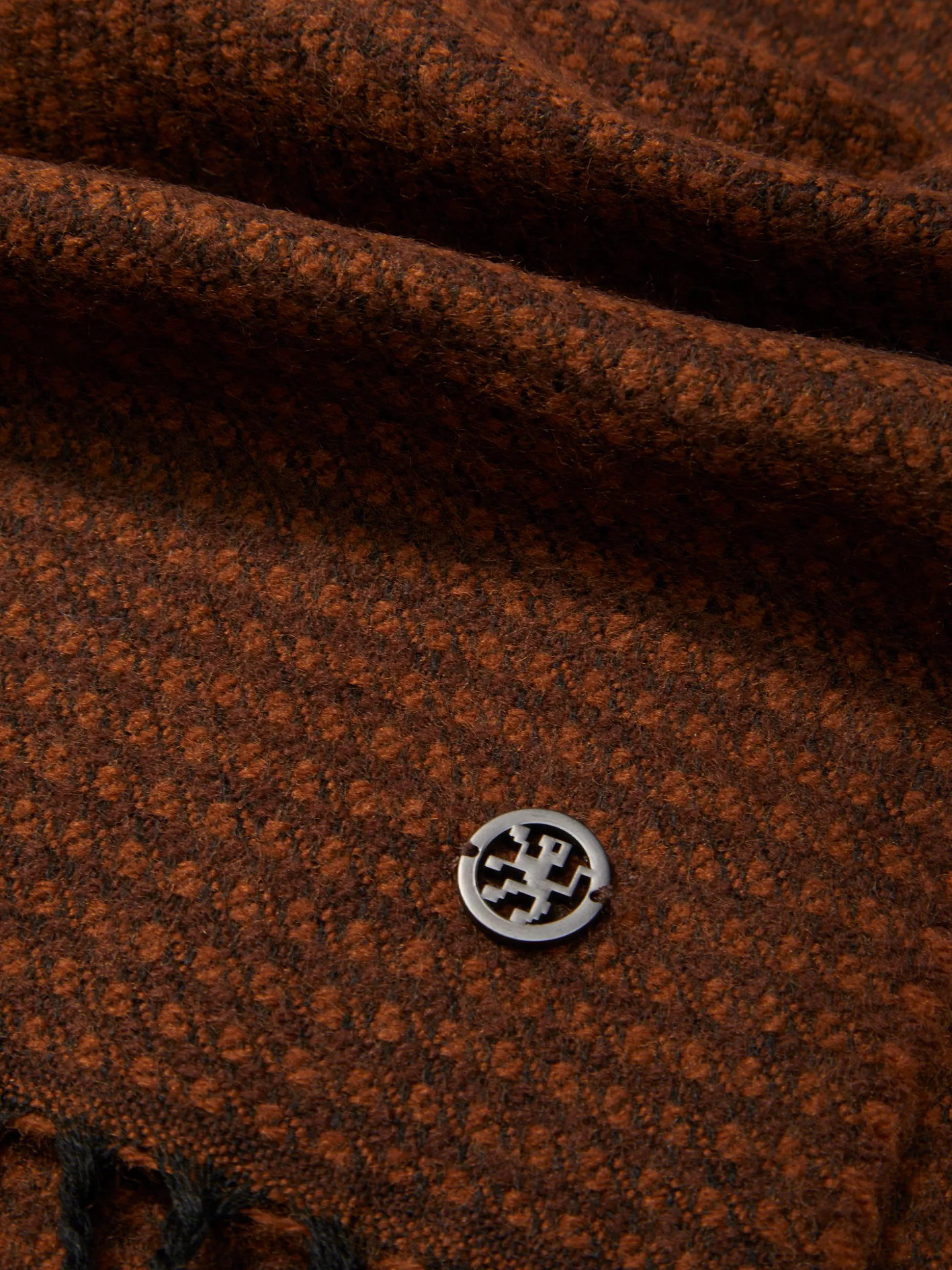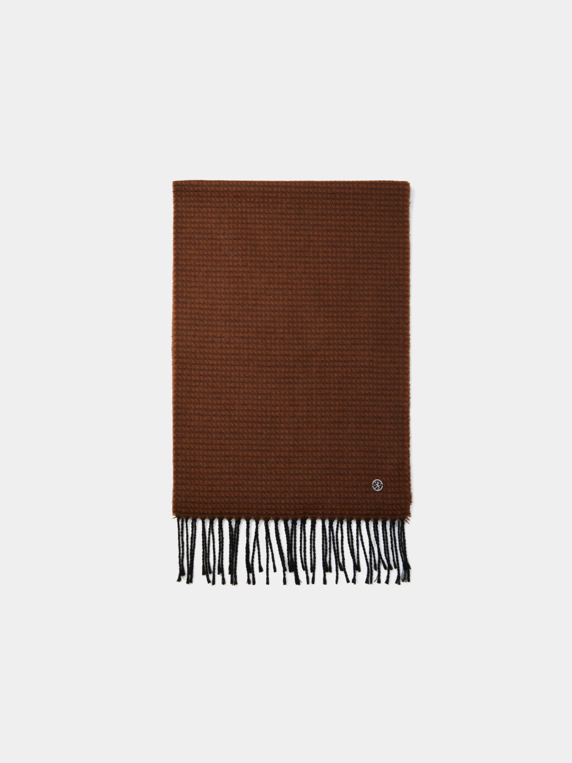 Cachecol com padrão geométrico de dois tons para se proteger nos dias mais frios. Tem uma pequena aplicação da marca no canto e finaliza, nas extremidades, com franjas. Disponível em várias cores.