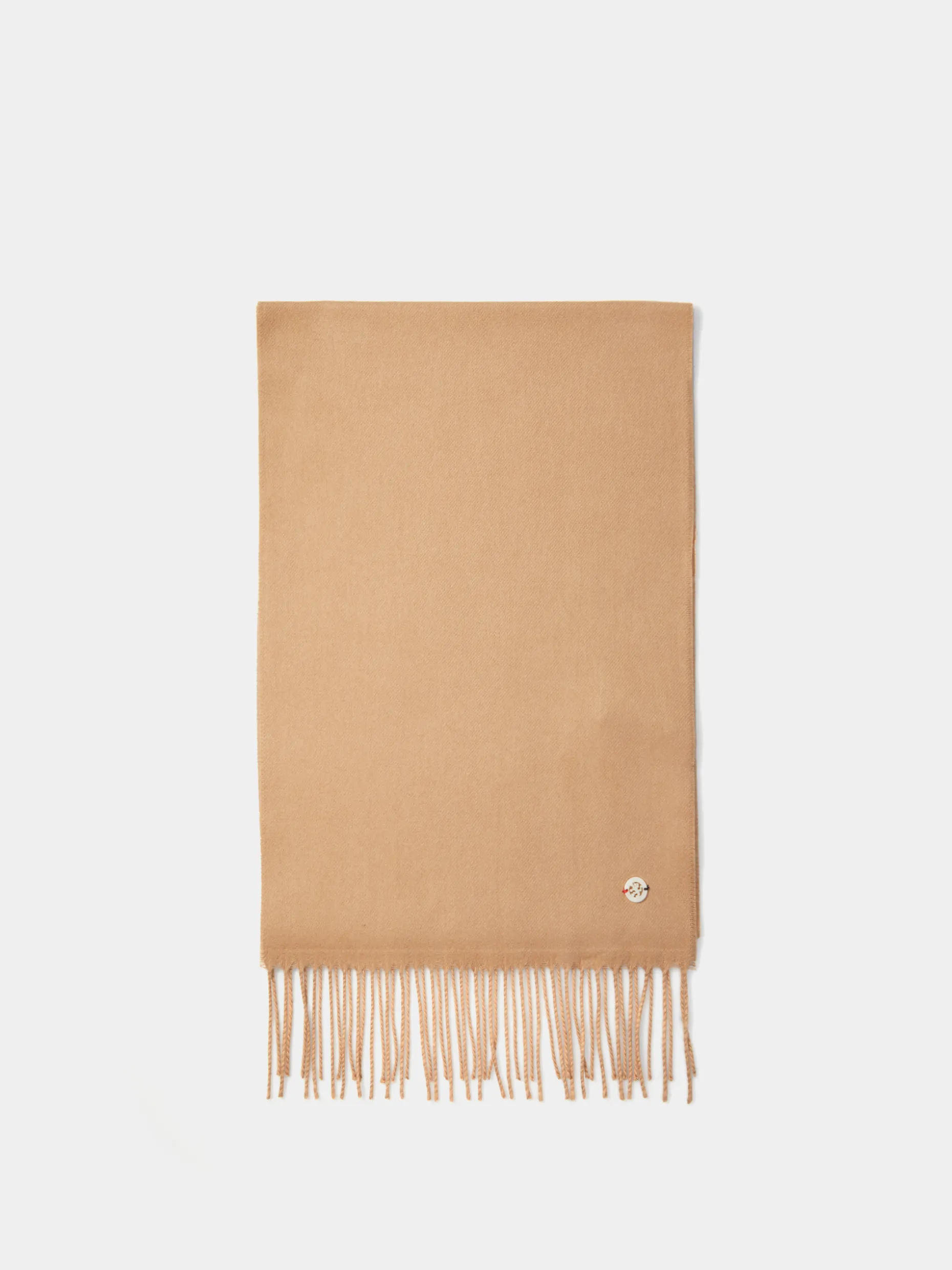 Mantenha as miúdas quentes e confortáveis com este cachecol liso com franjas e placa redonda de leão nas extremidades. Disponível em várias cores.