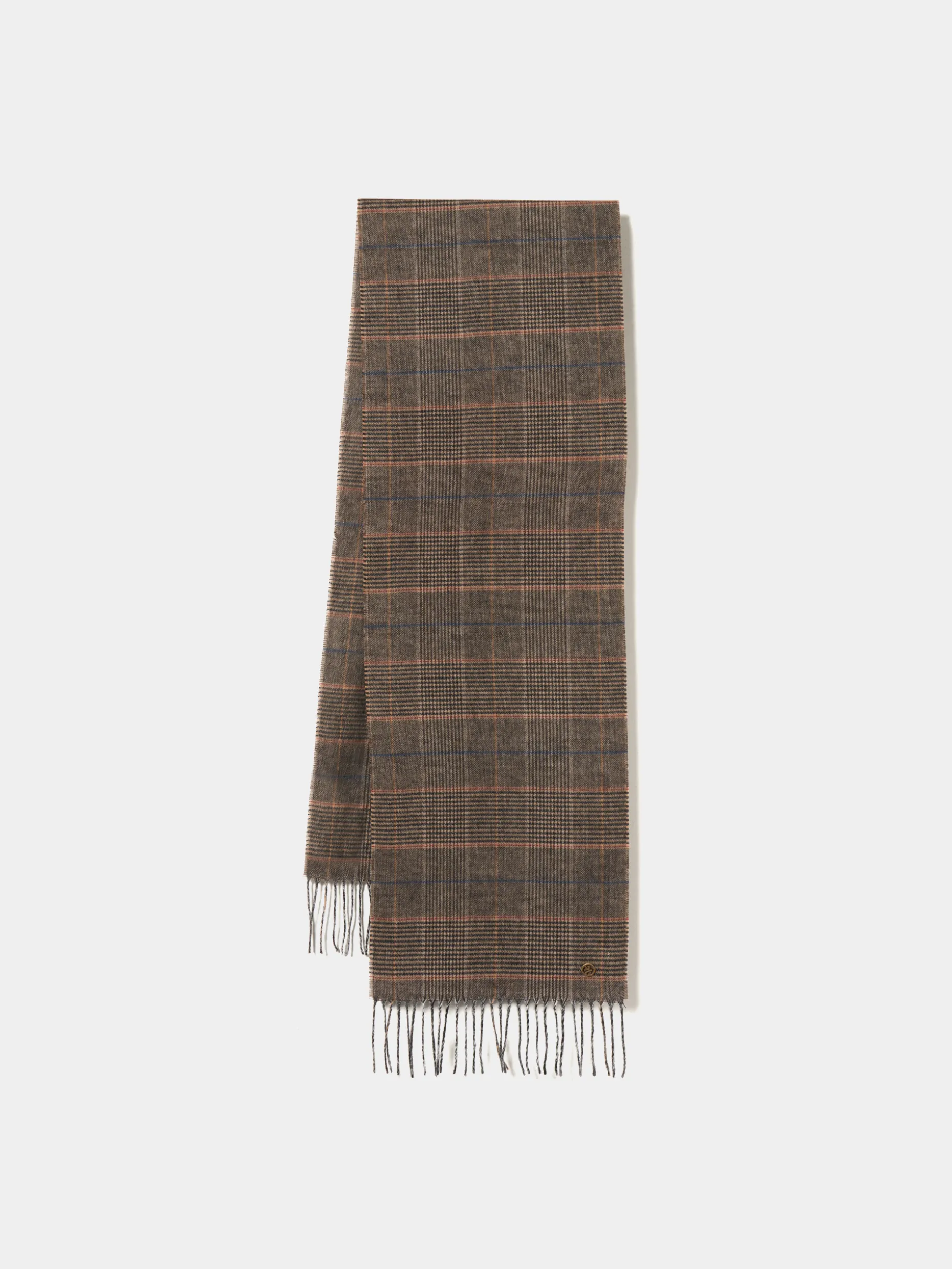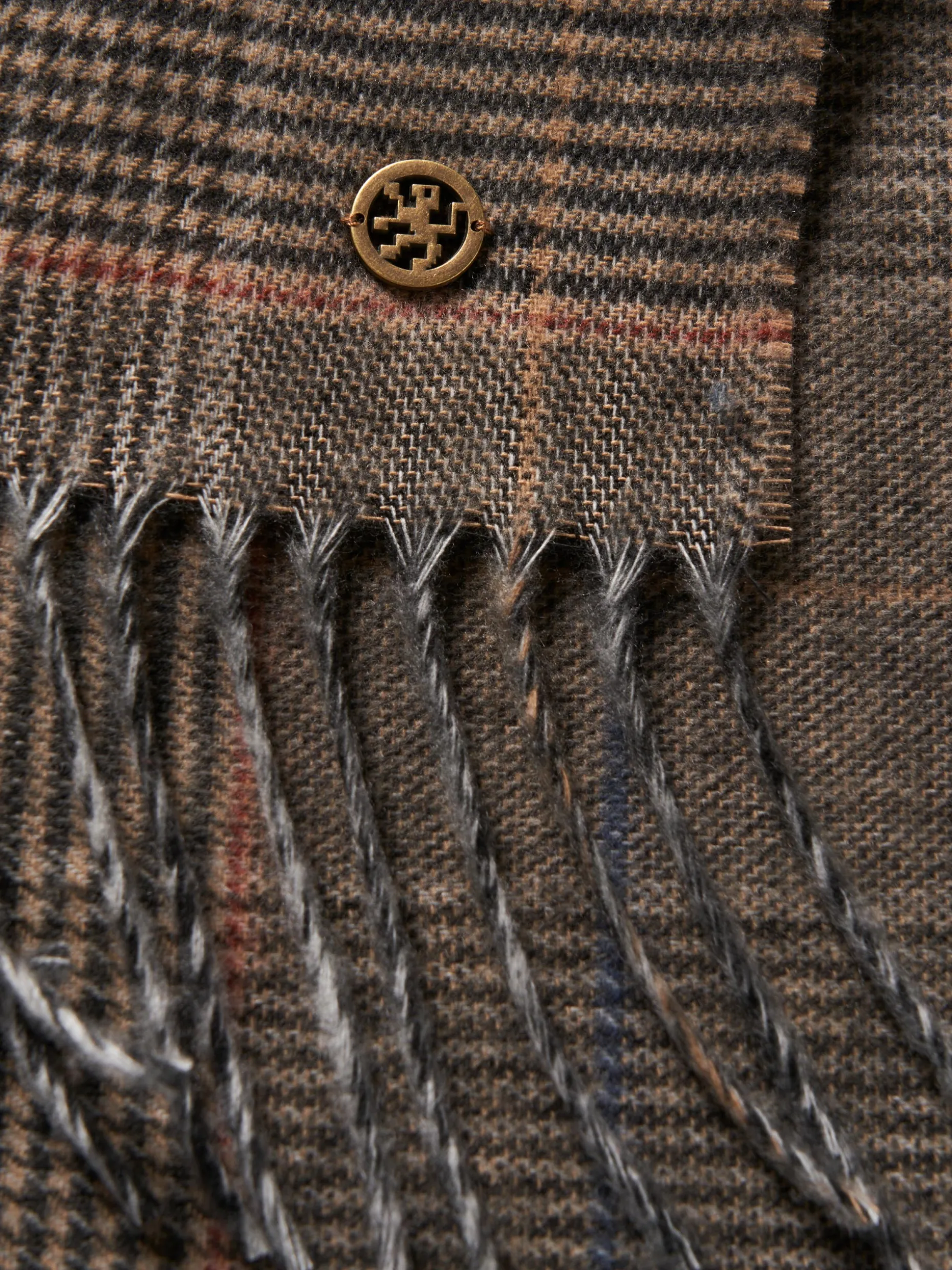Um acessório de inverno elegante é este cachecol com padrão xadrez all over. Com franjas nas extremidades e aplicação metálica num dos cantos. Disponível em várias cores.