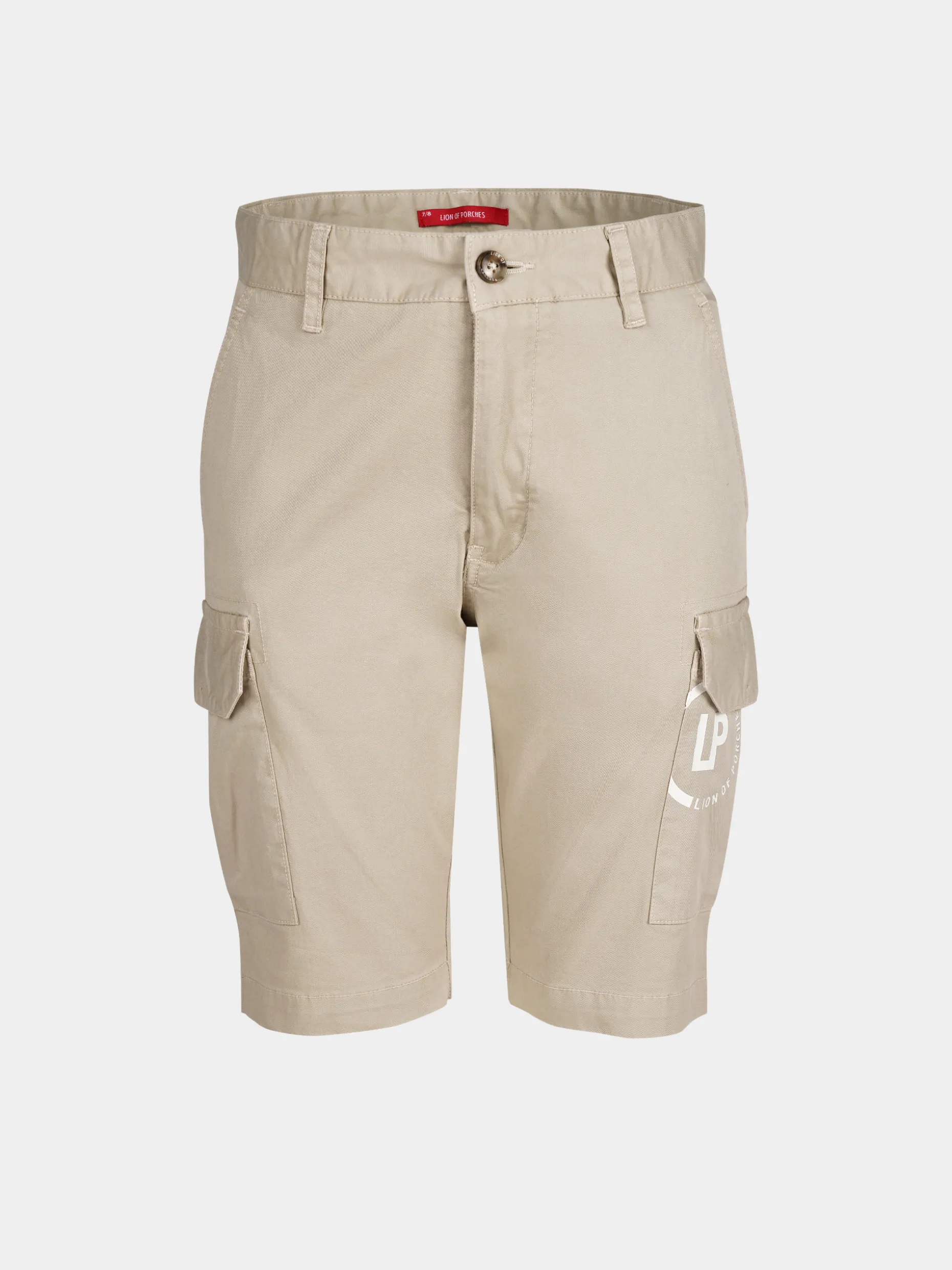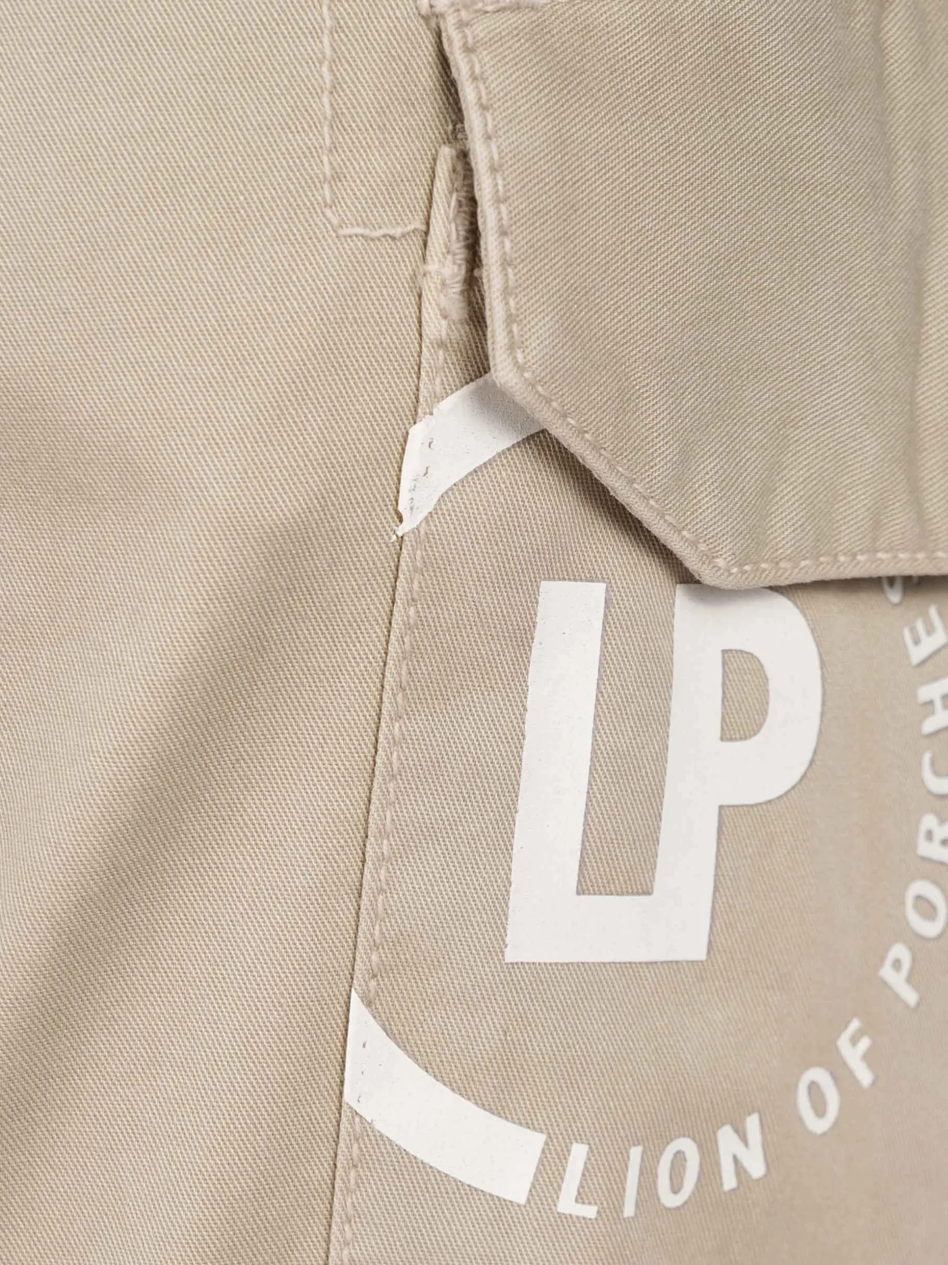 Calção com bolsos nas laterais. Bolso lateral com estampado Lion of Porches em contraste.