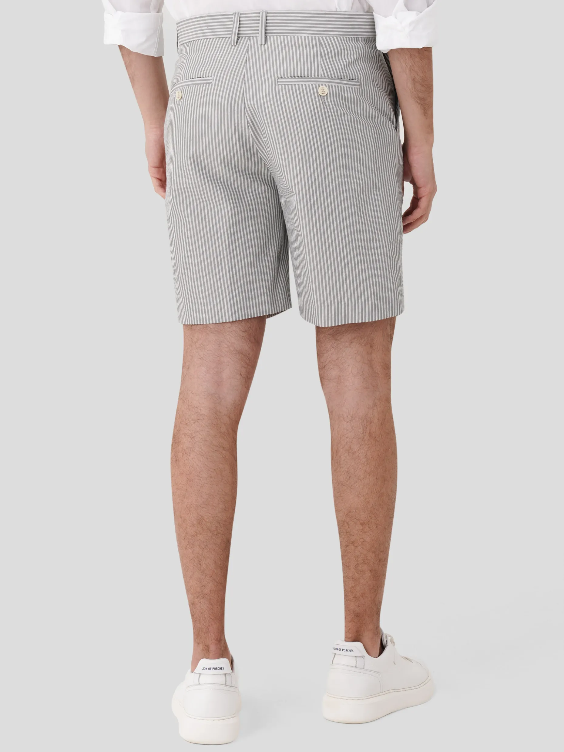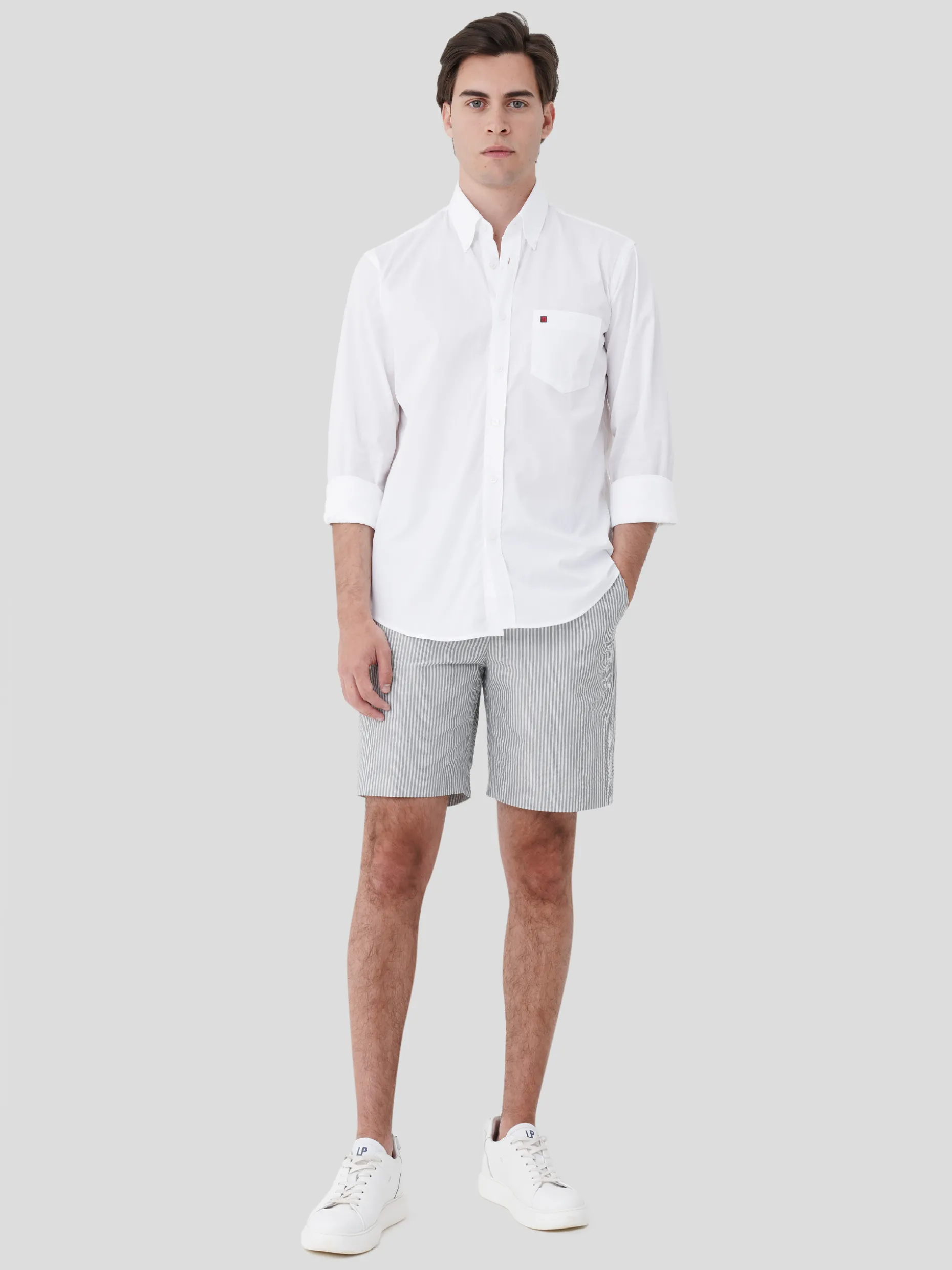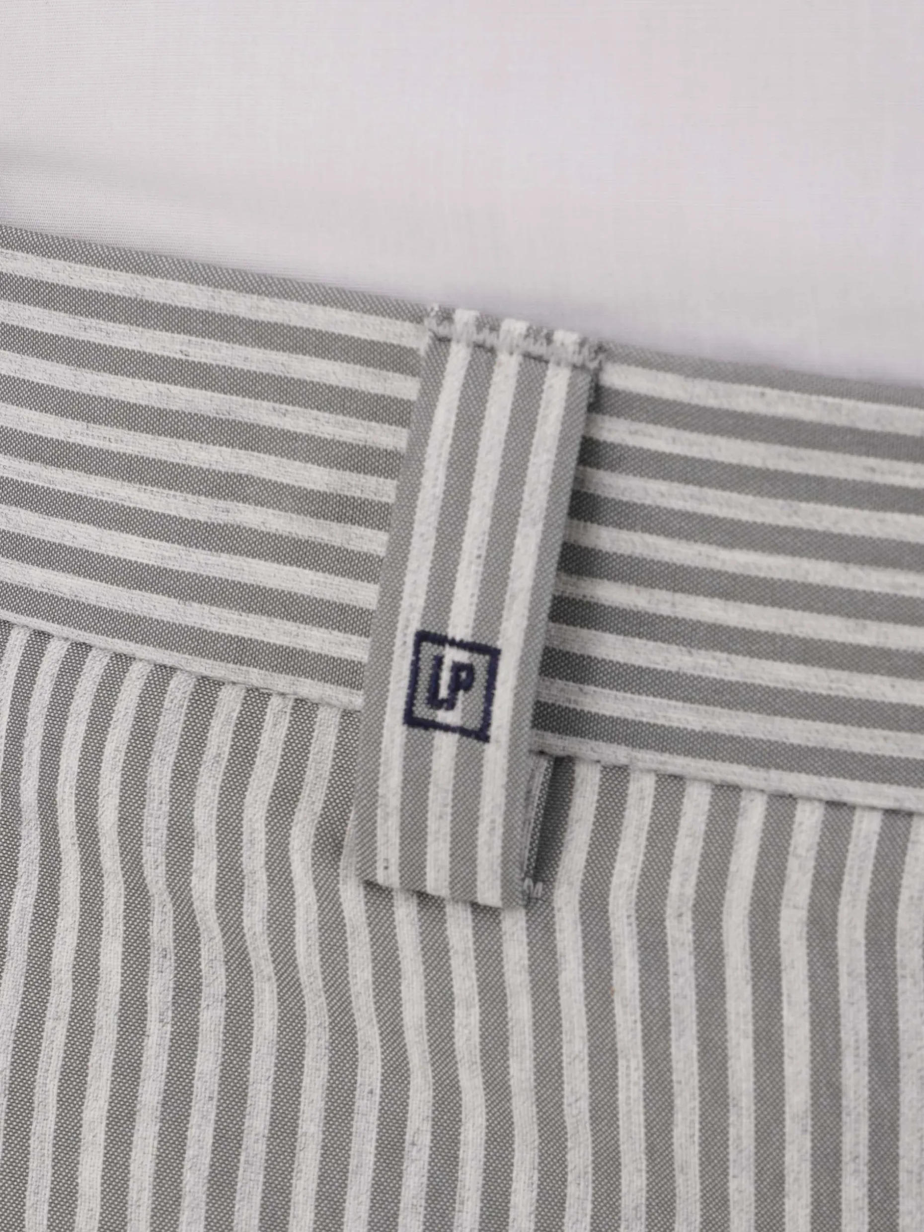 Bermudas em tecido de riscas. Bolsos laterais. Dois bolsos retos atrás com botão. Personalizadas com pequeno bordado quadrado “LP” na presilha e detalhes tricolores no interior do cinto.