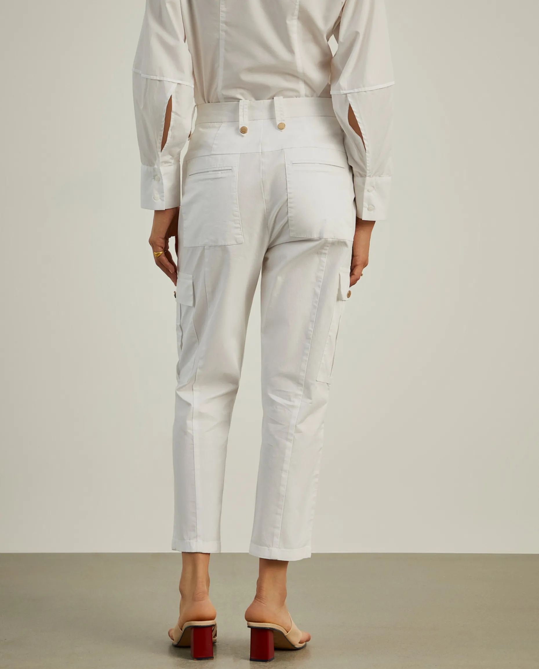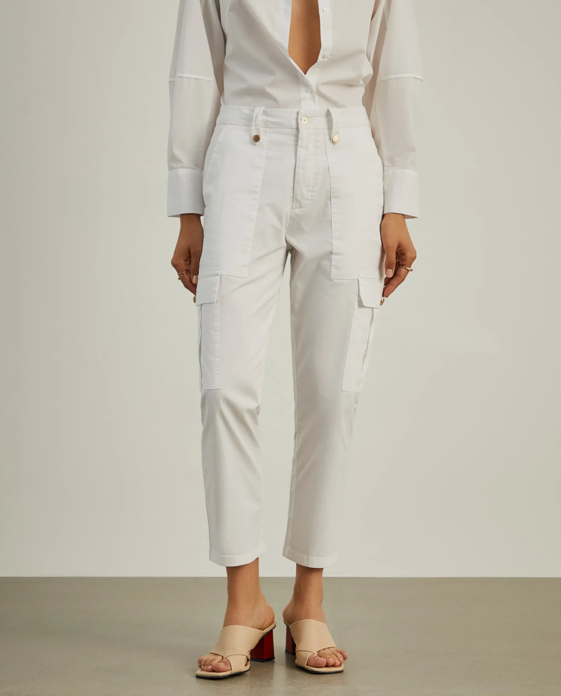 Calças cargo, de fit regular. Apertam com botão dourado e fecho de correr oculto por carcela. Além dos bolsos laterais típicos das calças cargo, têm também dois bolsos frontais e outros dois traseiros. São confecionadas em algodão com uma pequena percentagem de elastano para maior conforto e liberdade de movimentos.