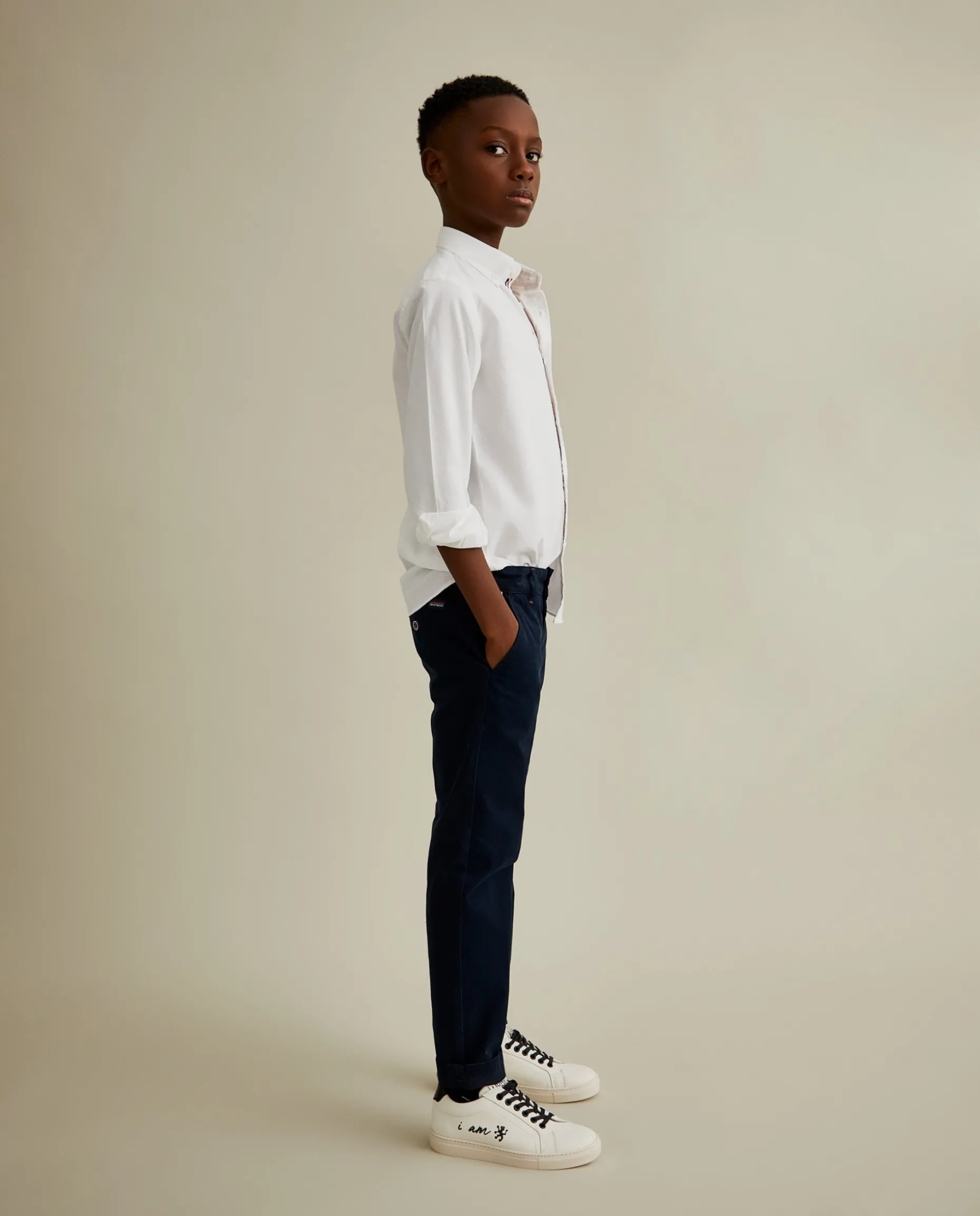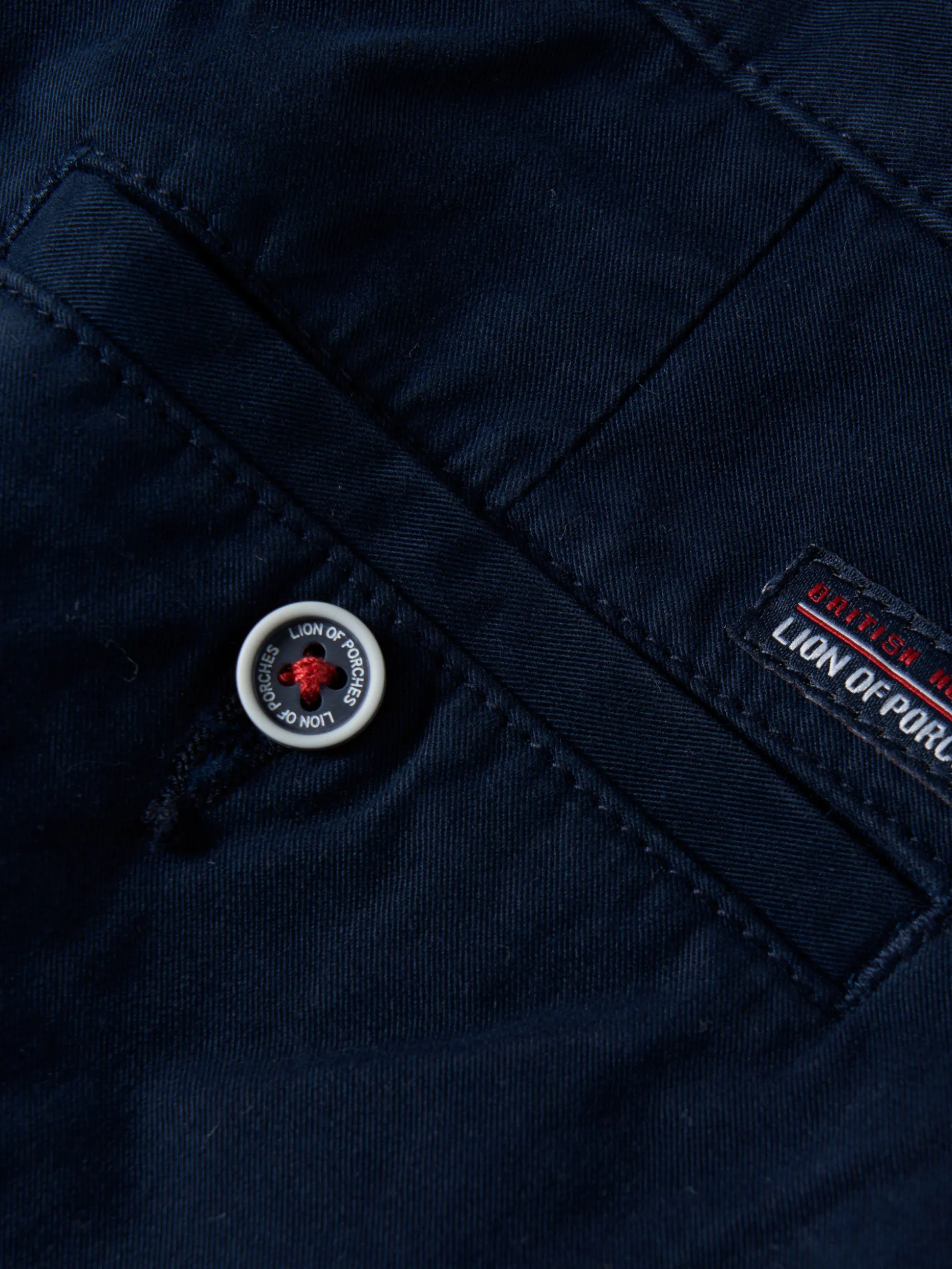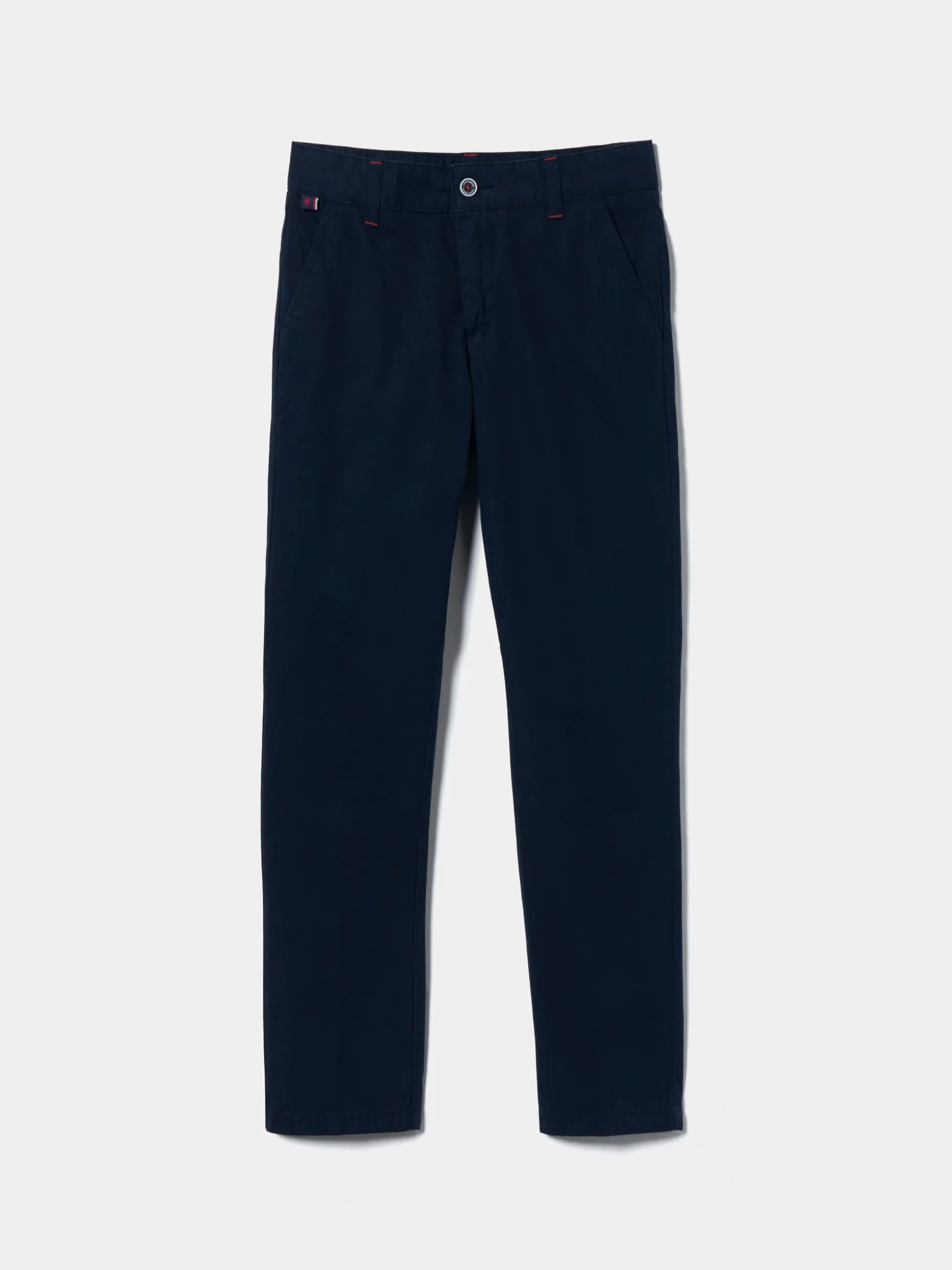 Calças chino, regular fit, em sarja. Apertam com fecho zíper e botão personalizado. Pormenor de fita corporativa tricolor, de lado, na cintura. Dois bolsos laterais. Costuras com cor em contraste.