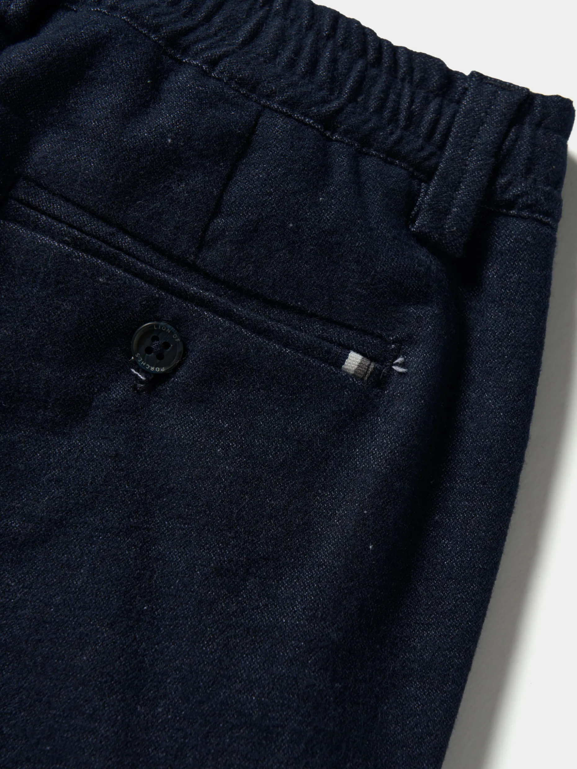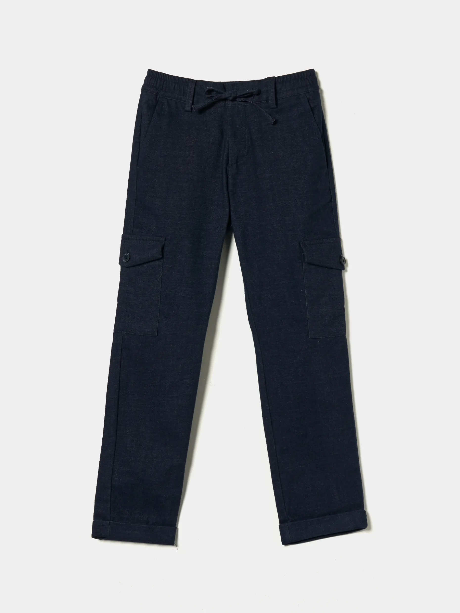Finalize os looks dele com estas calças chino de ganga. Com cintura elástica, apertam com um cordão e botões personalizados. São finalizadas com bolsos e o detalhe da fita de riscas tricolor atrás no bolso.