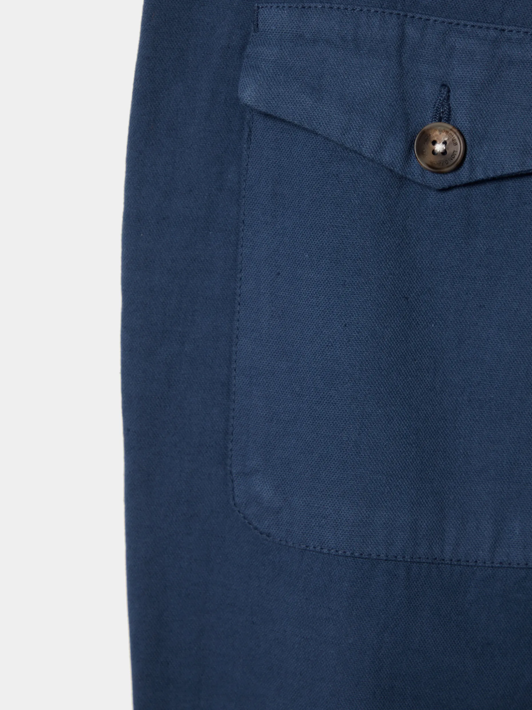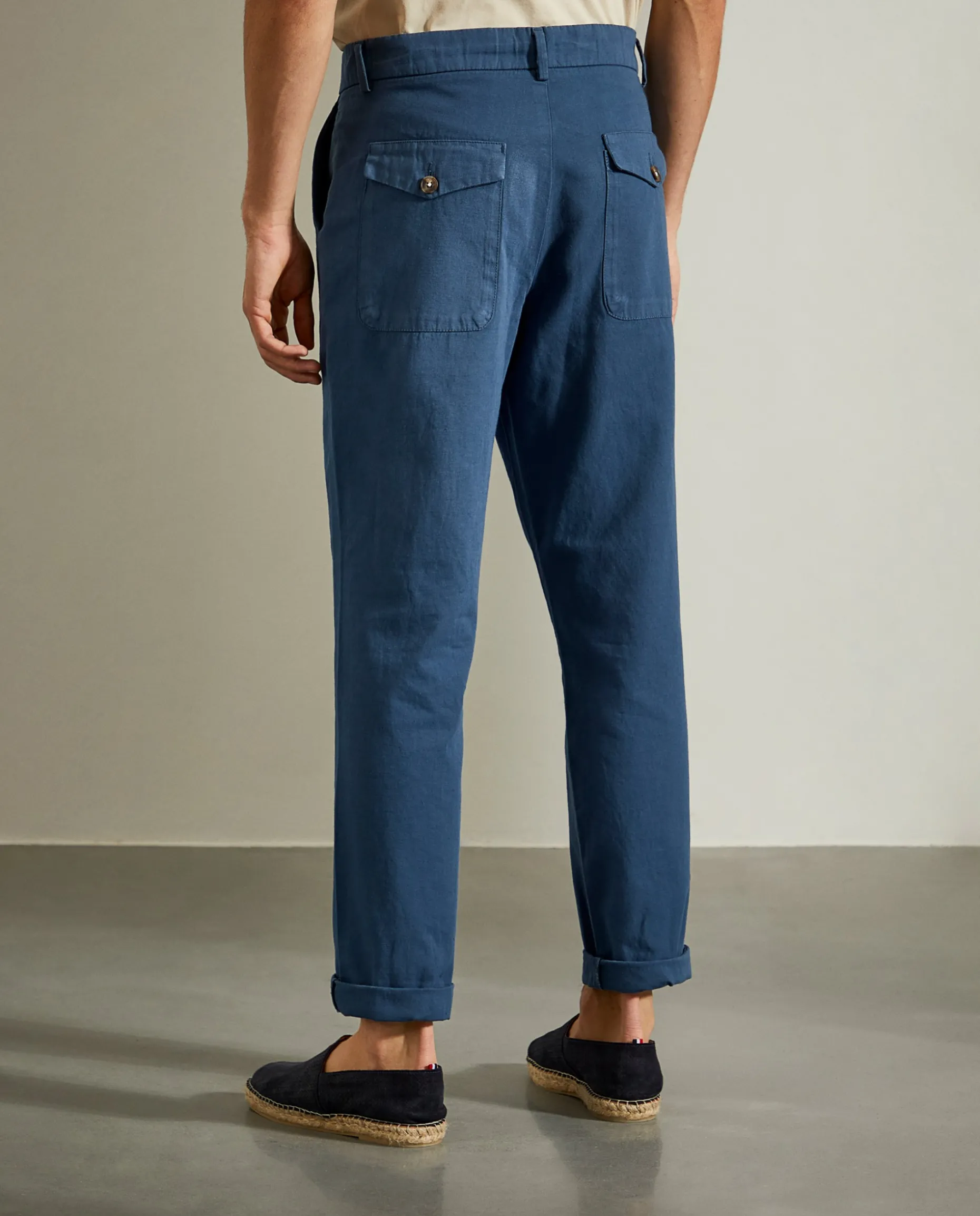 Calças chino regular fit com pregas. Apertam com fecho, cordão e botão personalizado. Bolsos laterais. Detalhe com fita de riscas na frente. Dois bolsos de chapa traseiros com pala e botão.