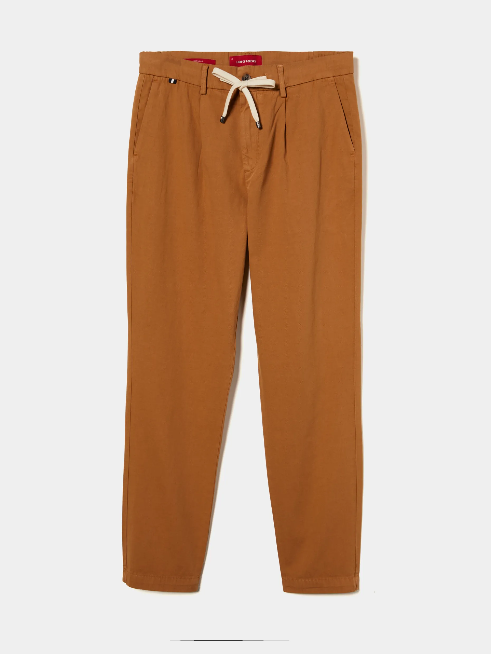 Calças chino regular fit com pregas. Apertam com fecho, cordão e botão personalizado. Bolsos laterais. Detalhe com fita de riscas na frente. Dois bolsos de chapa traseiros com pala e botão.