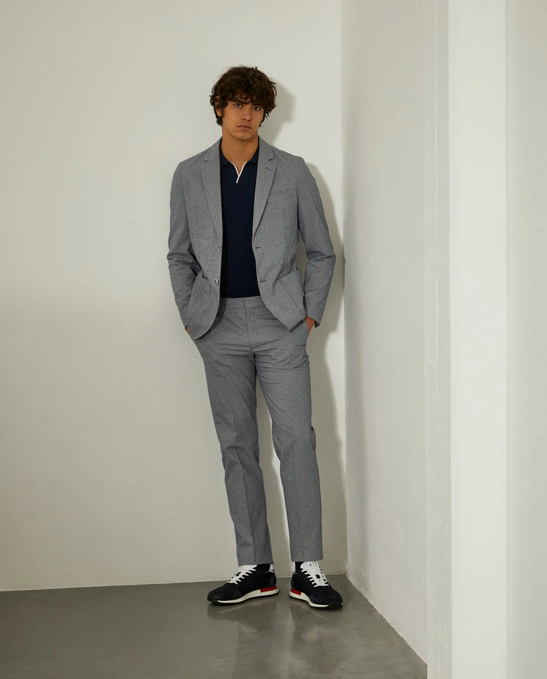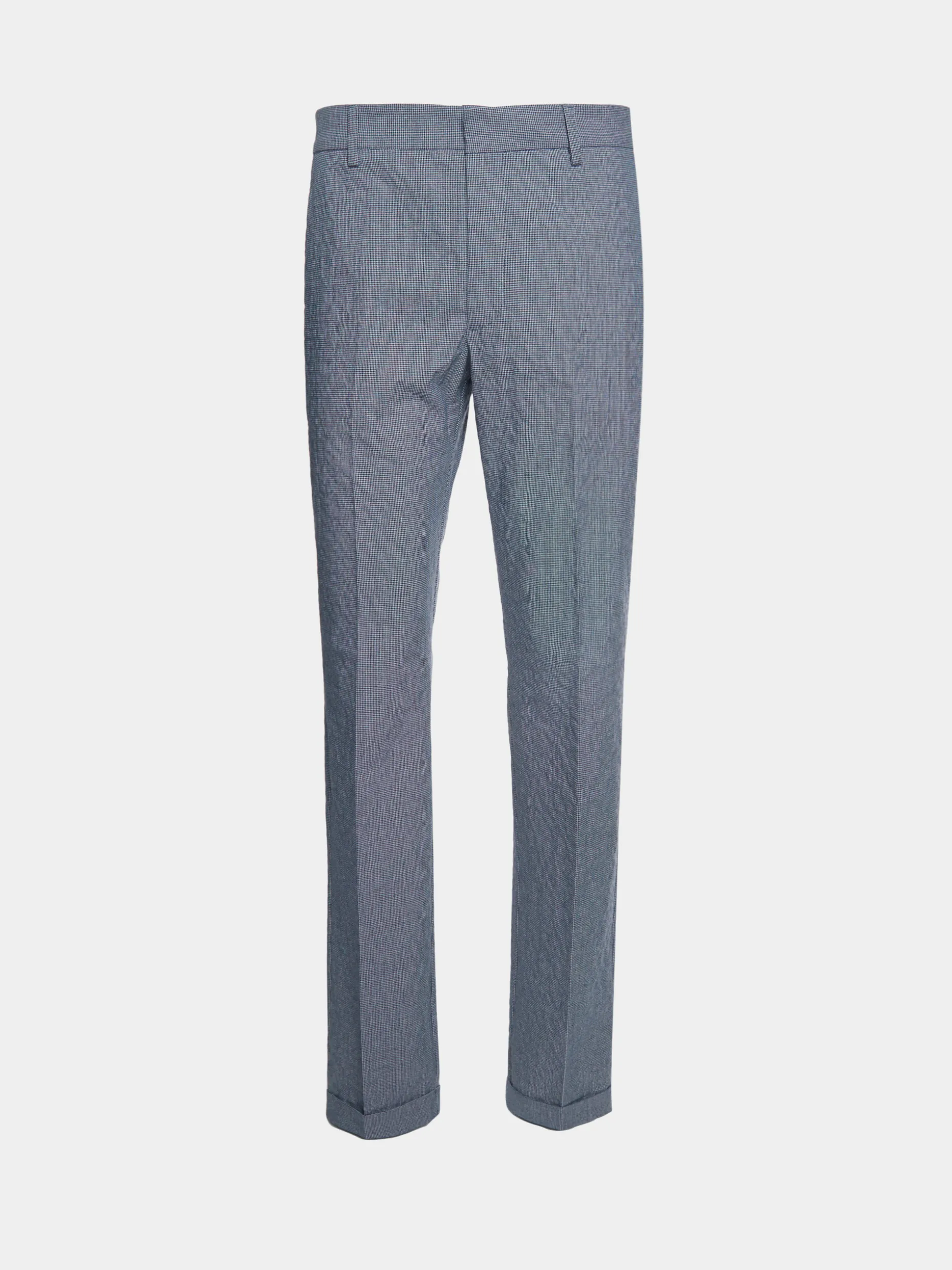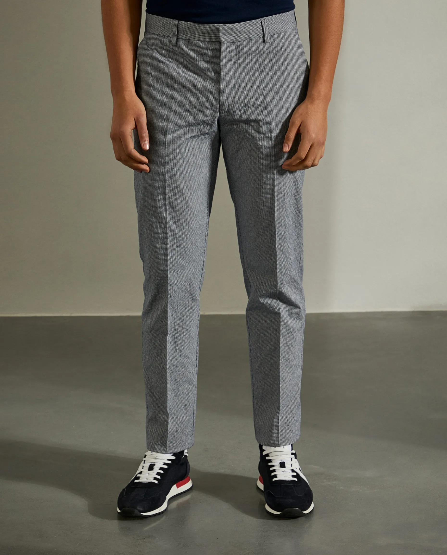 Calças chino regular fit, de padrão xadrez, com vinco. Apertam com fecho e guto. Bolsos laterais. Dois bolsos de um vivo e botão atrás com fita decorativa no bolso direito.