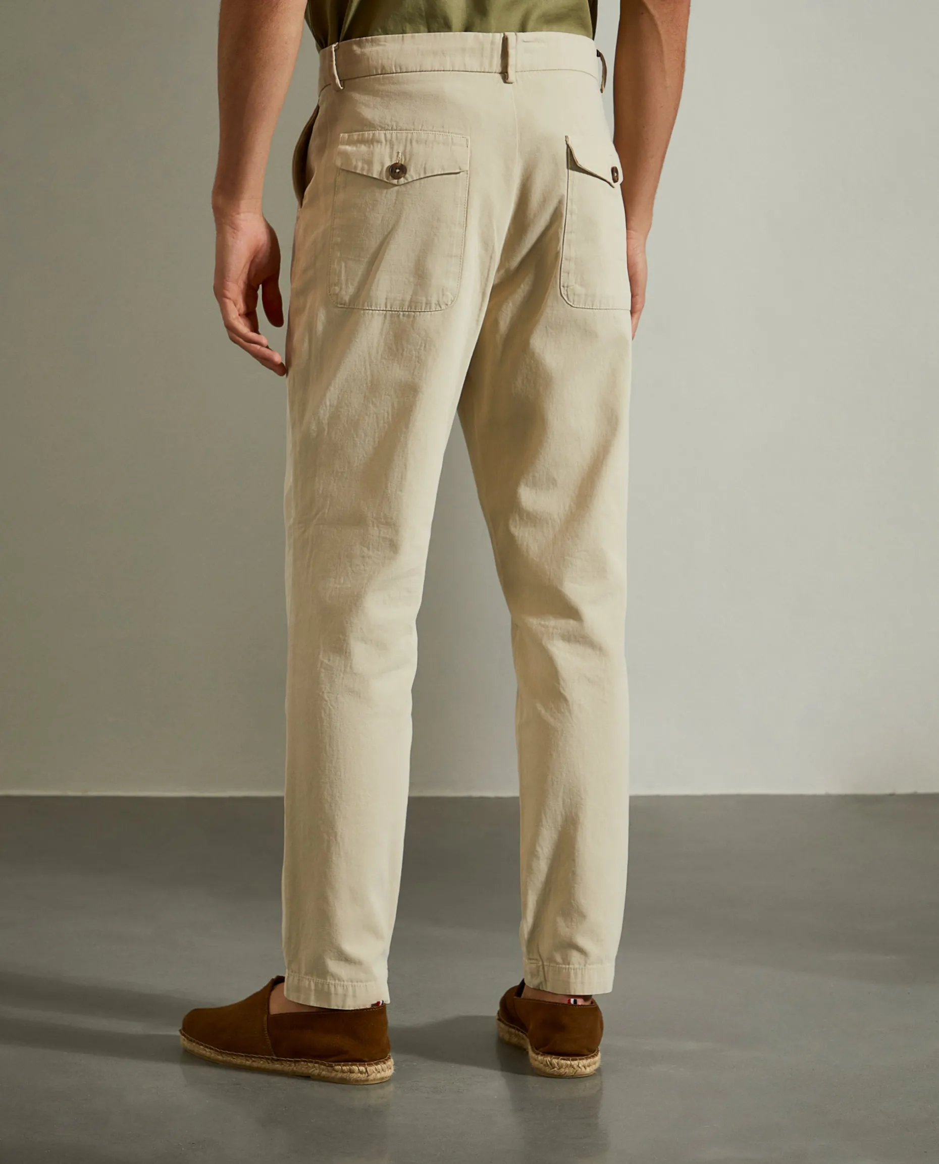 Calças chino regular fit com pregas. Apertam com fecho, cordão e botão personalizado. Bolsos laterais. Detalhe com fita de riscas na frente. Dois bolsos de chapa traseiros com pala e botão.