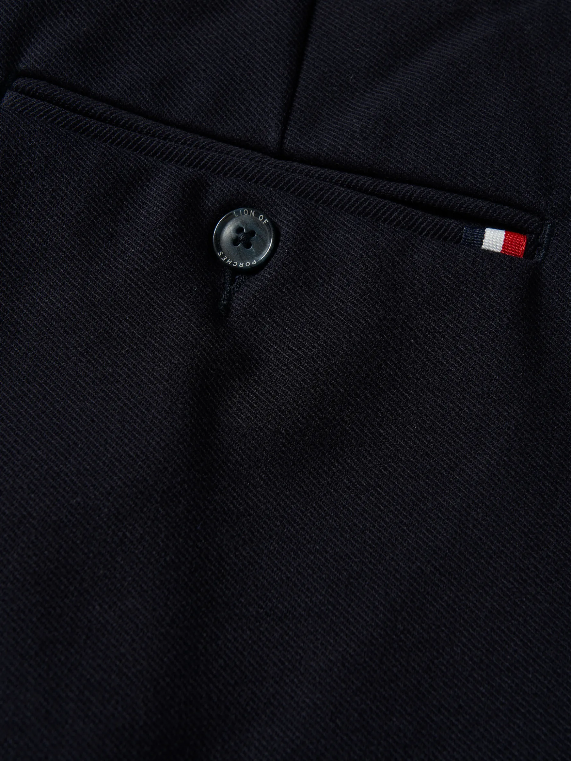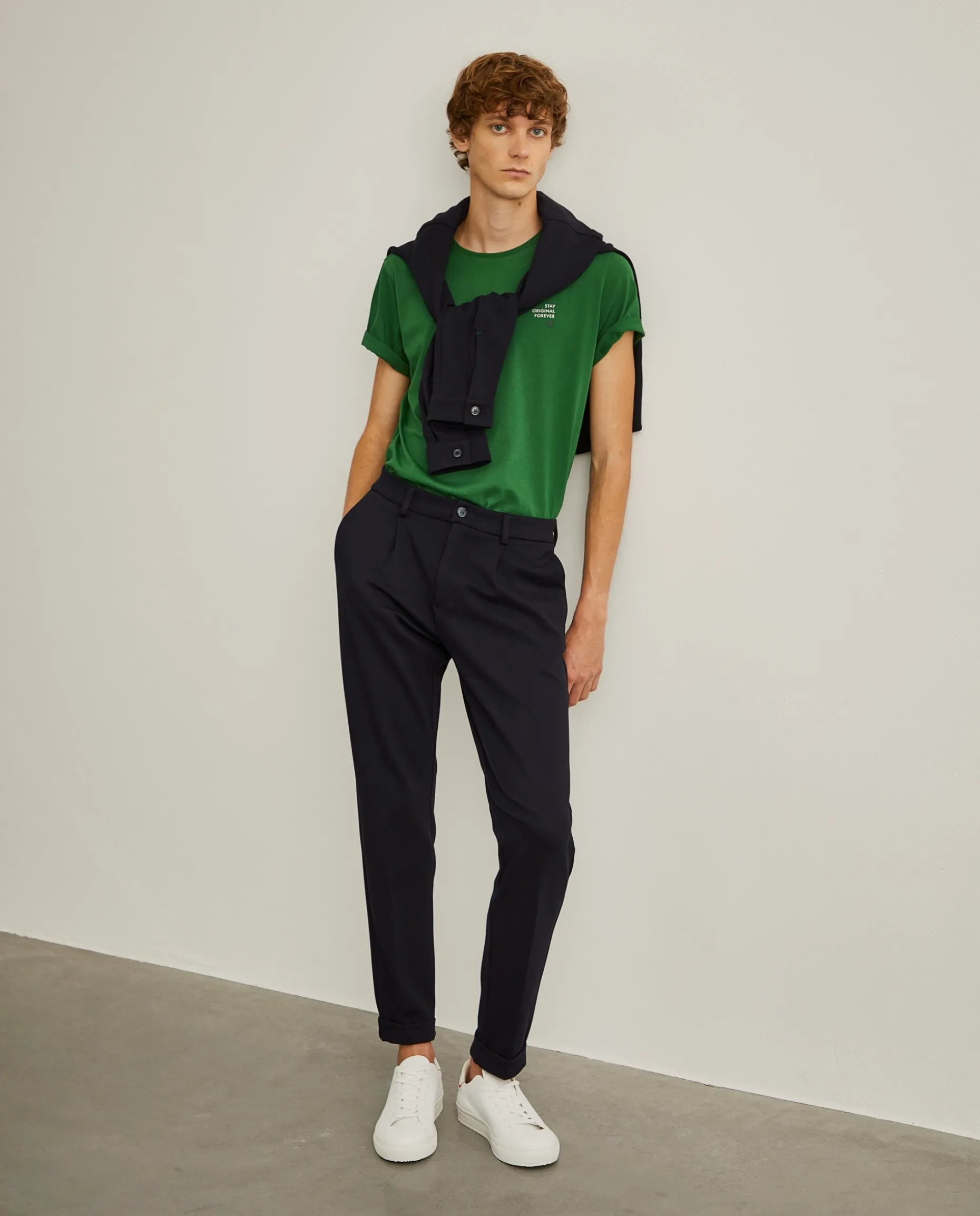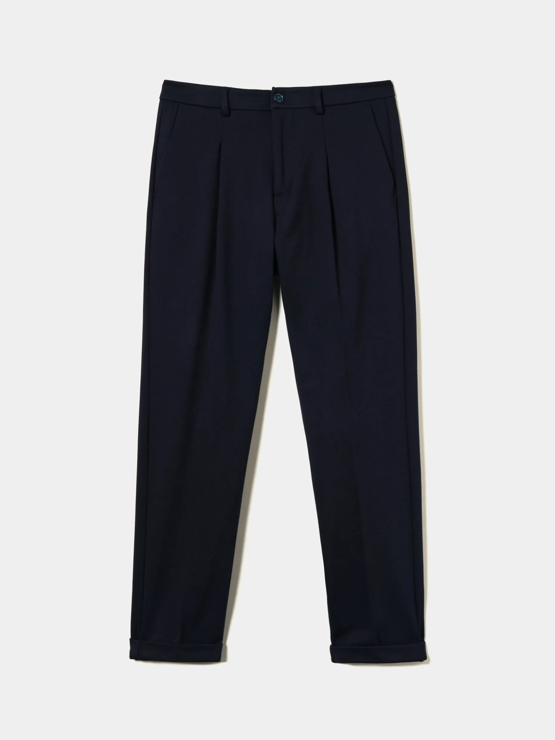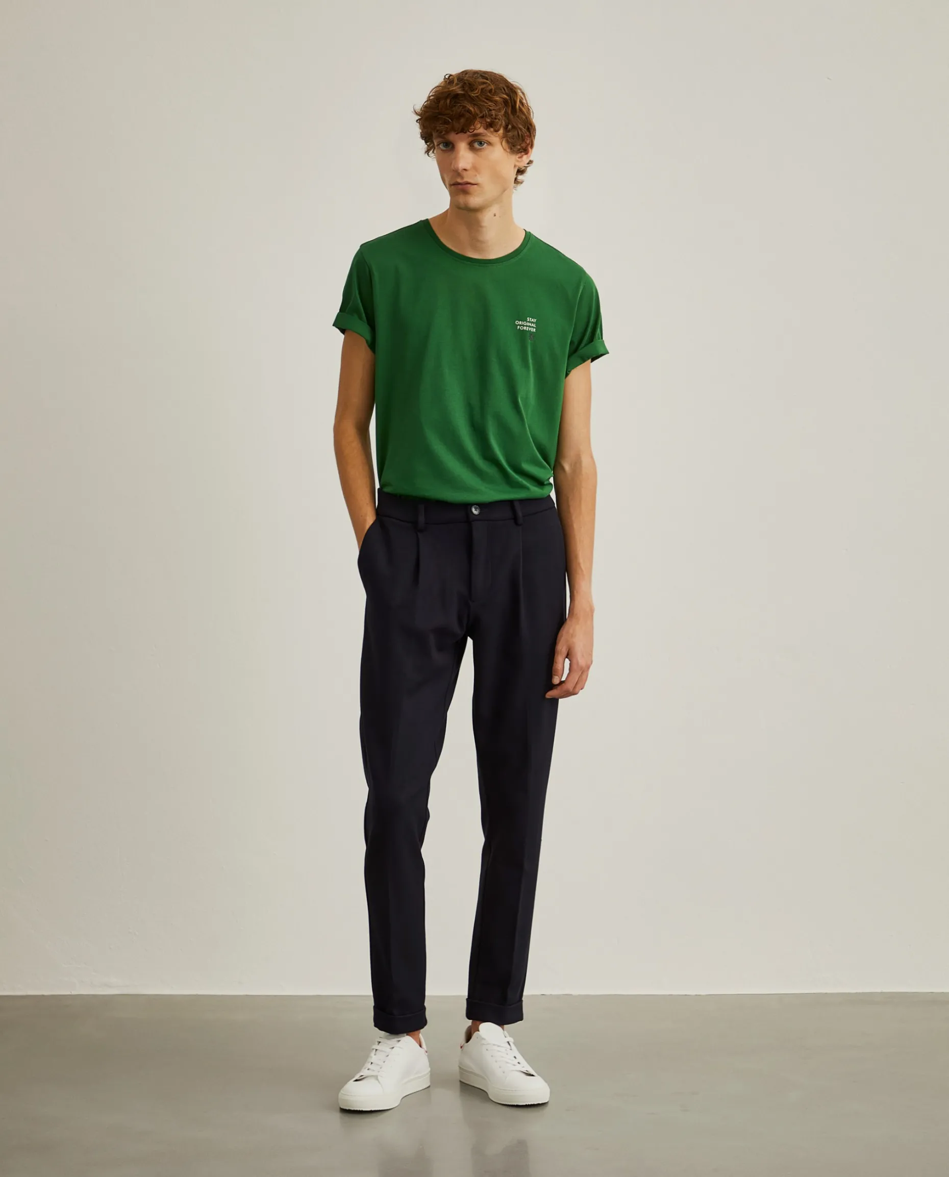 Calças Chino Regular Fit com pregas e com virola. Bolsos laterais. Apertam com fecho e botão personalizado. Dois bolsos de dois vivos com botões atrás com fita tricolor no bolso direito.