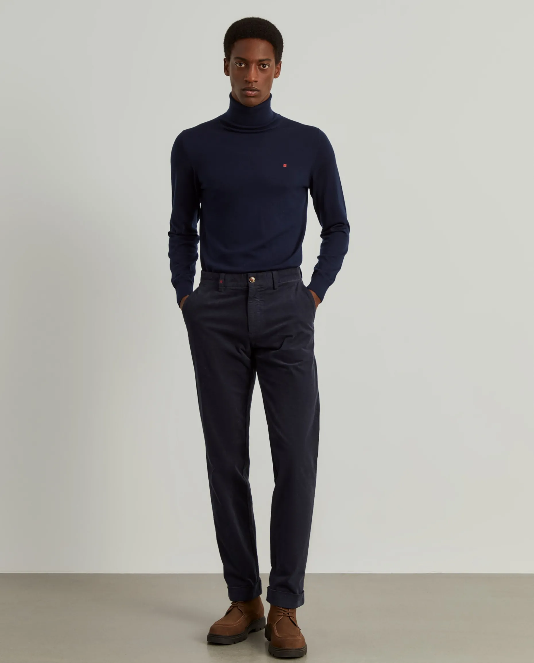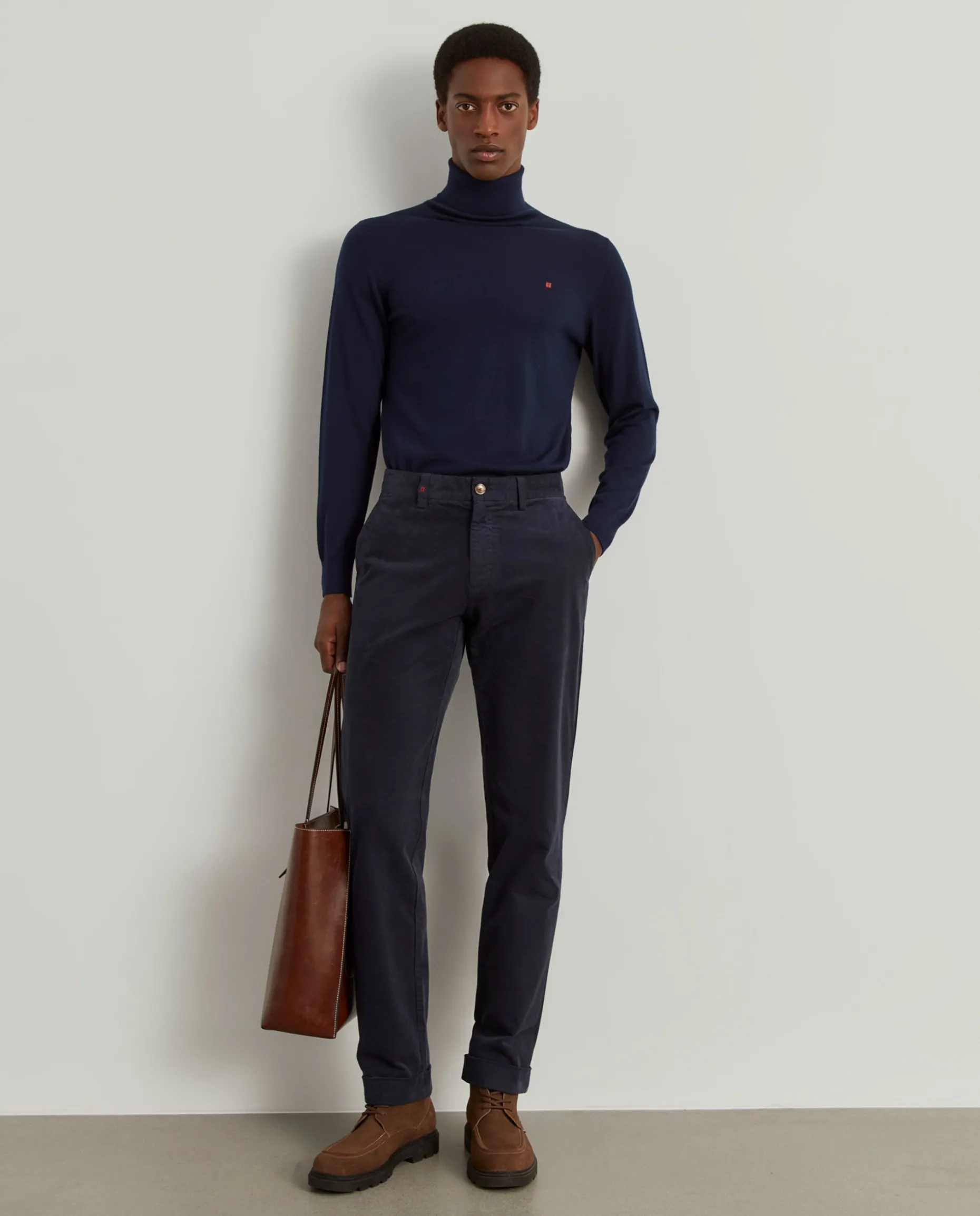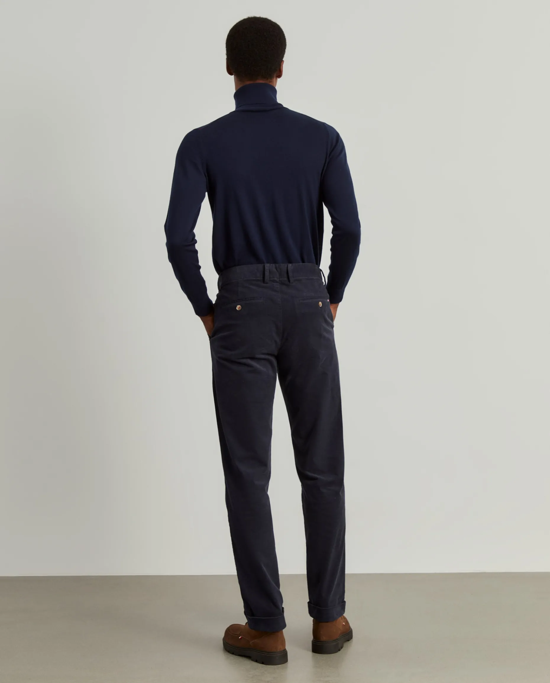 Calças chino, regular fit, em veludo. Apertam com botão e fecho oculto por carcela. Com bolsos frontais e traseiros e pequeno leão da marca na presilha da frente. Disponíveis em várias cores.