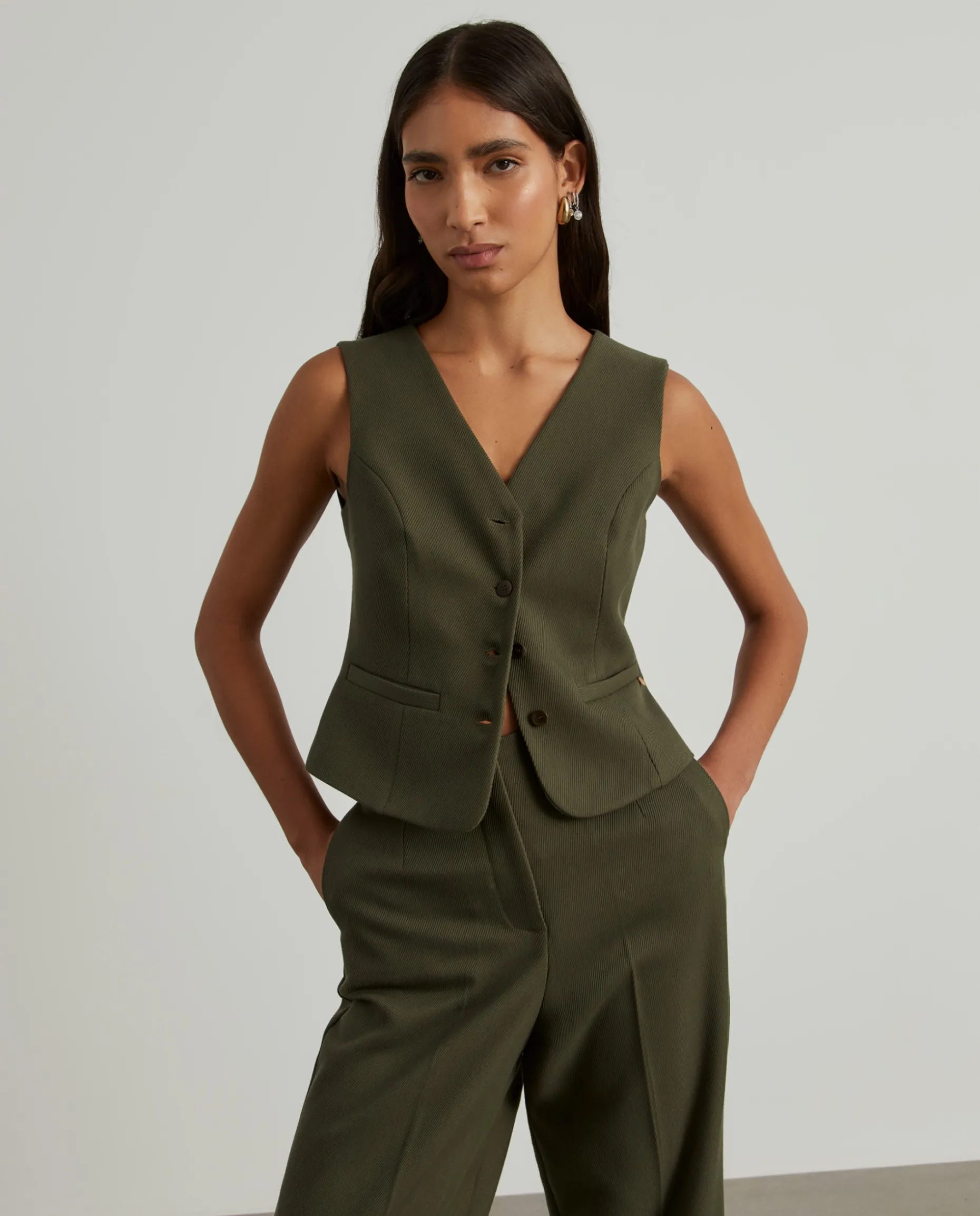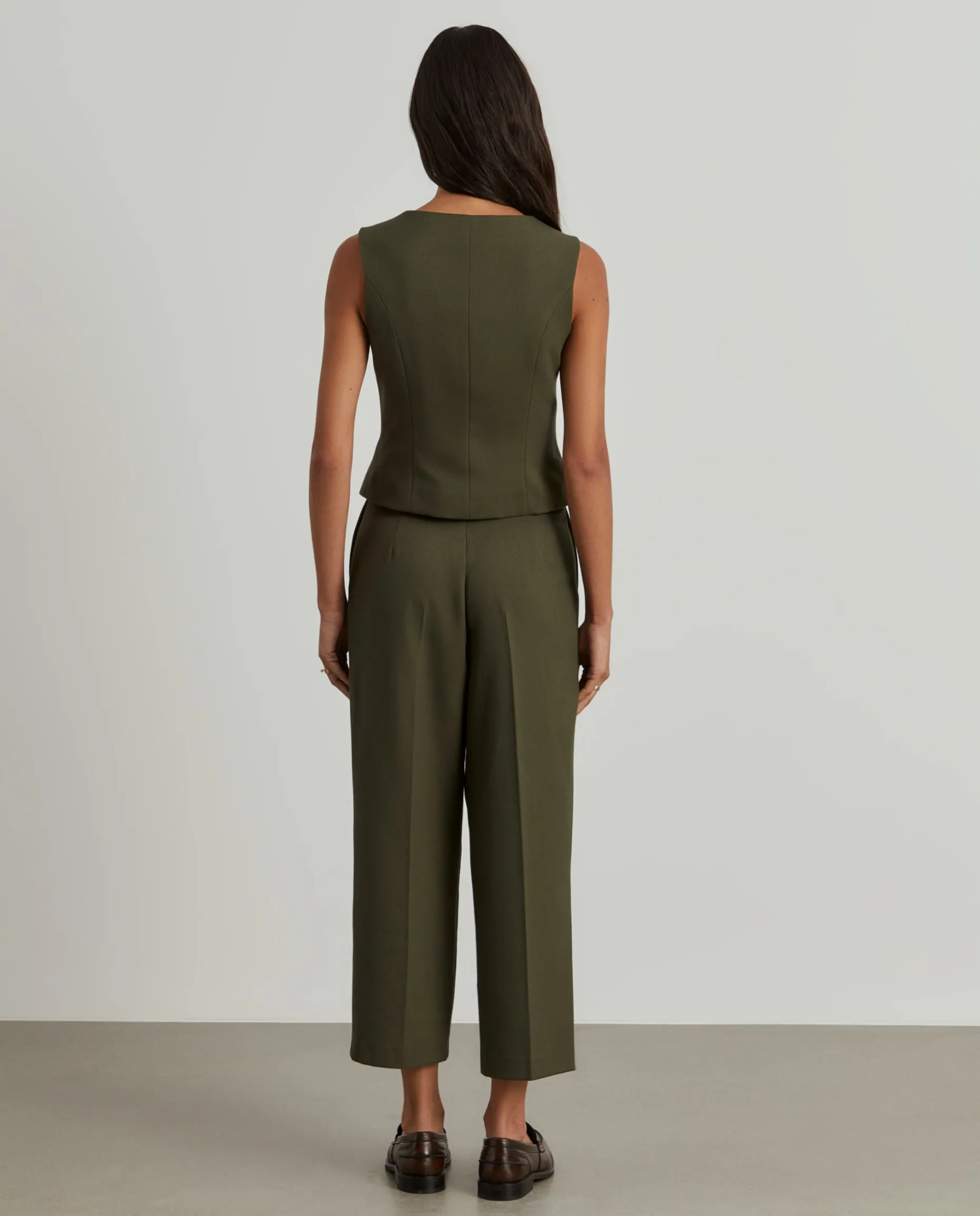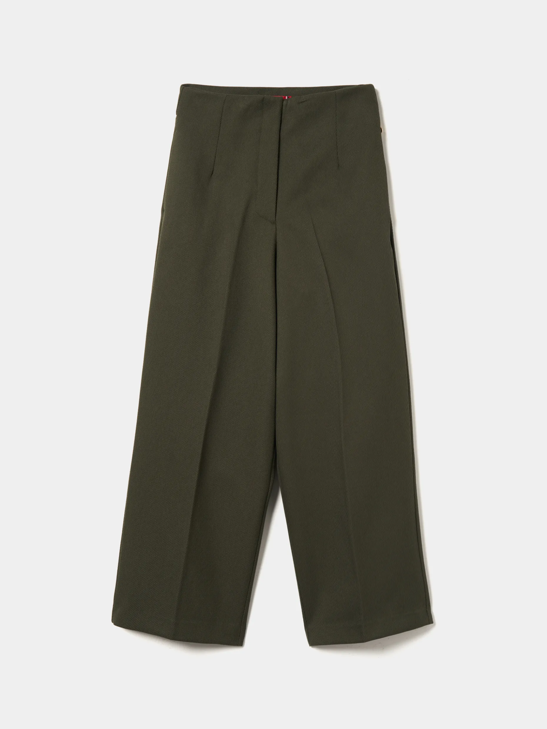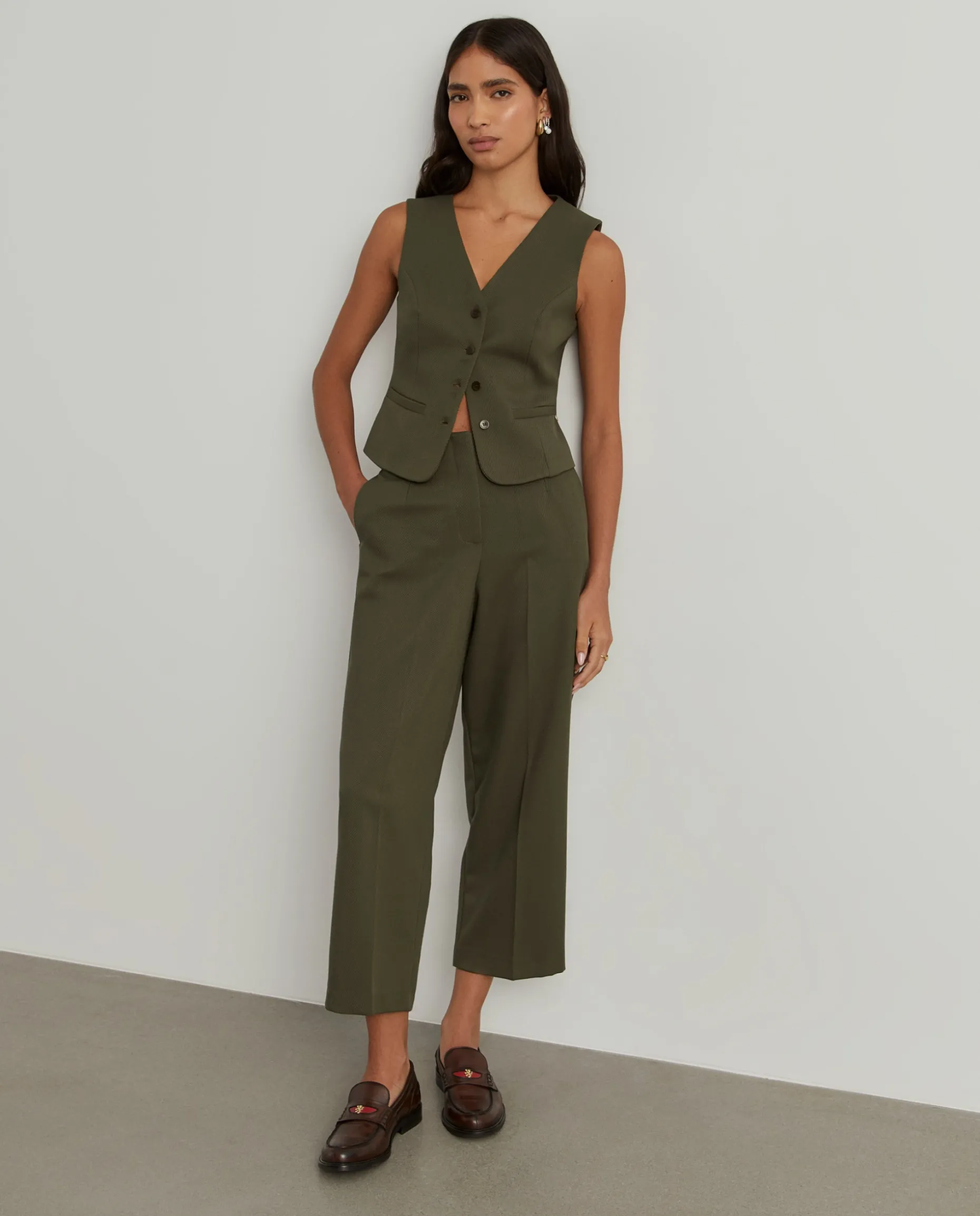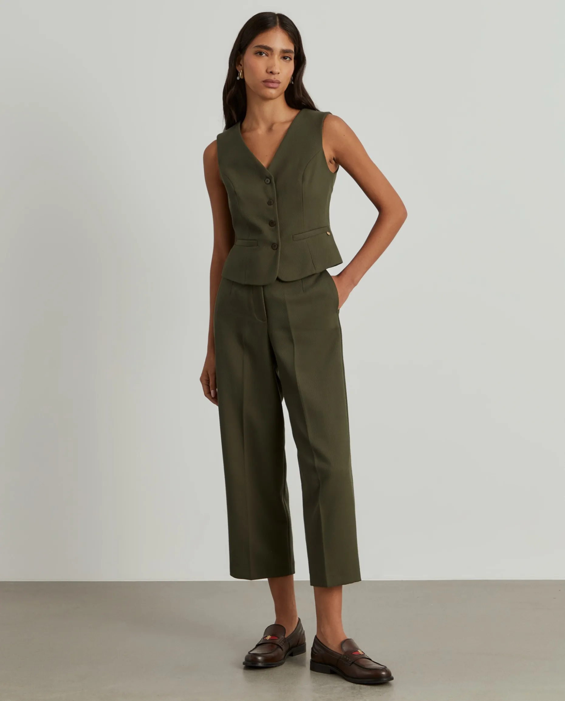 Elegantes e versáteis, estas calças cropped são uma adição perfeita para o seu guarda-roupa já que se adaptam aos mais variados estilos. Um modelo vincado e com pinças. Apertam na frente através de botão e fecho escondidos por carcela. Se é fã da tendência dos matching sets, veja também o colete da mesma coleção.