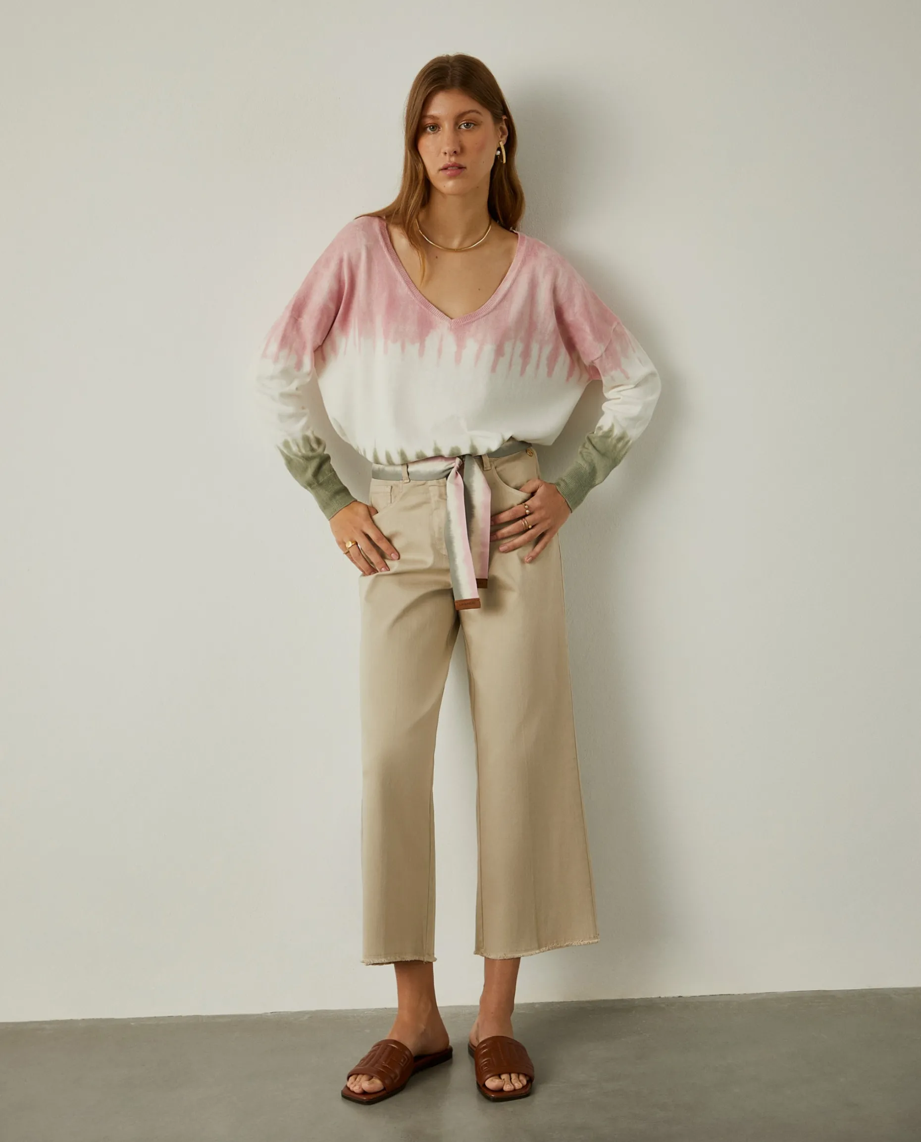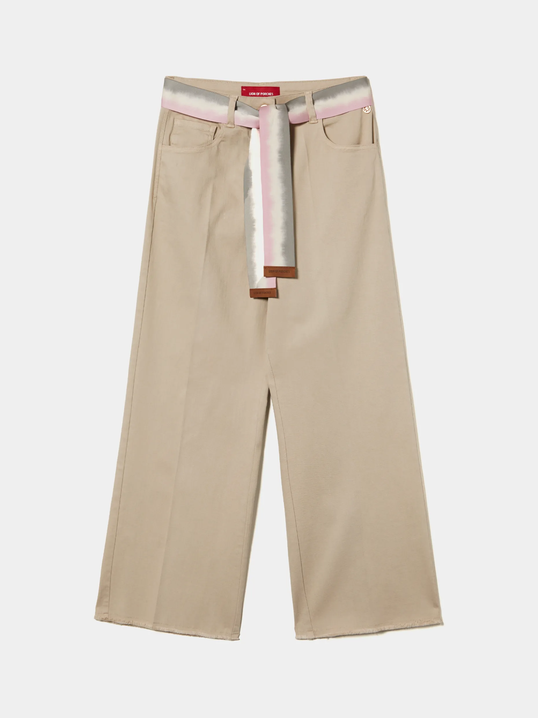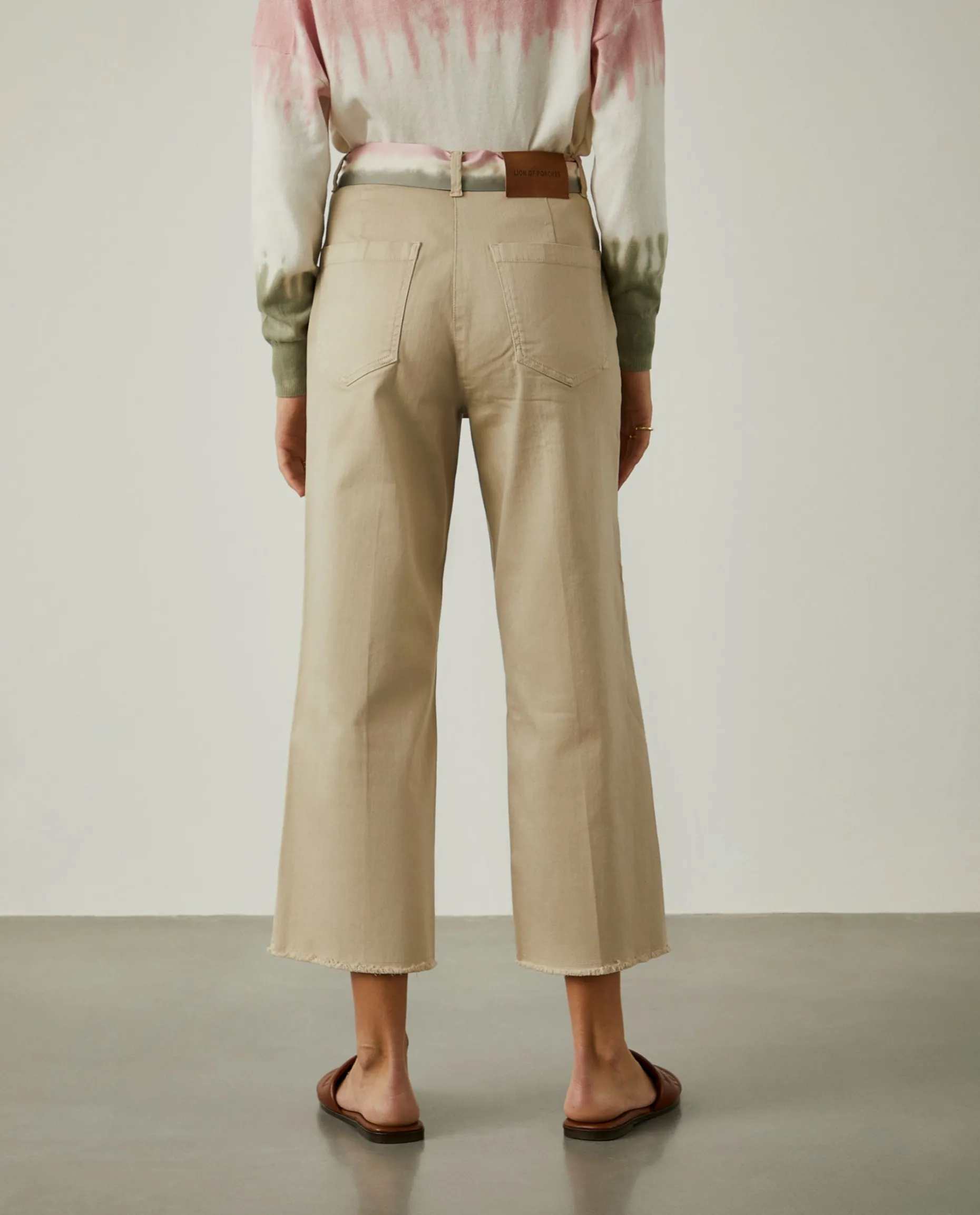 Calças culotte com toque diferenciador de cinto com padrão tie dye. Com cinco bolsos, dois na frente, um deles com bolso para moedas, e dois traseiros. Bainha desfiada. Etiqueta personalizada com branding Lion of Porches na parte de trás. Confecionadas em algodão, com uma pequena percentagem de elastano para conferir maior elasticidade e conforto.