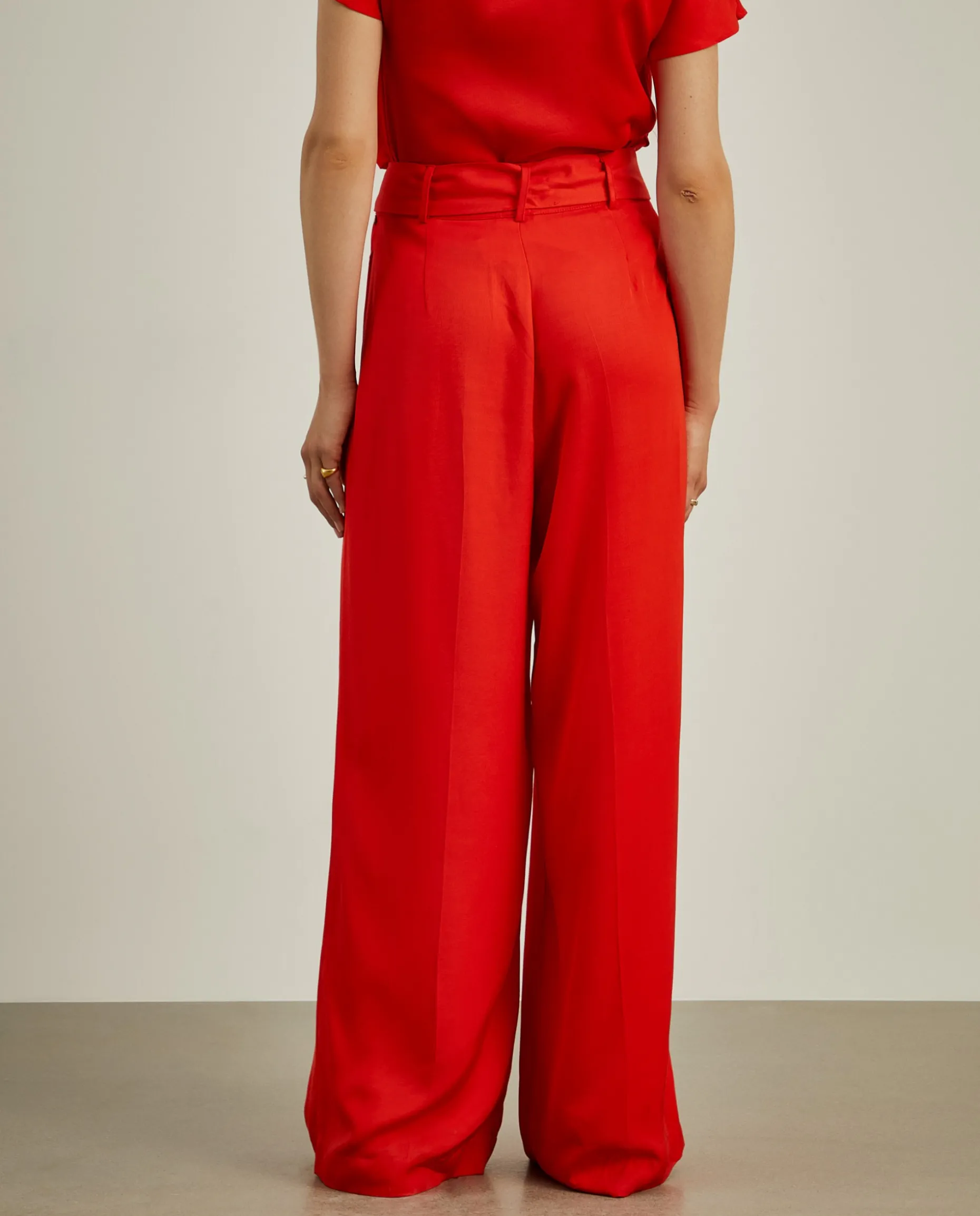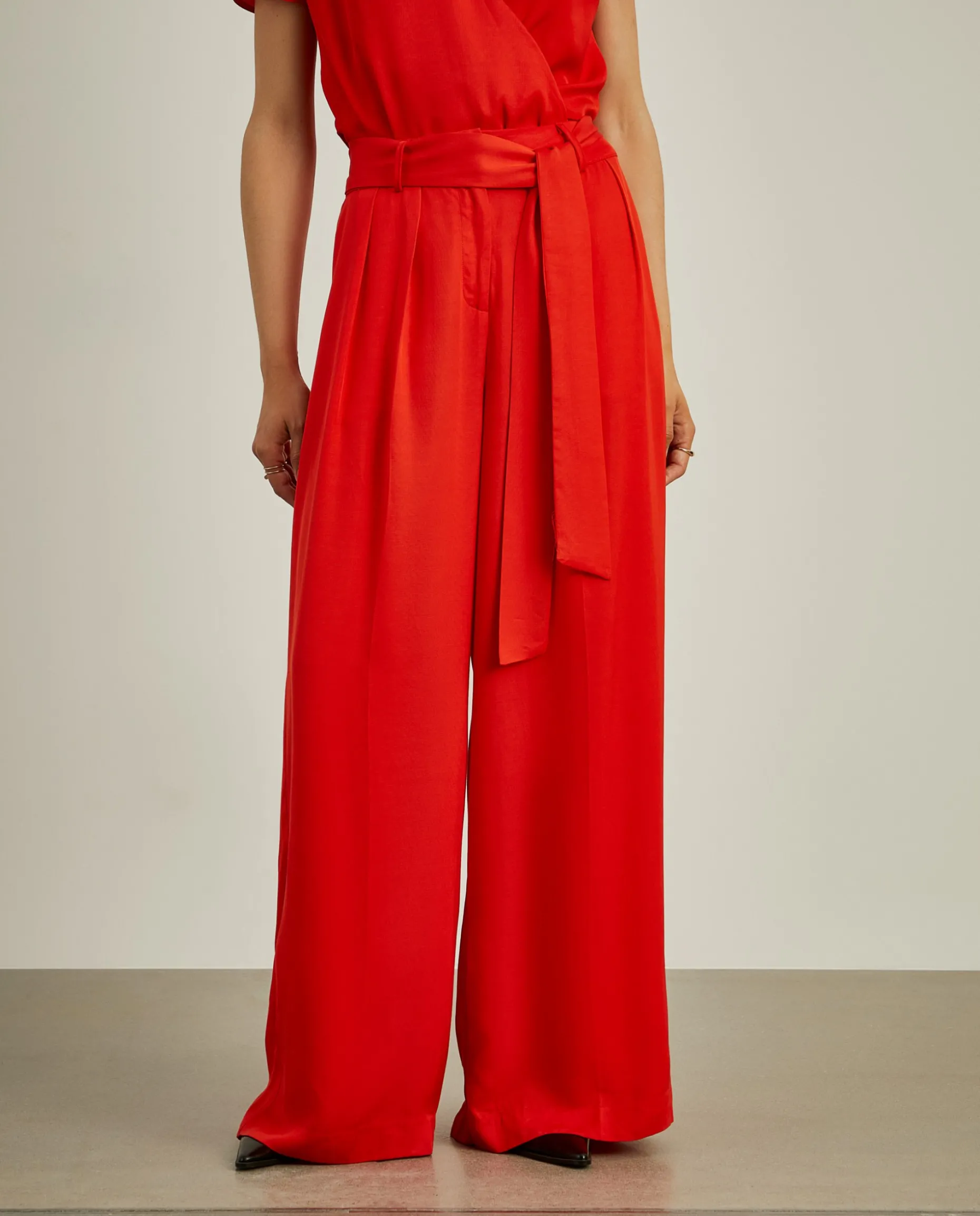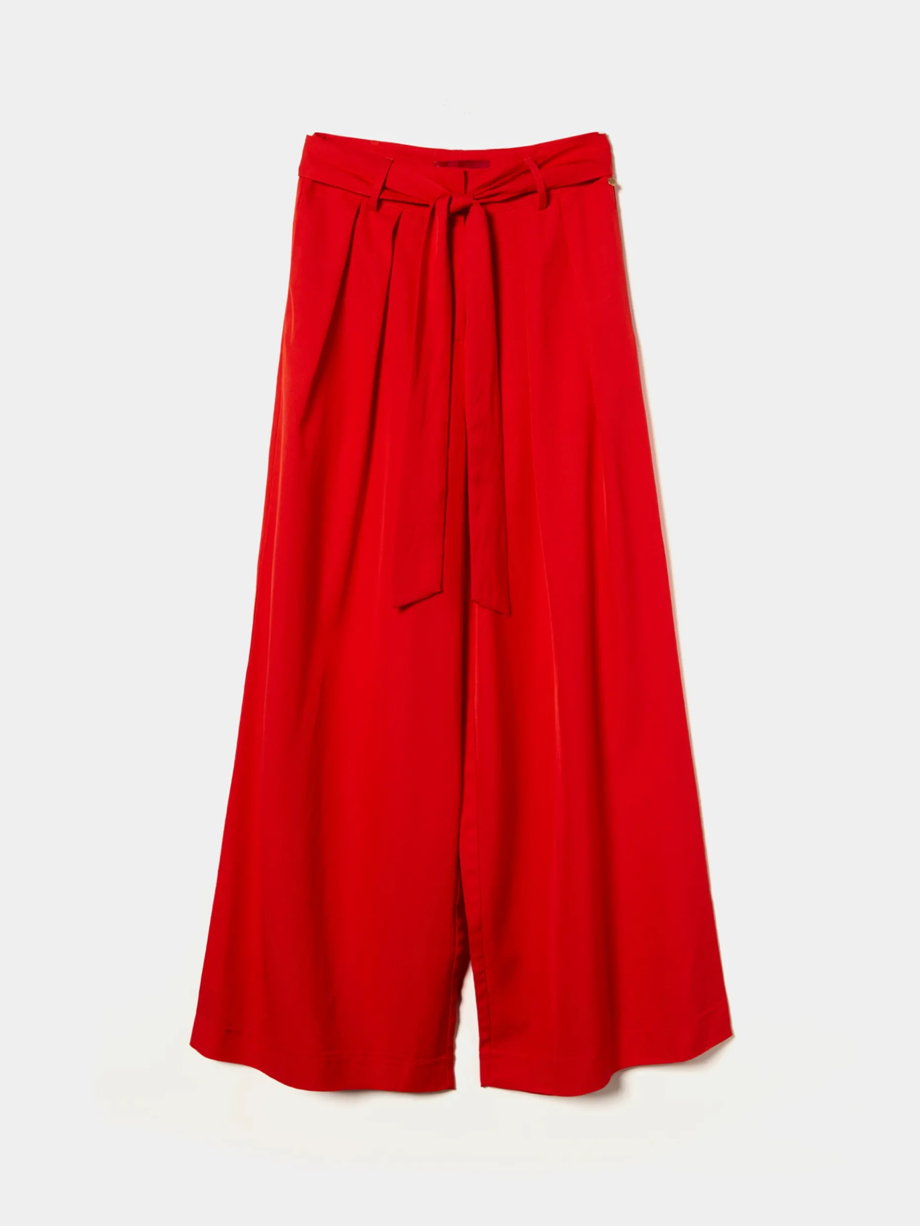 Calças cullote, leves e fluidas, com pregas na frente e cinto em tecido para dar laçada a gosto. Além do cinto, também fecham com botão, guto e fecho de correr ocultos por carcela. Uma escolha versátil e elegante, adaptando-se facilmente a várias ocasiões, consoante a conjugação. Para um total look, veja também a blusa da mesma coleção.