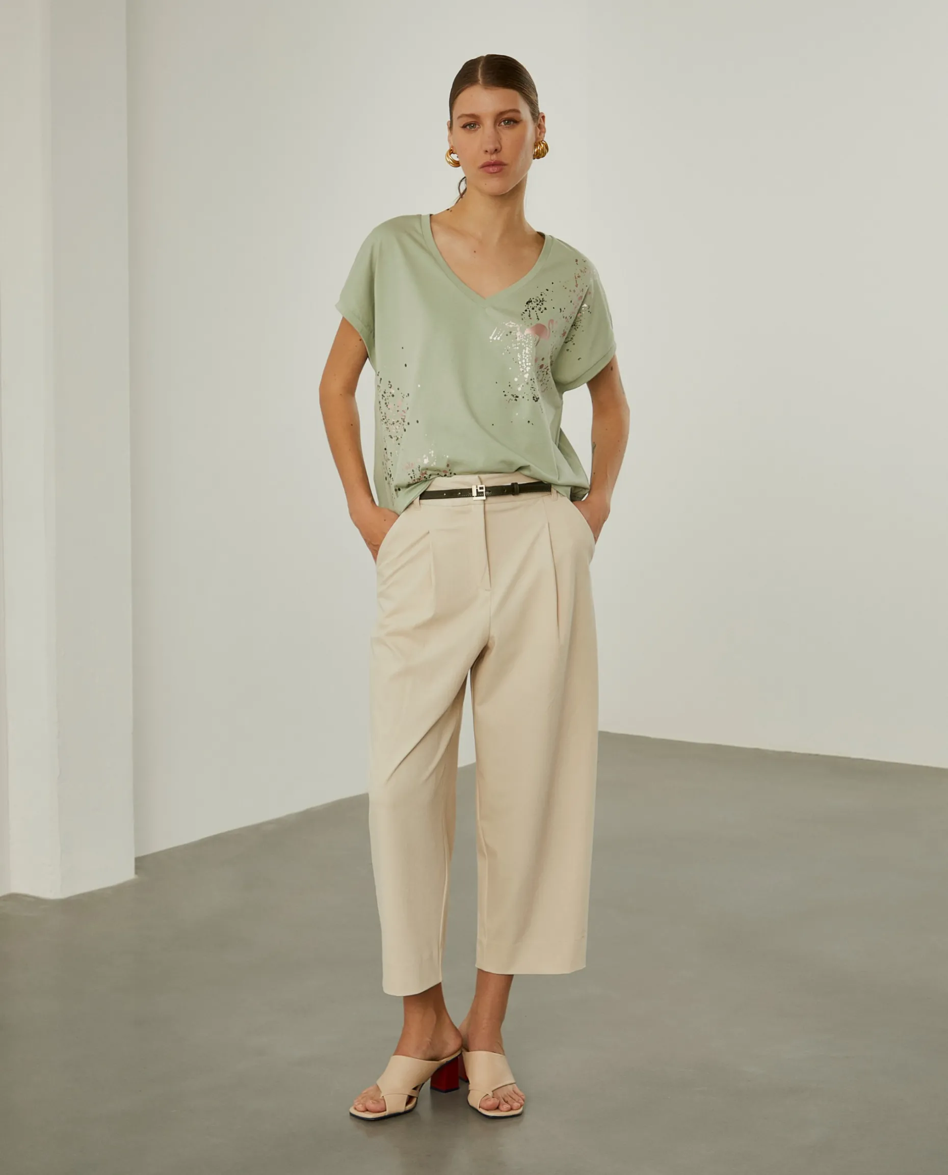Calças de fit largo com pregas na frente. Com bolsos laterais e traseiros.