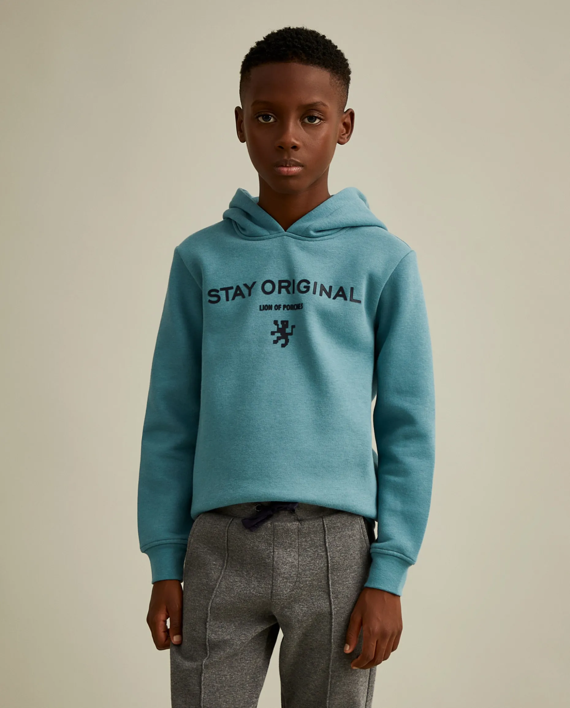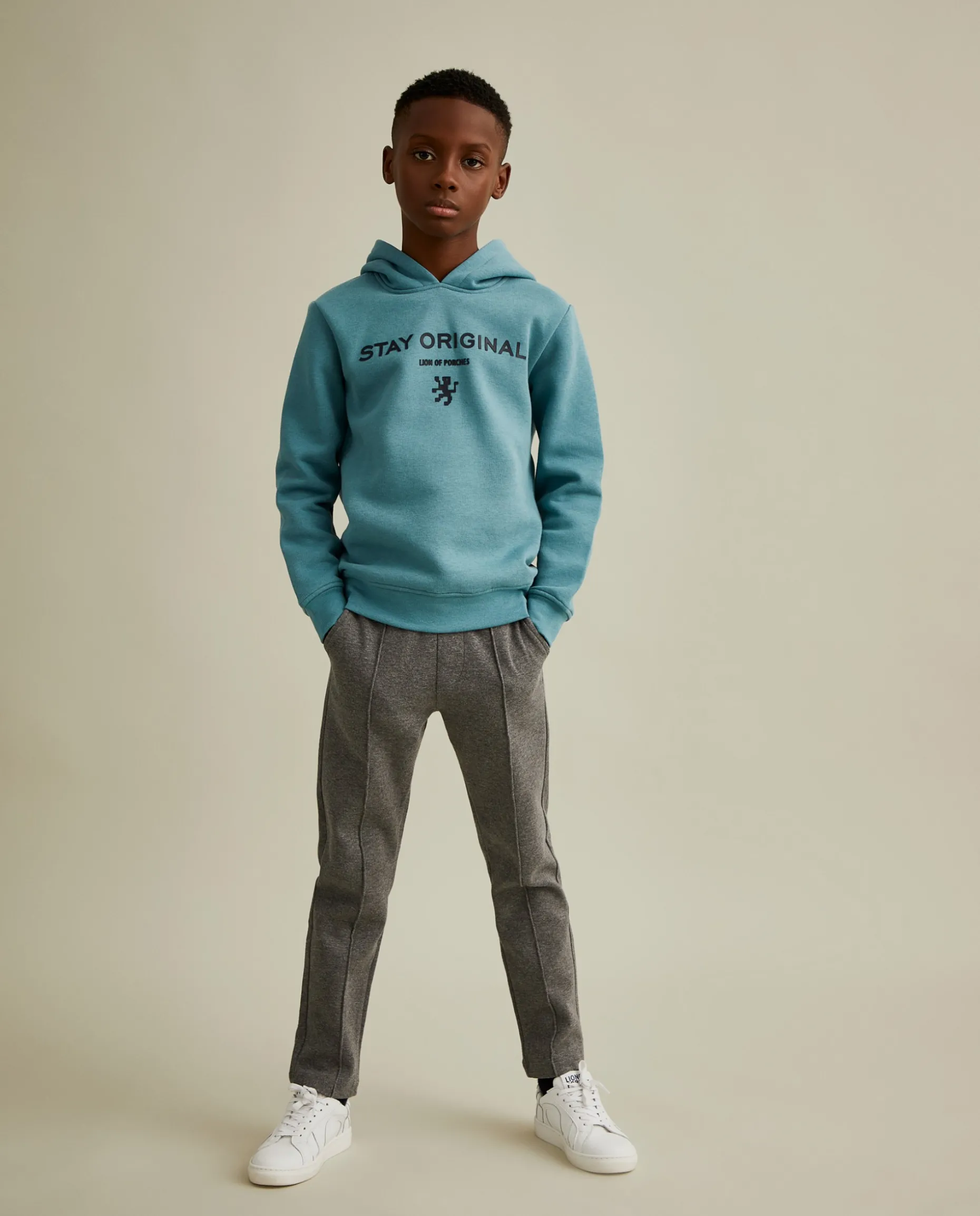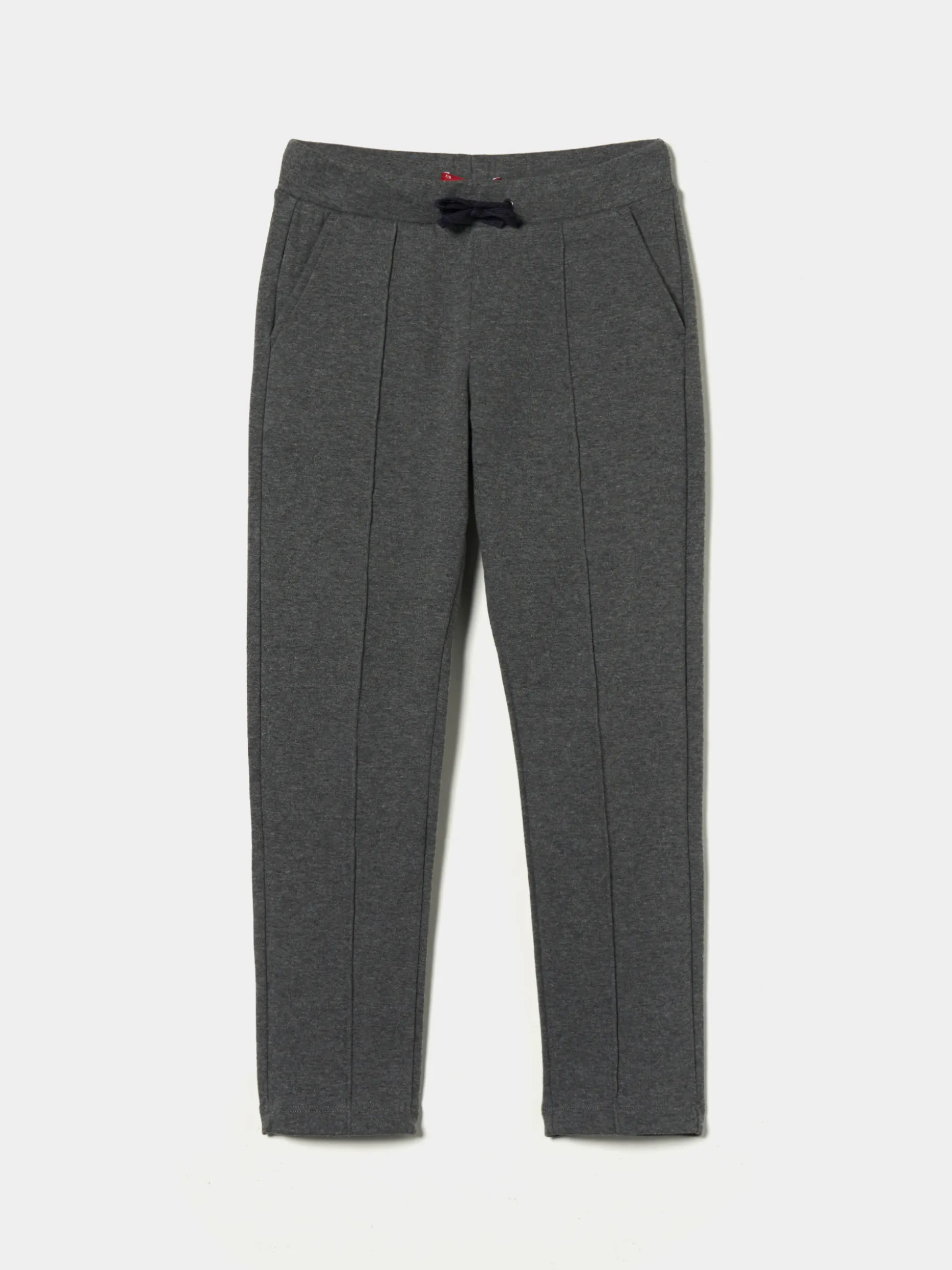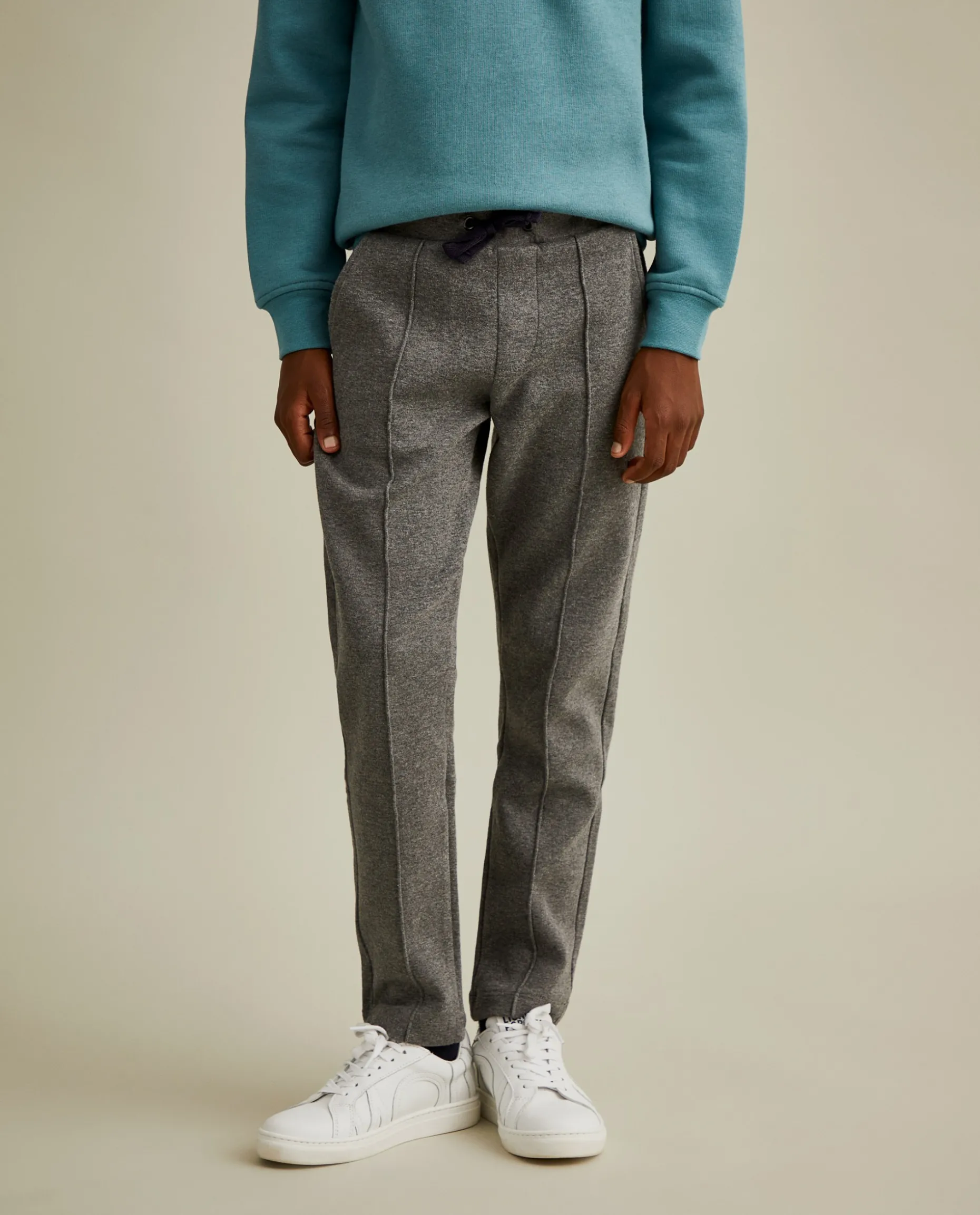 Calças de malha com nervura na frente para um look de menino confortável, mas elegante. Apertam na cintura com cordões em contraste de cor. Com bolsos laterais e bolso traseiro com bordado Lion of Porches em contraste.