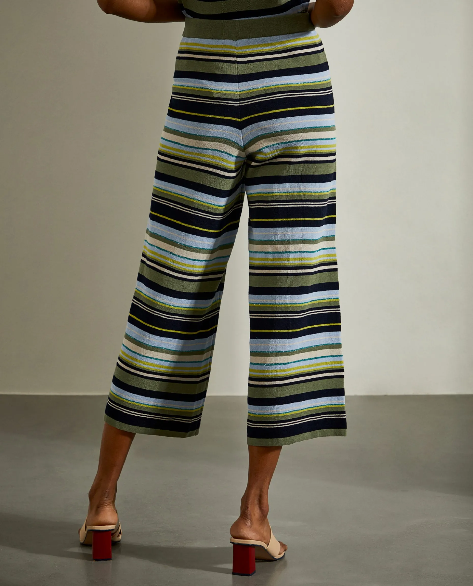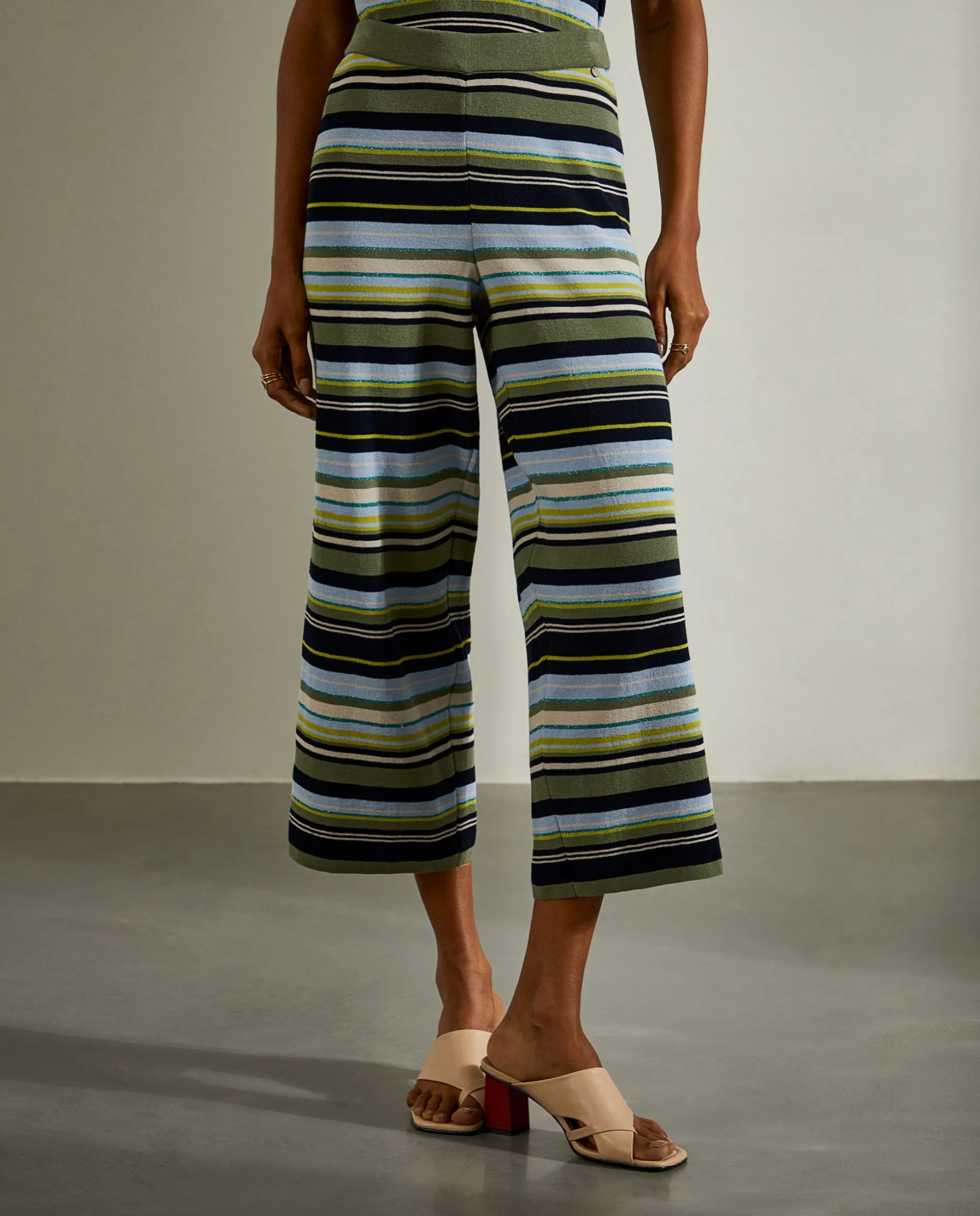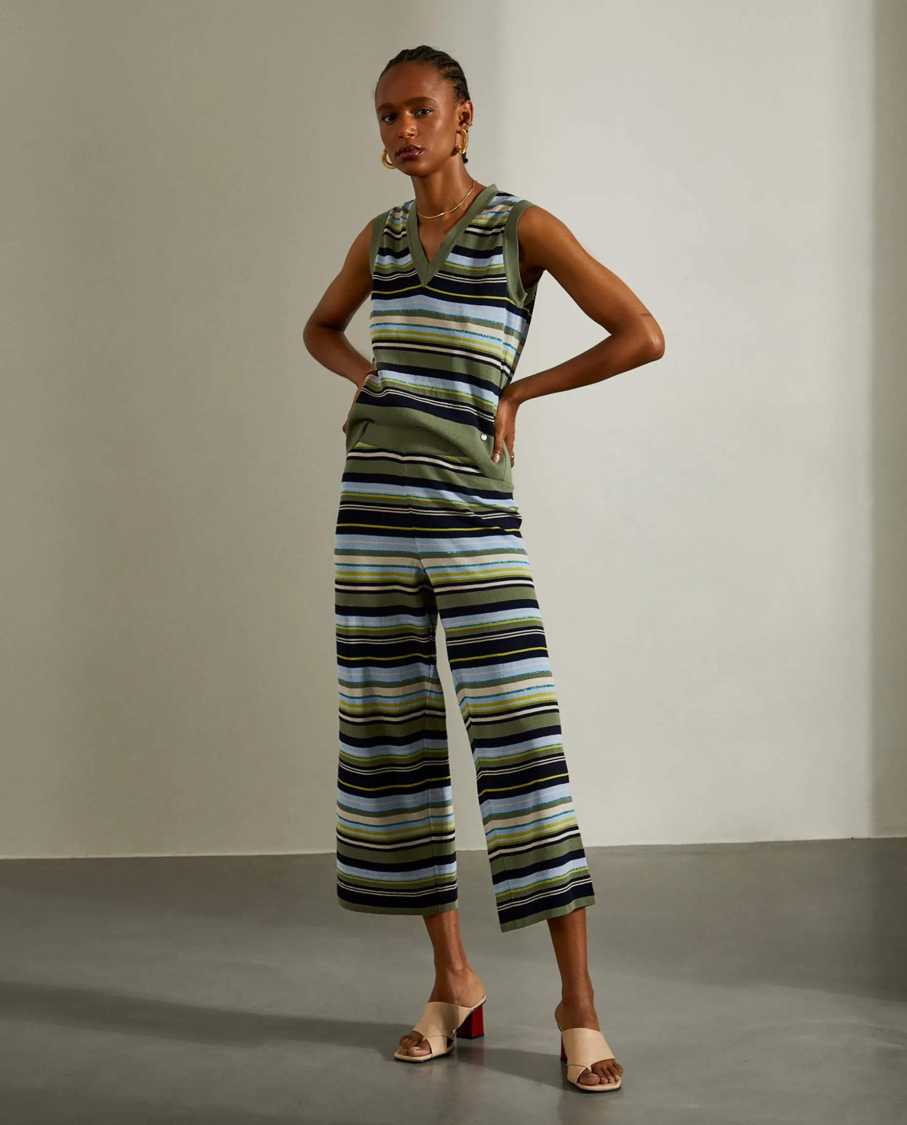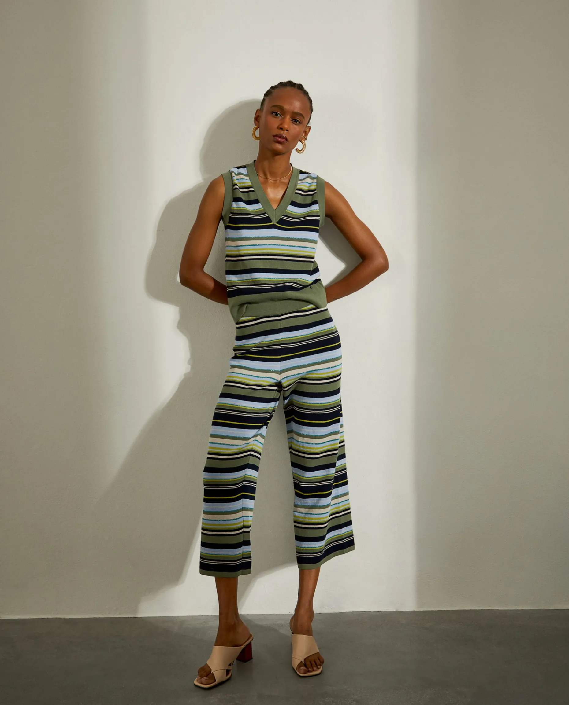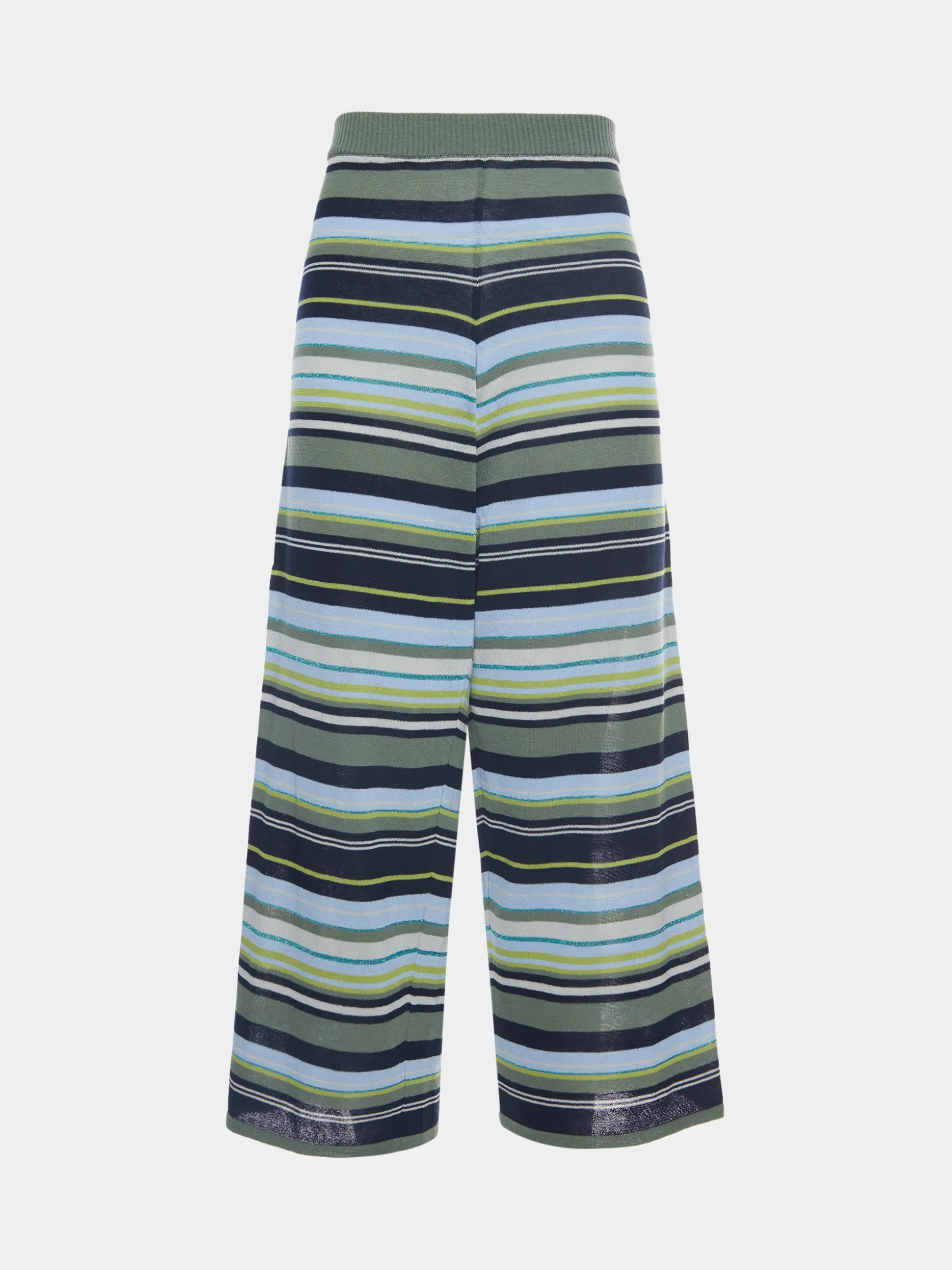 Calças de malha tricotada de riscas. Com colete e casaco a combinar em total look.