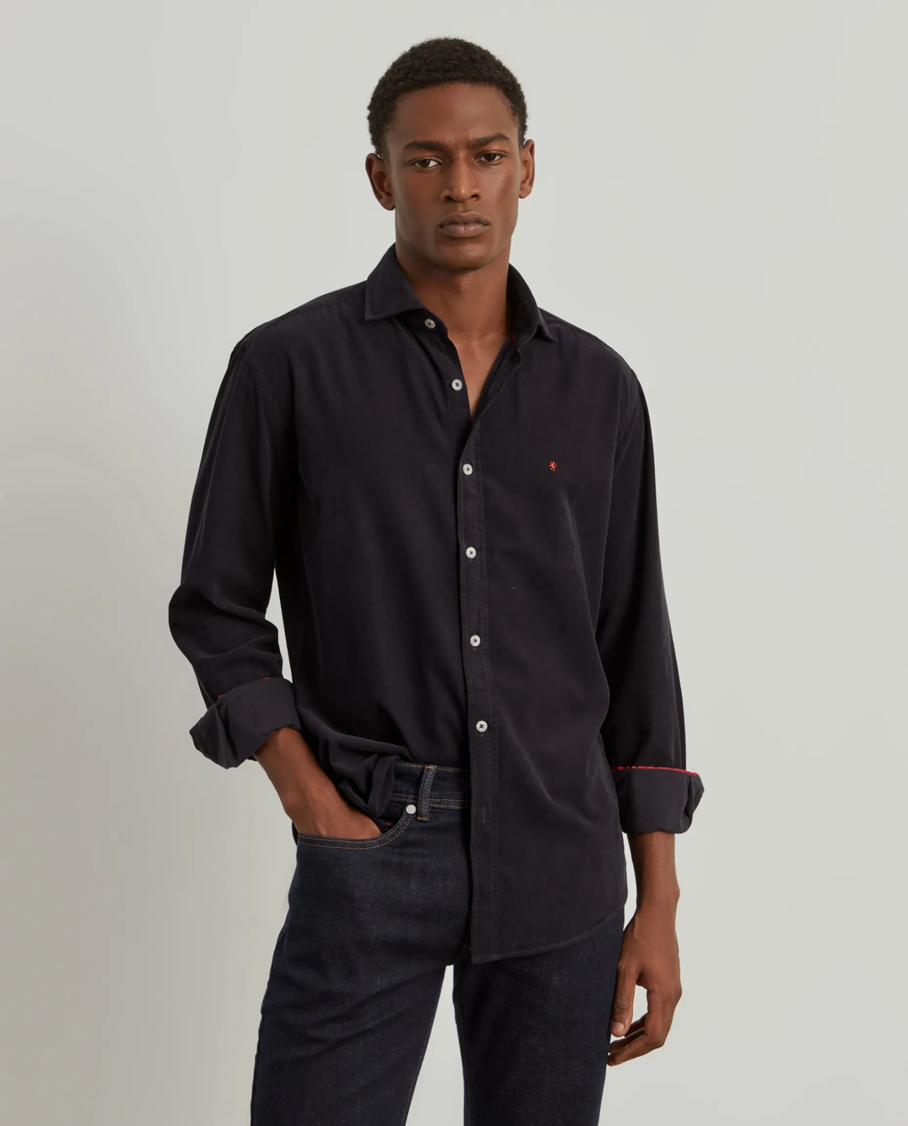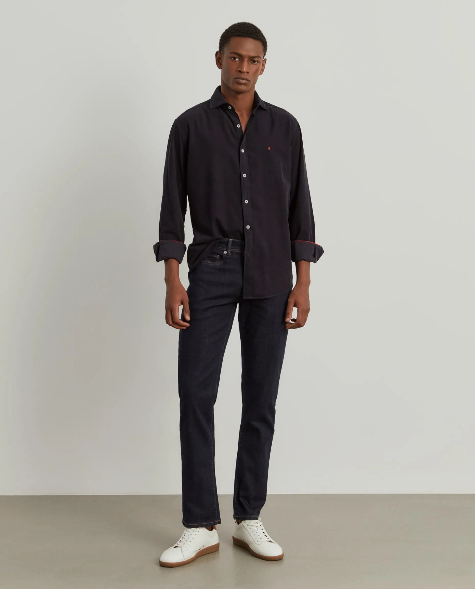 Calças denim, corte regular fit, de lavagem escura. Tem cinco bolsos: três na frente (um deles para moedas) e dois traseiros. A costura é em contraste e aperta com botão e fecho de correr oculto por carcela. Finaliza com etiqueta Lion of Porches na parte de trás do cinto. São confecionadas em algodão com uma pequena percentagem de elastano para maior liberdade de movimento.