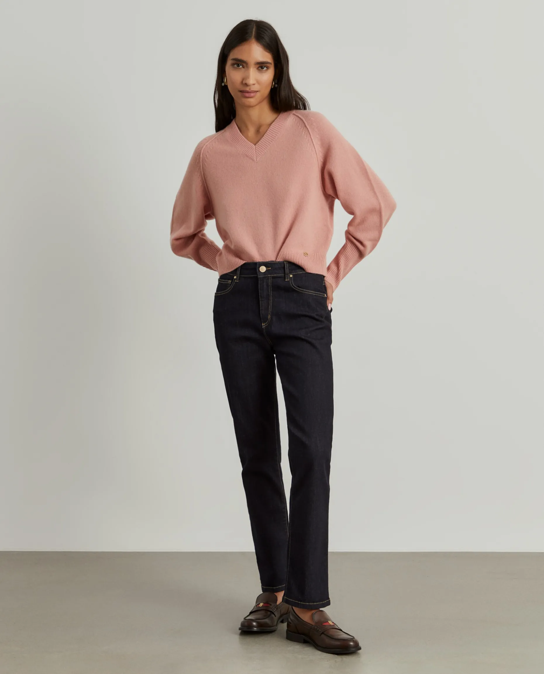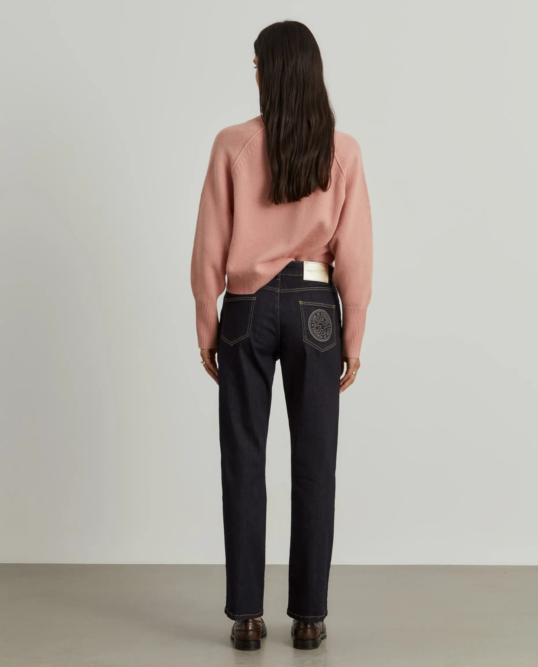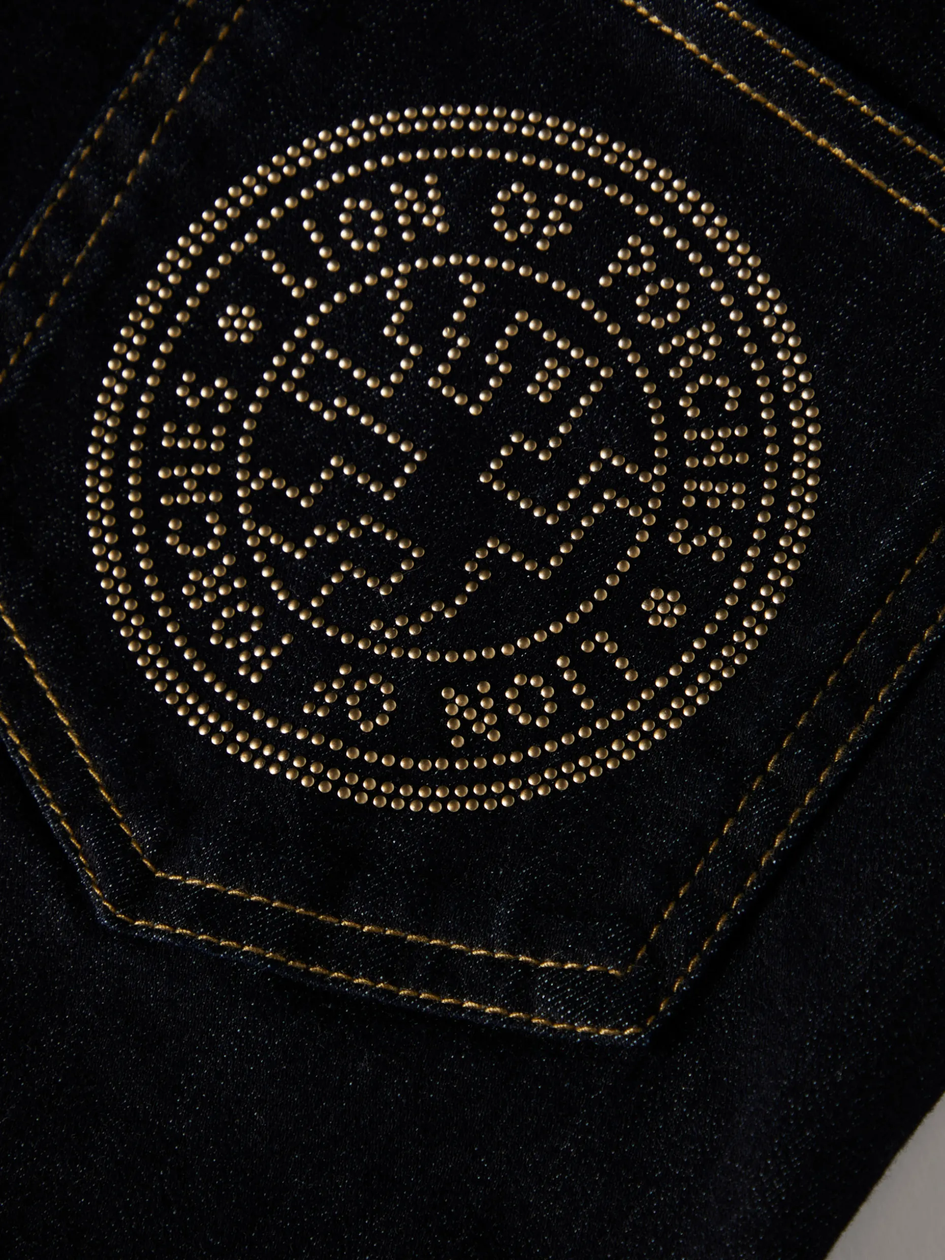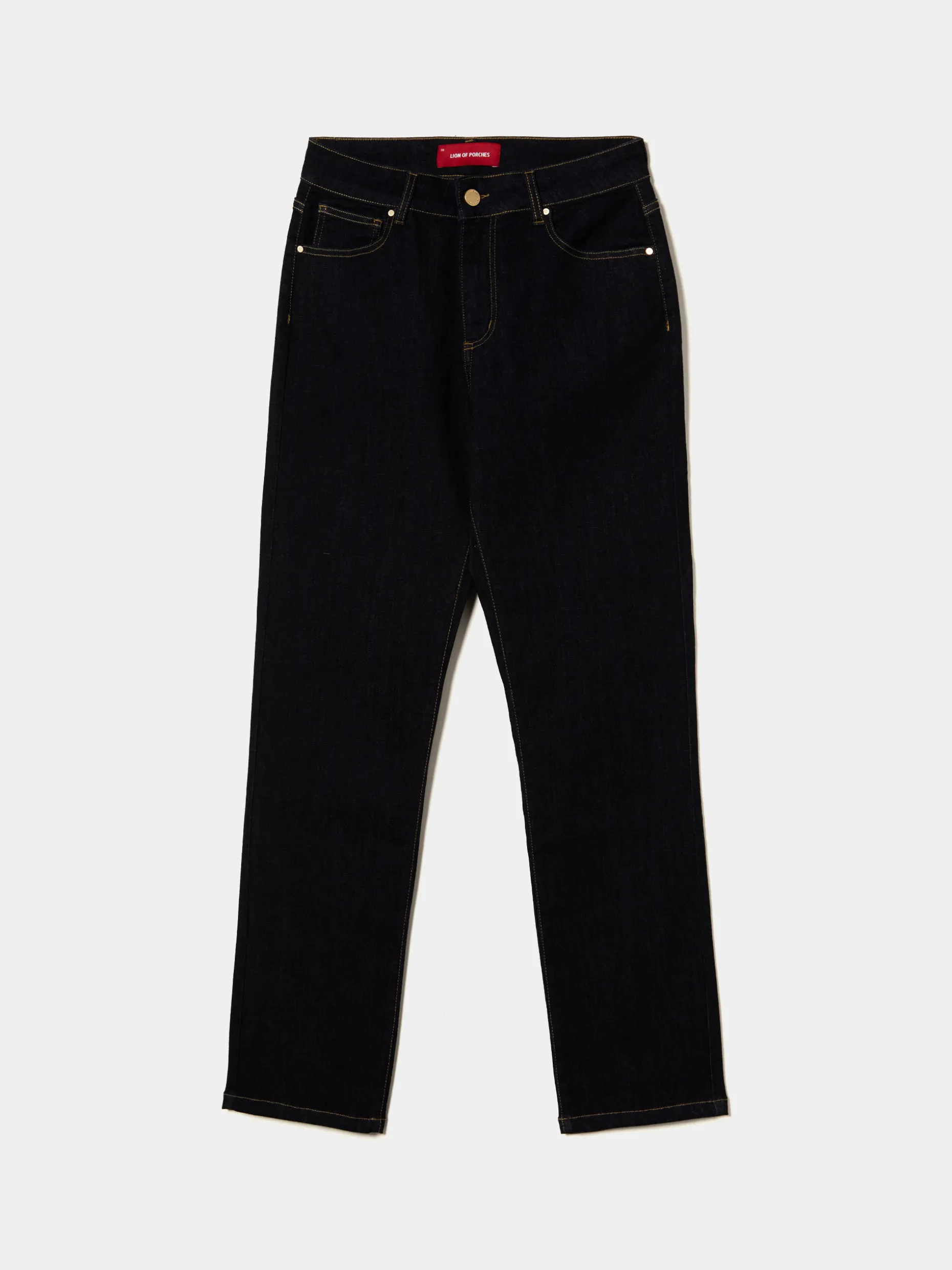 Calças denim, regular fit, de lavagem escura. Apertam com botão e fecho de correr oculto por carcela. São compostas por cinco bolsos: três na frente (um deles pequeno para moedas) e dois traseiros. A costura é em contraste de cor. Finalizam com logotipo Lion of Porches num dos bolsos traseiros.