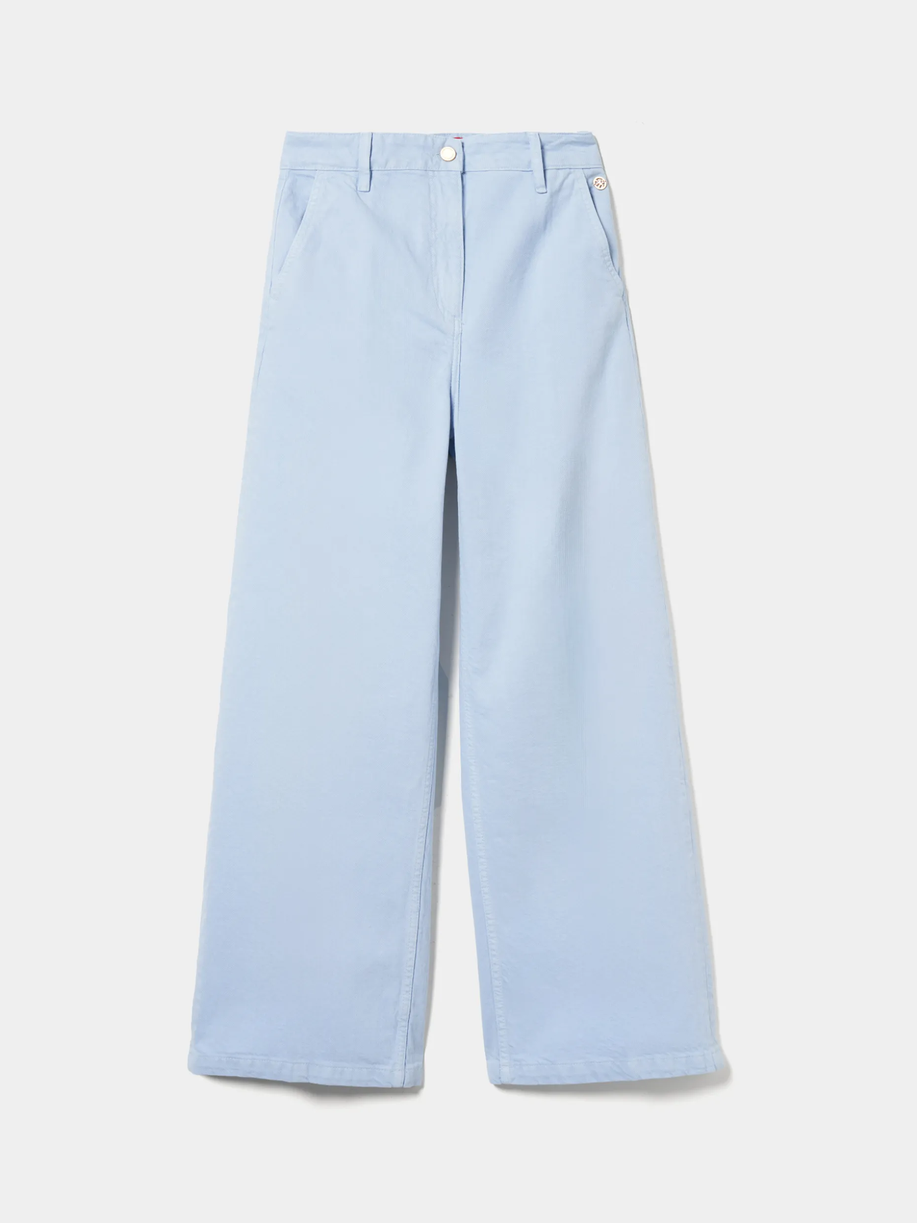 Conforto e estilo com estas calças de ganga vincadas, de perna larga. Com aperto através de botão e fecho zíper oculto. Finalizam com bolsos laterais e bolsos traseiros.